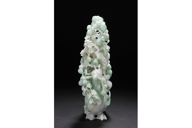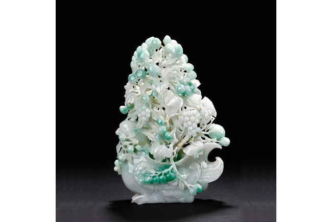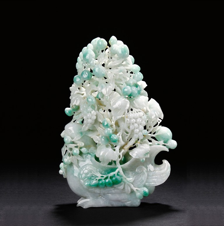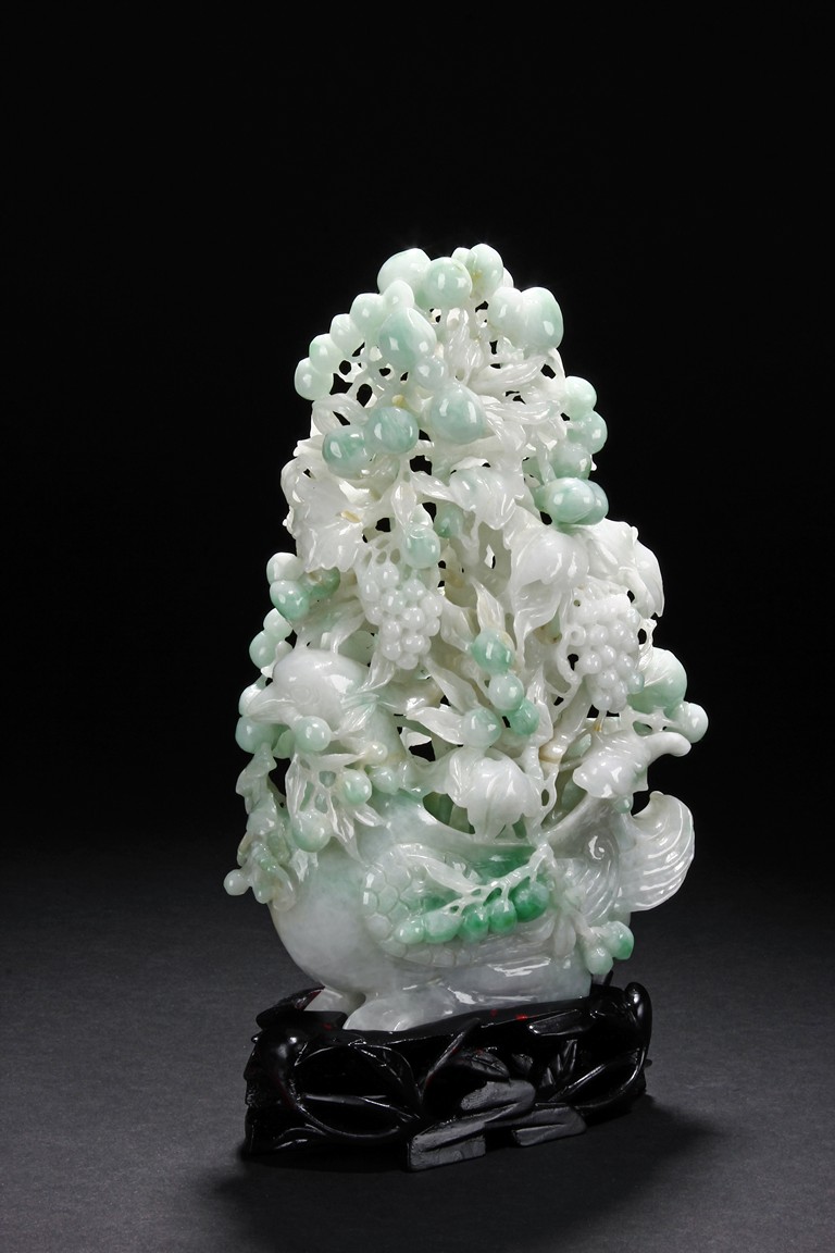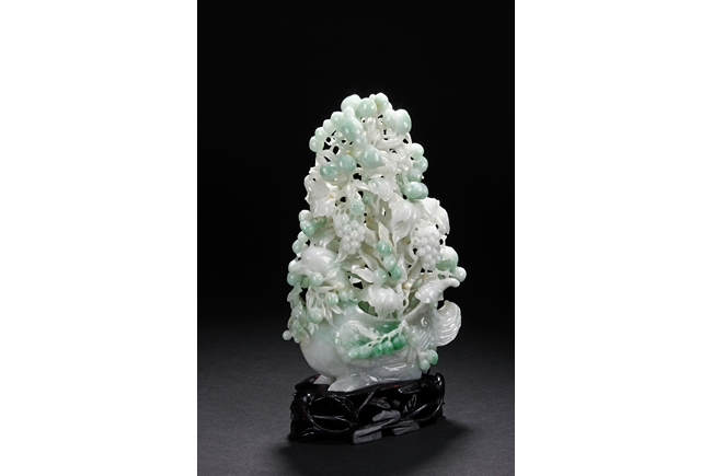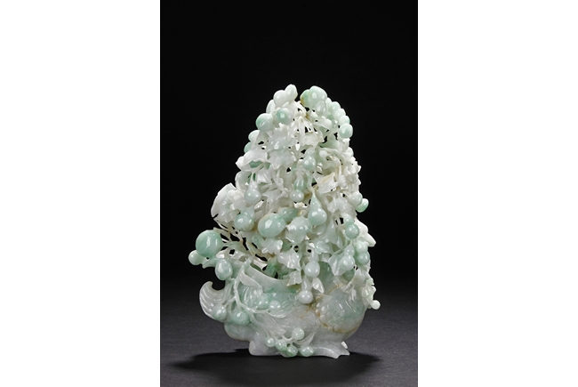 The jadeite boulder is carved and pierced with a seated magpie carrying on the back with blossoming peaches and double gourds on either side. The stone is of white-greenish tone.