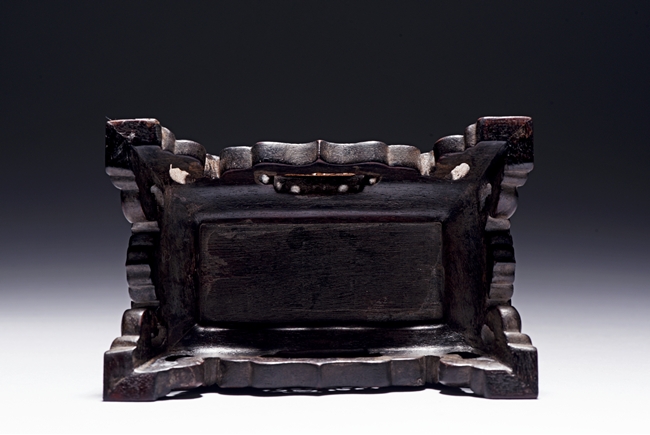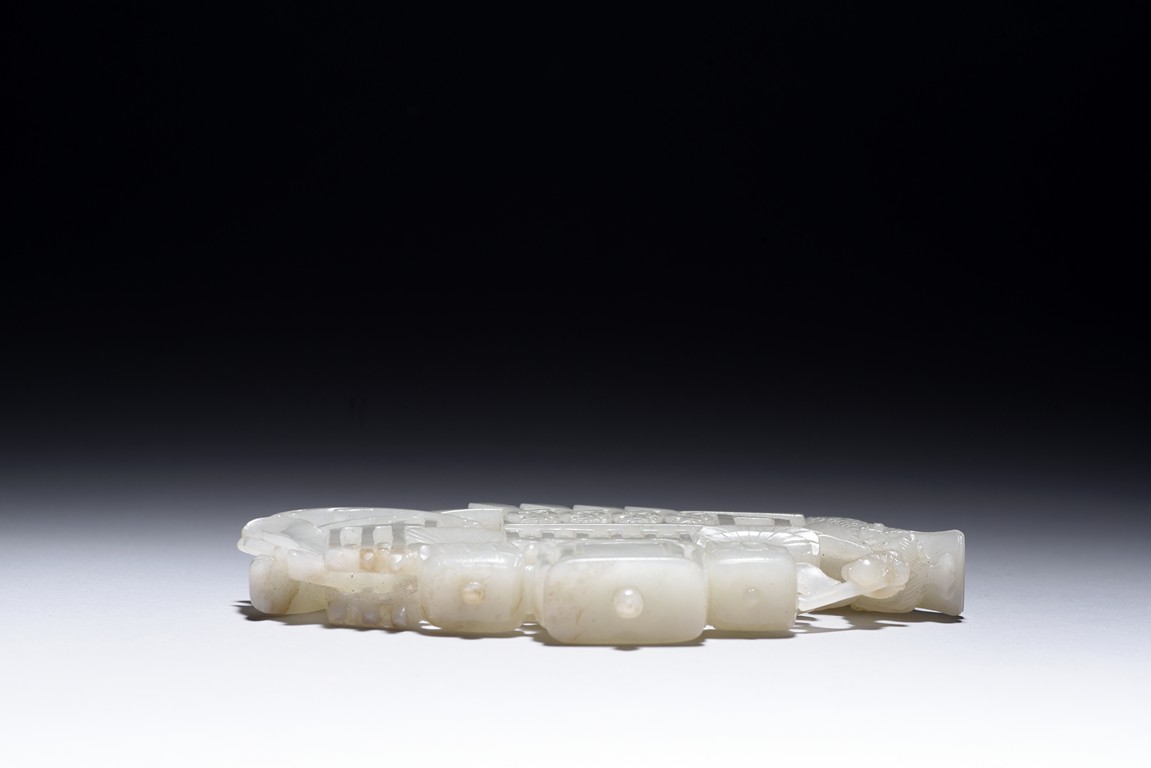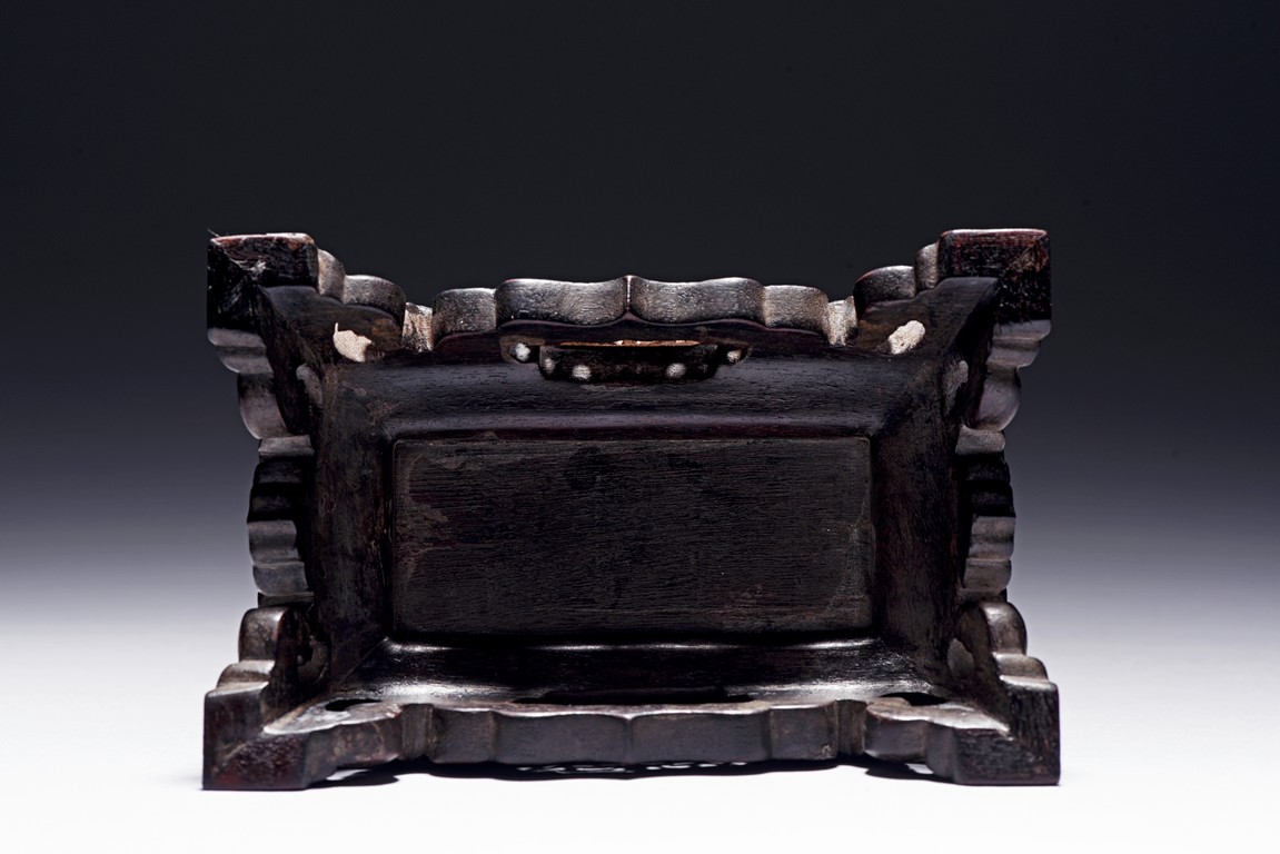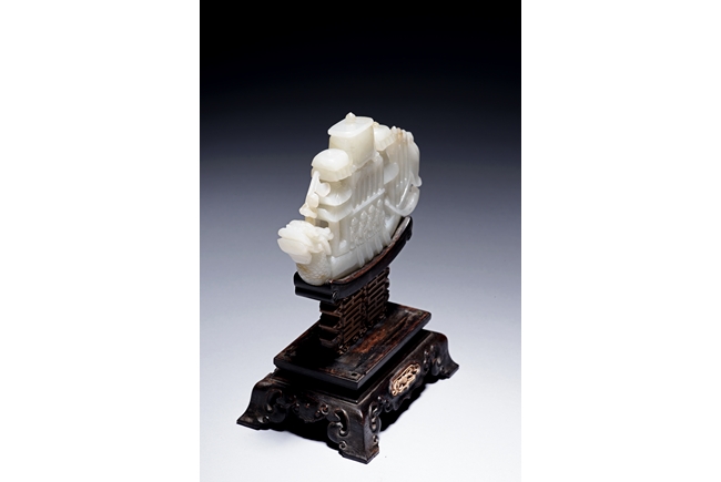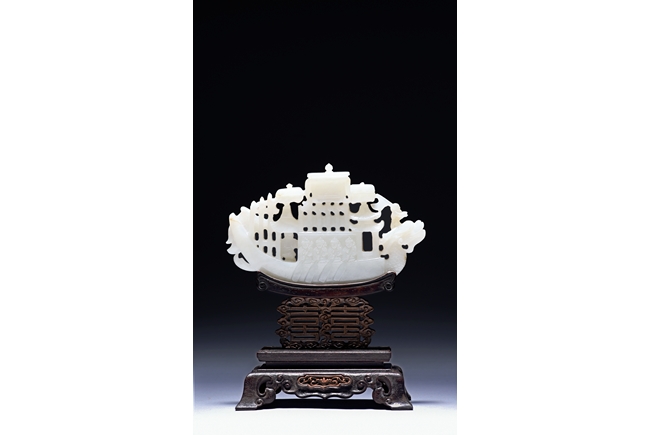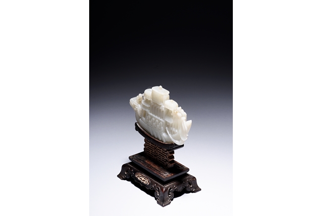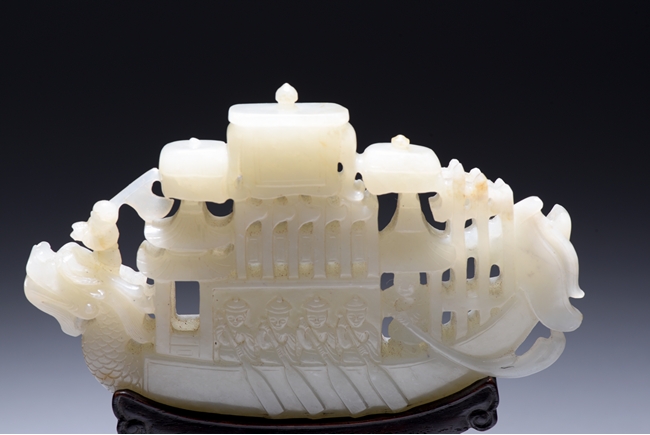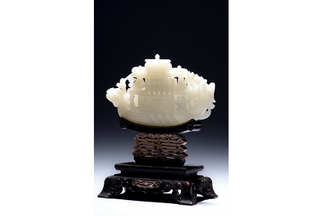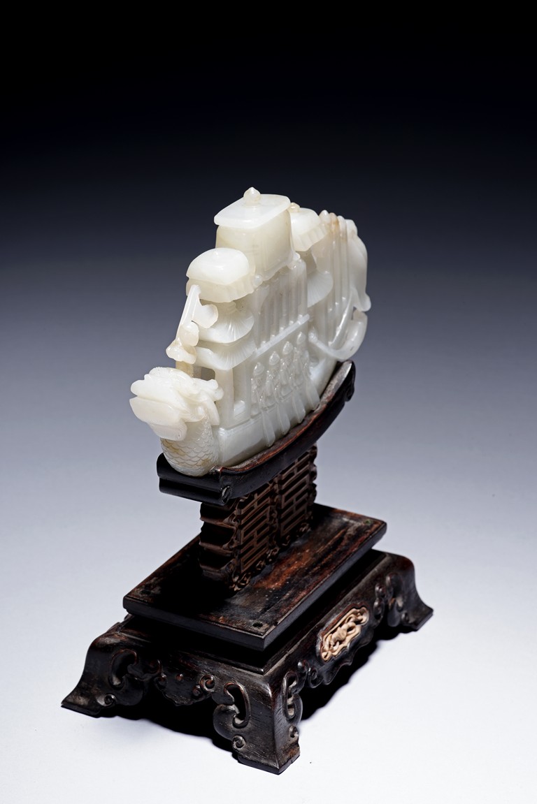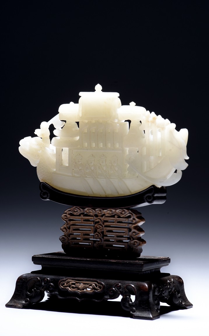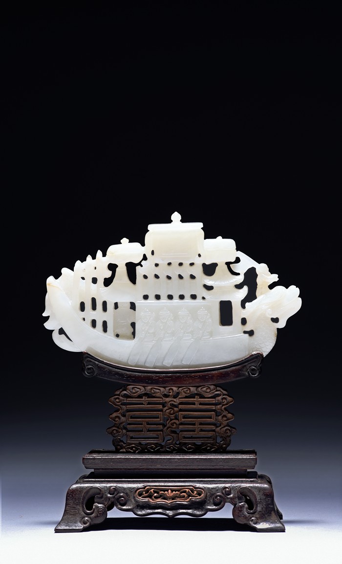 The jade is finely carved and pierced dragon-headed prow , powerd by nine oarsmen along the sides, and one end with a figure waving a flag, all supported on zitan wood stand reticulated with double 'xi' character figures. The stone is of even white tone. Qing Dynasty period.