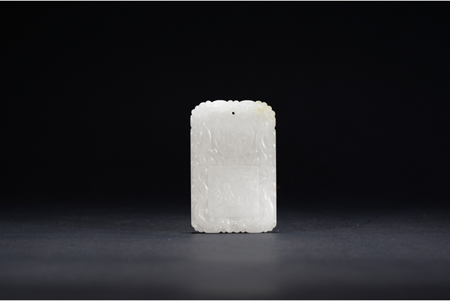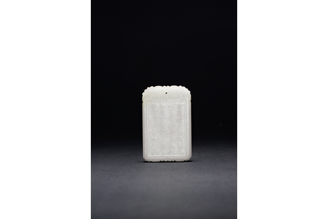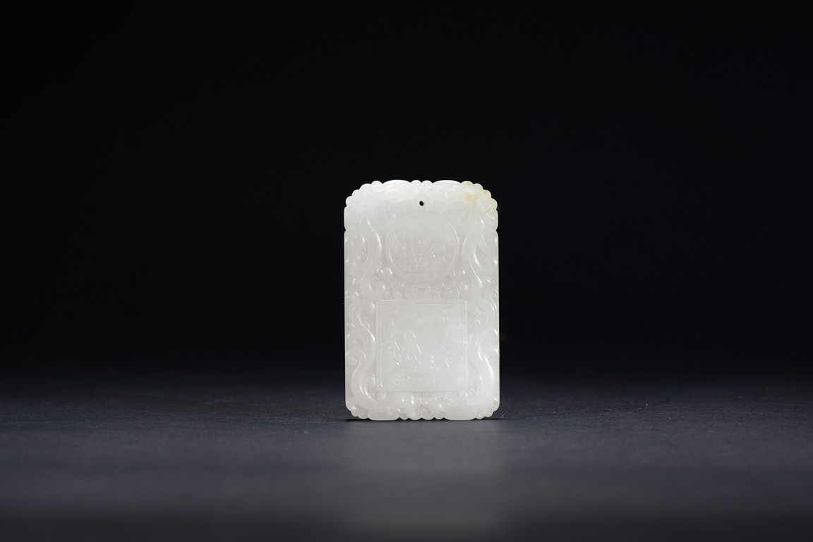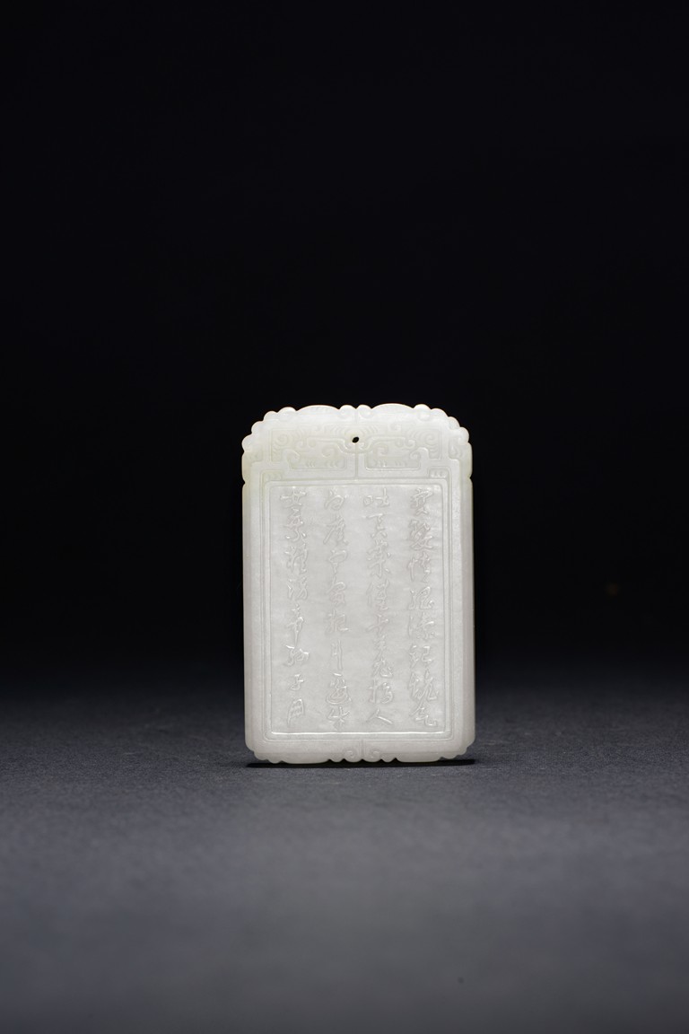 The rectangular plaque is finely carved to one side in shallow relief with figures within square and circular medallion, flanked by two sinuous and scrolled chilong; the reverse carved with poem in running script. The stone is of even white tone.Qing Dynasty period.