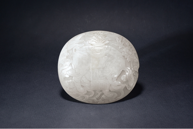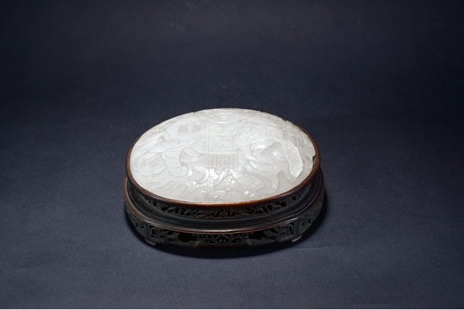 The exterior finely carved with an elephant with head turned to the side, the back supporting a flower vase, surrounded by auspicious clouds and flowers. The stone is of smooth even white tone, accompanied with an carved hongmu stand. Qing Dynasty period.