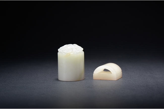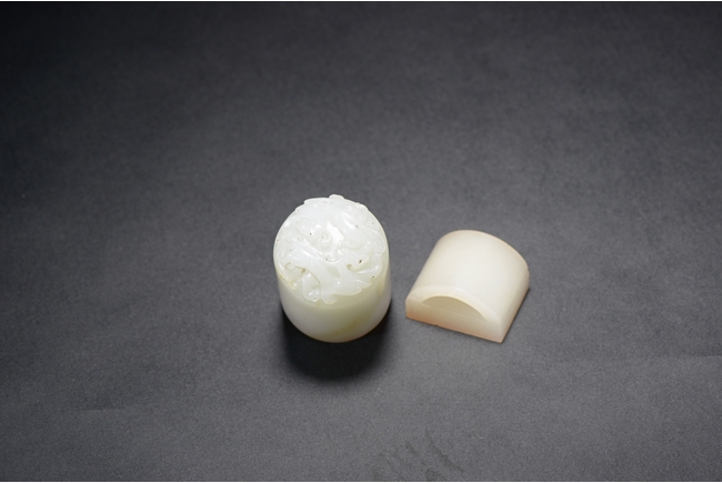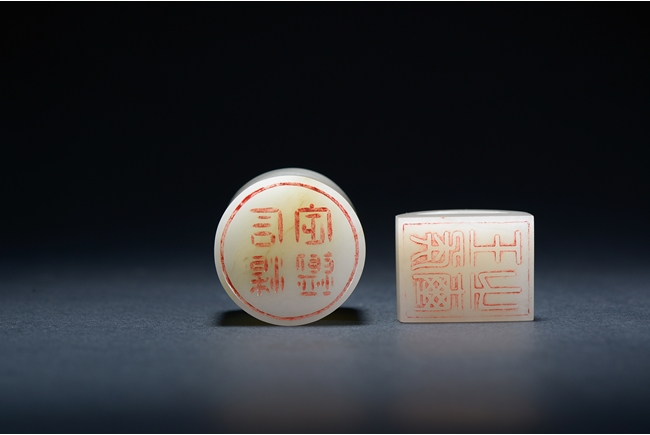 Comprising of an cylindrical seal topped with sinuous mythical beast finial, the seal surface carved with four character within a circle; and a rectangular seal topped with pierced arched handle, the seal surface carved with four characters in seal script. Qing Dynasty period.