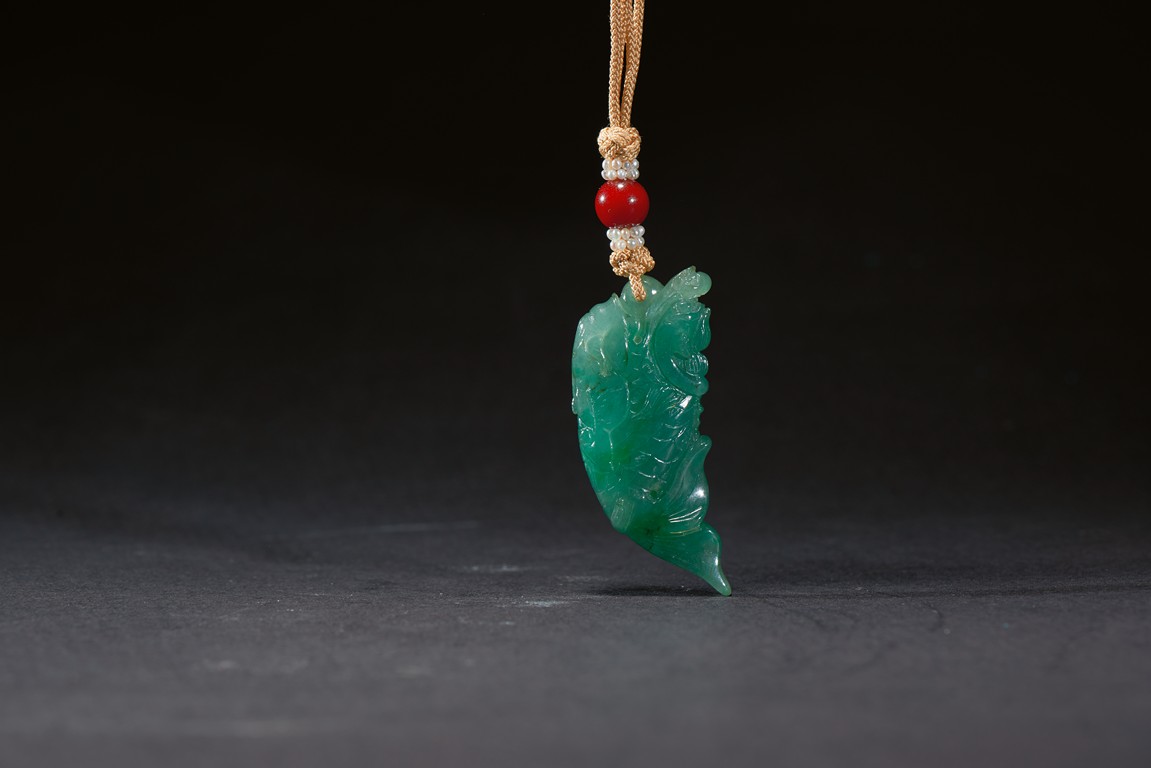 Modelled in the form of a carp, the scales finely detailed, with tail swept to the side. The stone is of very good translucency and rich green tone.
