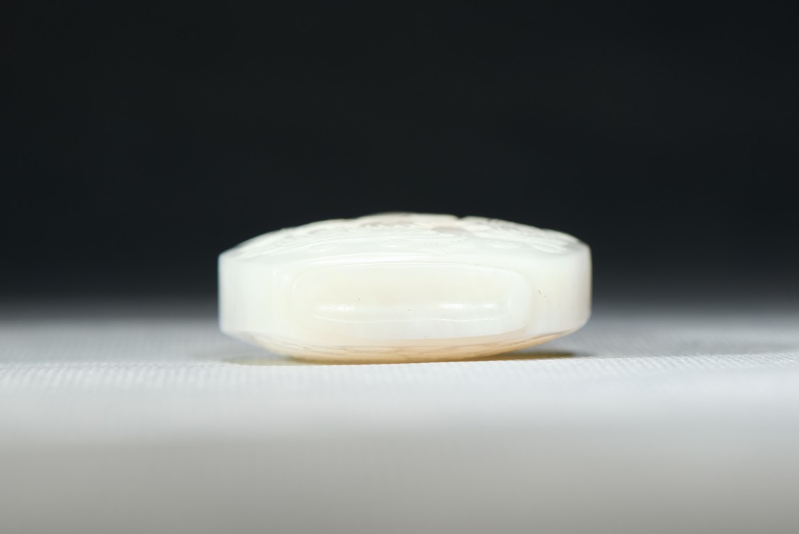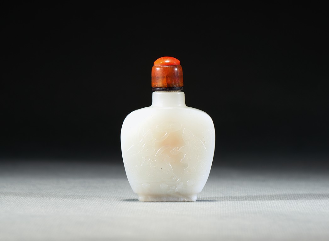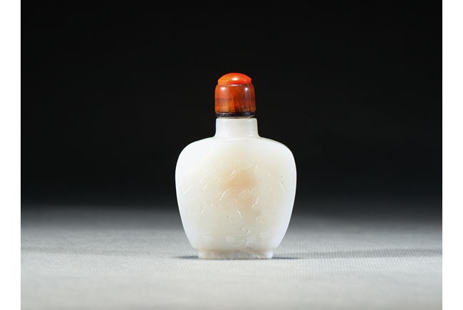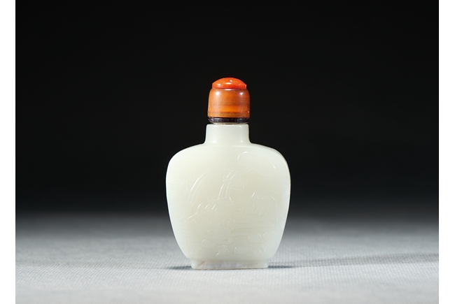 Rising to high shoulders, the snuff bottle carved in shallow relief with two mandarin ducks swimming in lotus pond, with agate stopper. The stone is of even white tone. Qing Dynasty period.