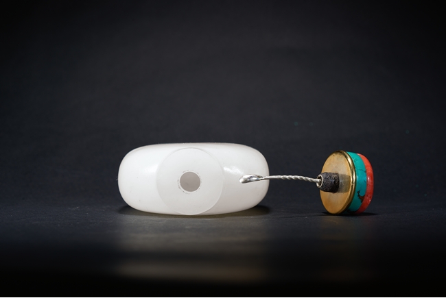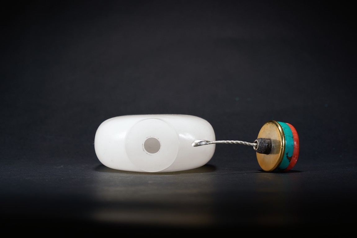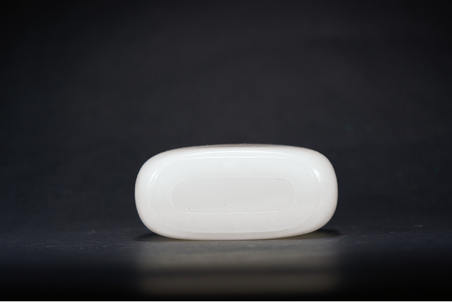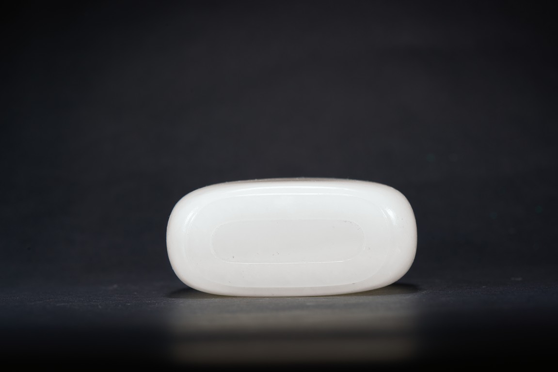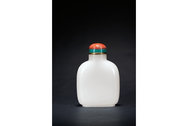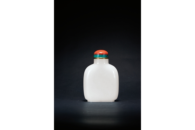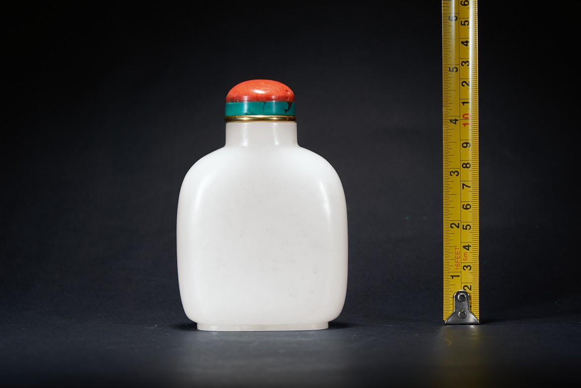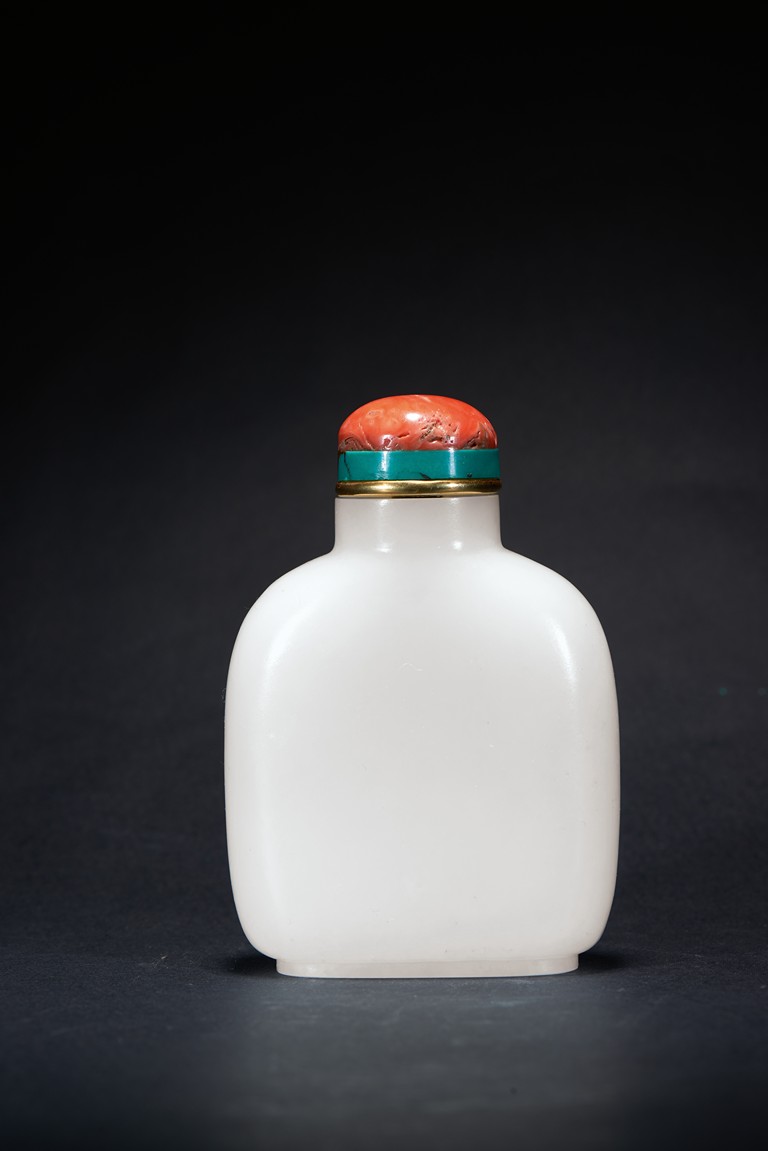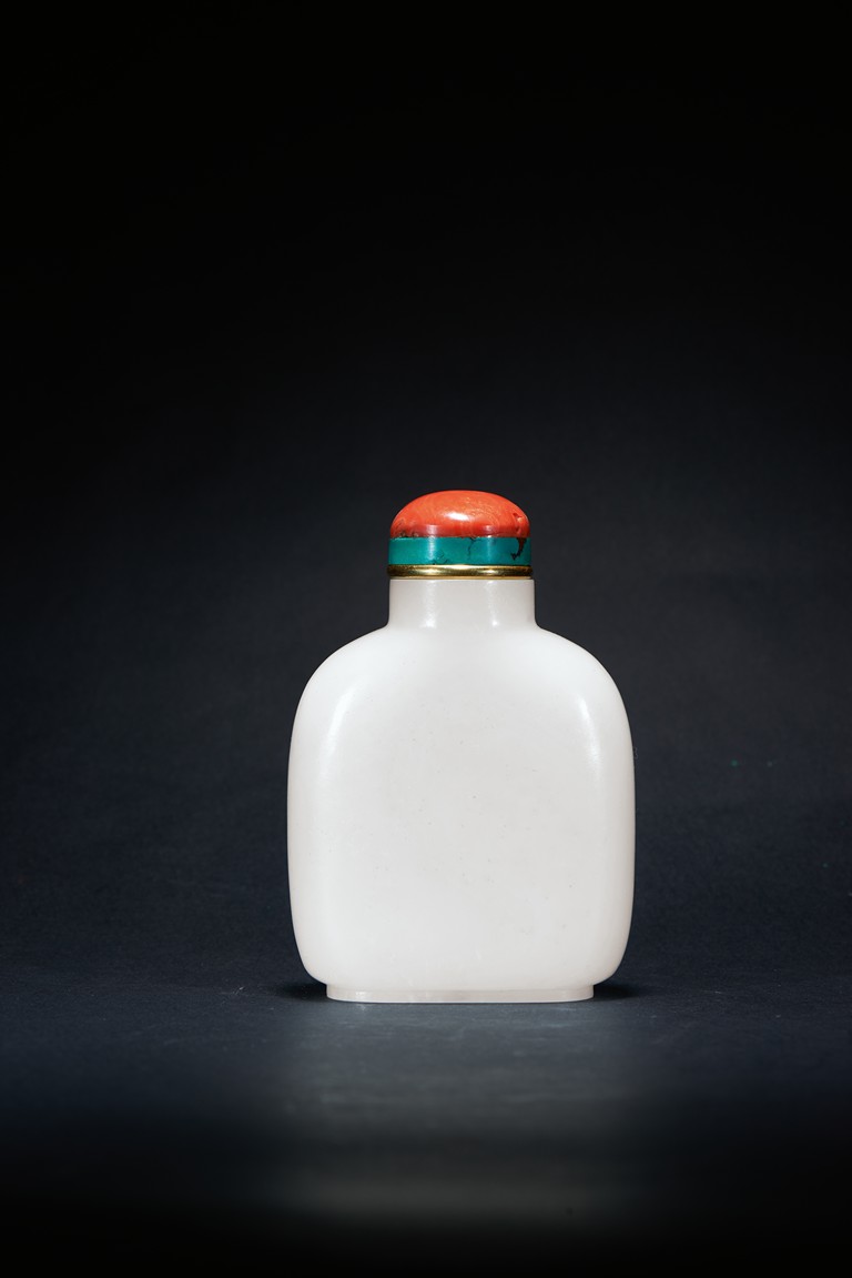 Of rounded rectangular form, the snuff bottle rises on oval foot ring, the stone is of even smooth 'ram fat' white tone. Accompanied with a domed coral and turquoise stopper. Qing Dynasty period.