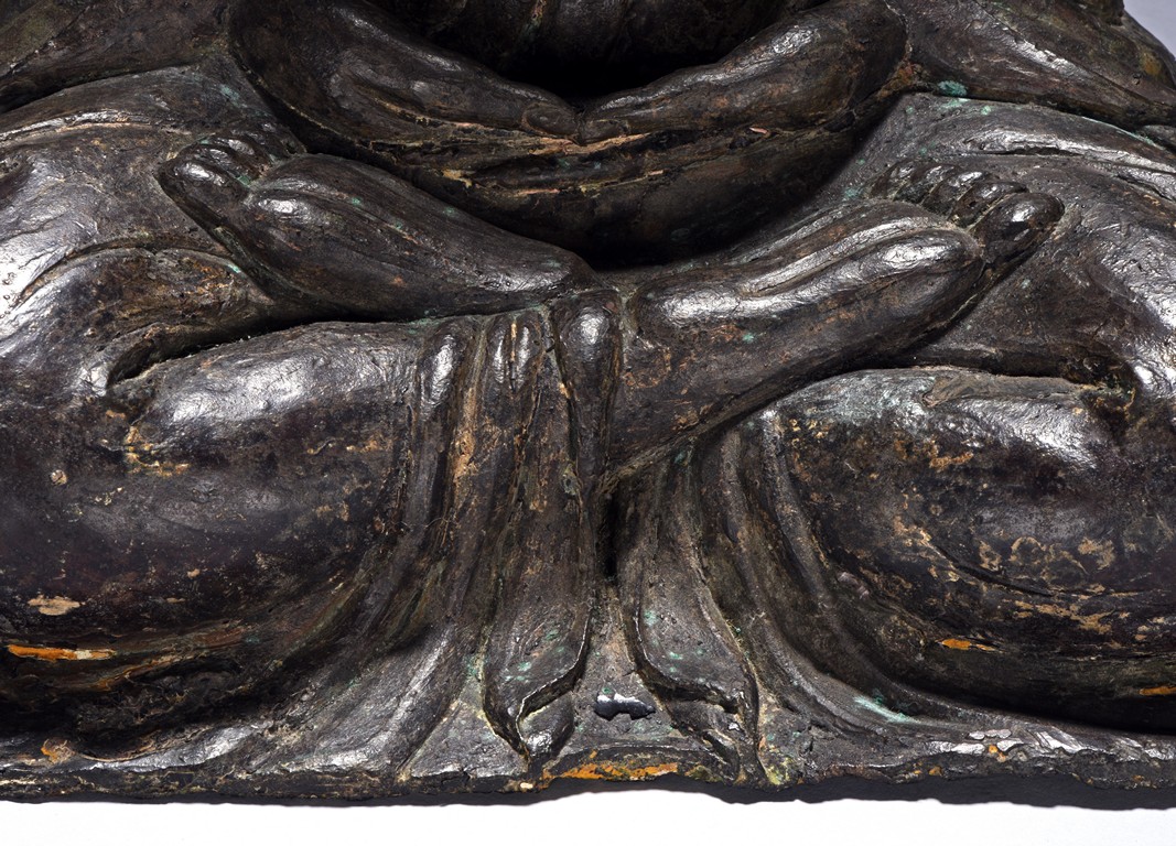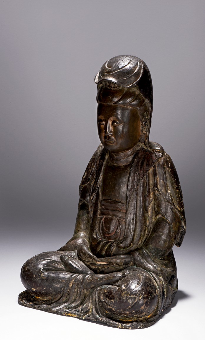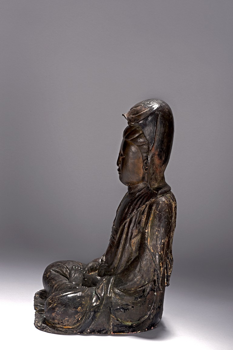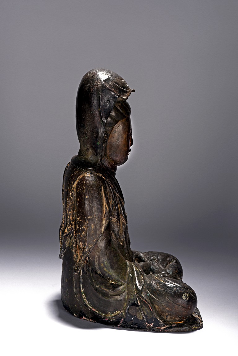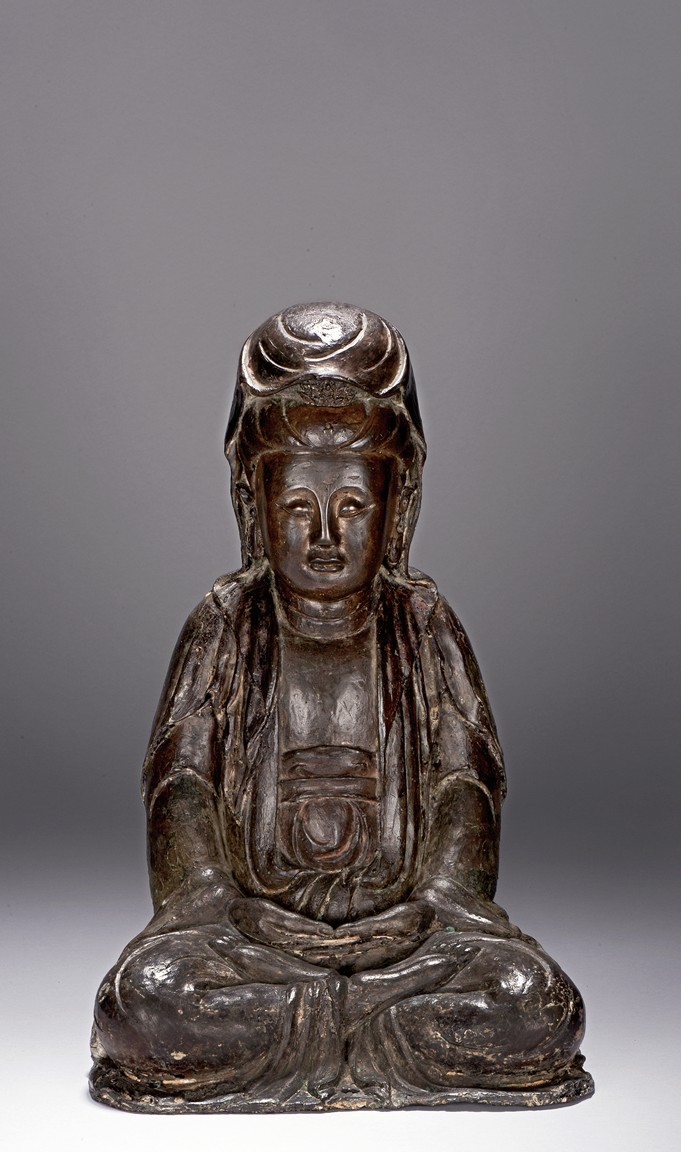 The bodhisattva cast seated in dhyanasana, with both hands holding together in dhyana mudra, or meditative gesture, wearing long robe and dhoti tied above chest, the face in meditative expression, hair tied into chignon under veil, overall with traces of gilt. Ming Dynasty period.