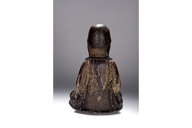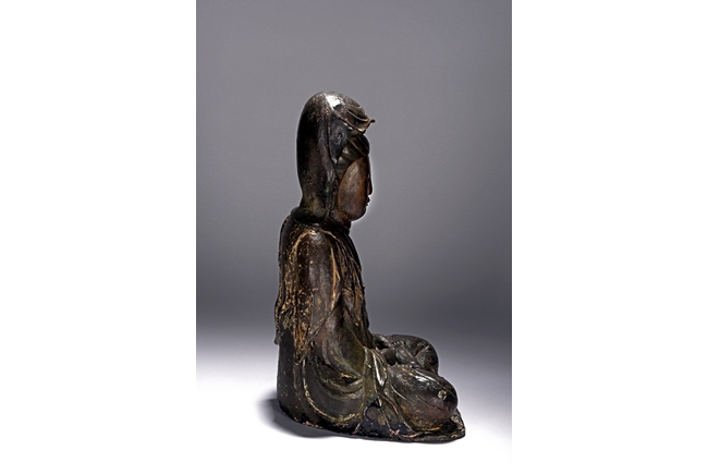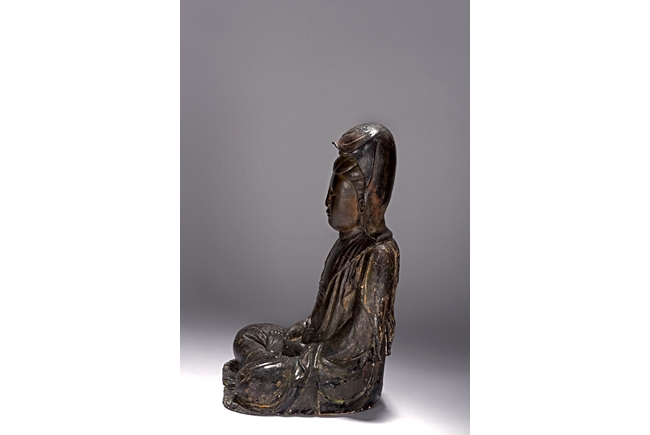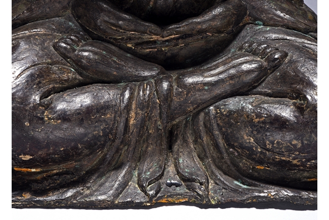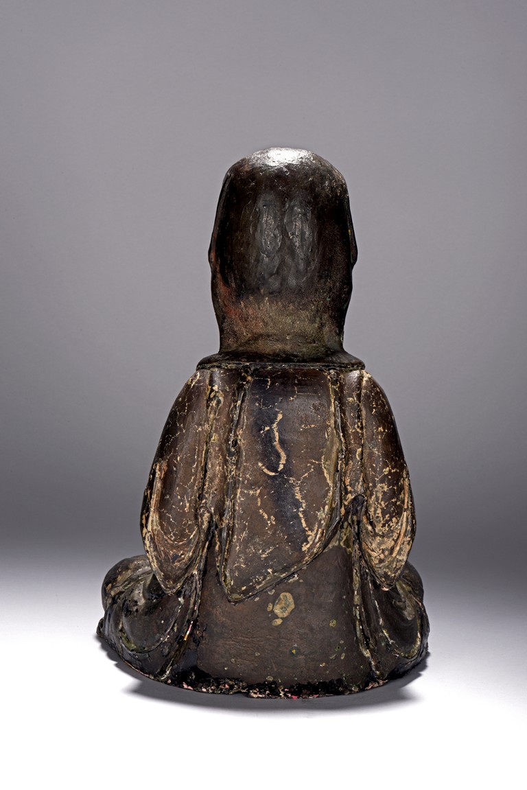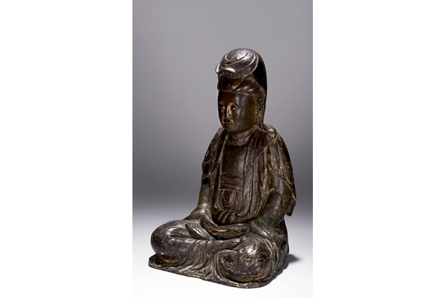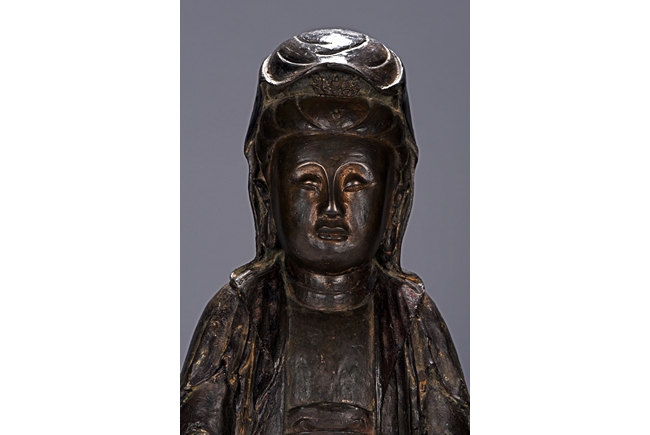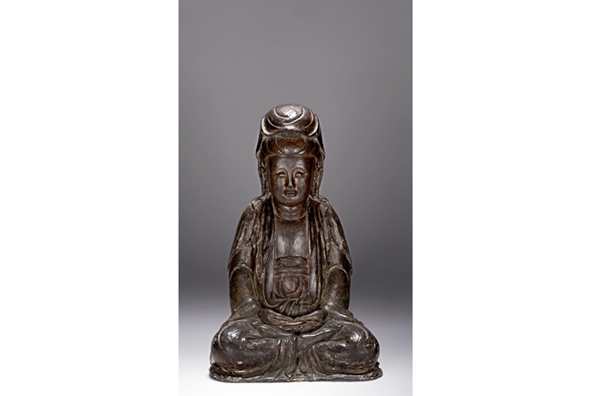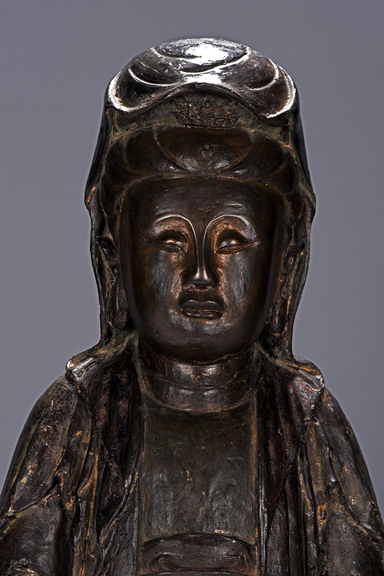 The bodhisattva cast seated in dhyanasana, with both hands holding together in dhyana mudra, or meditative gesture, wearing long robe and dhoti tied above chest, the face in meditative expression, hair tied into chignon under veil, overall with traces of gilt. Ming Dynasty period.