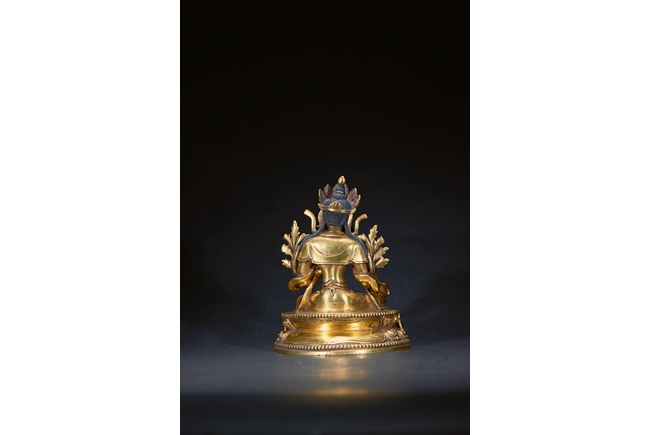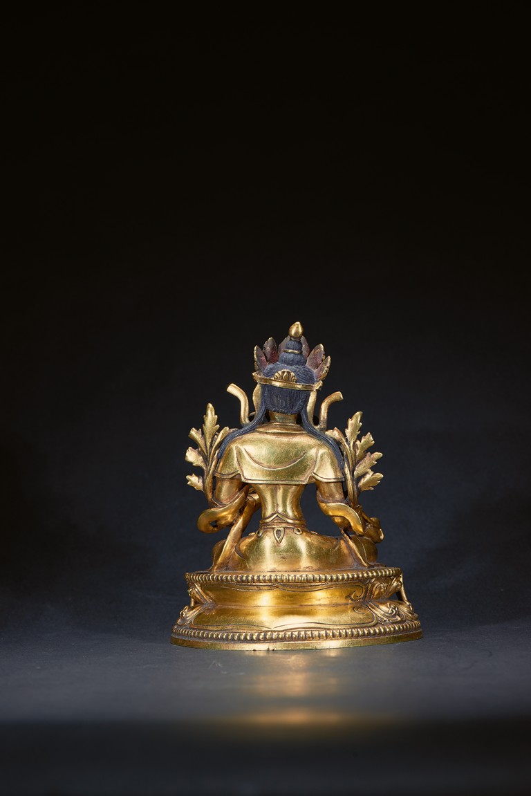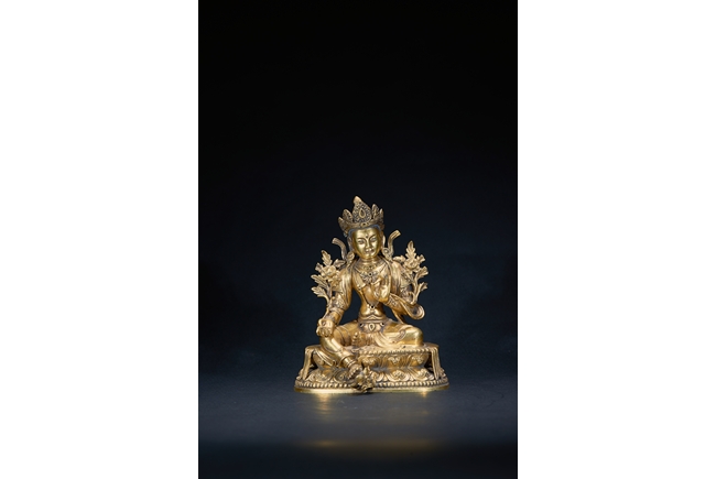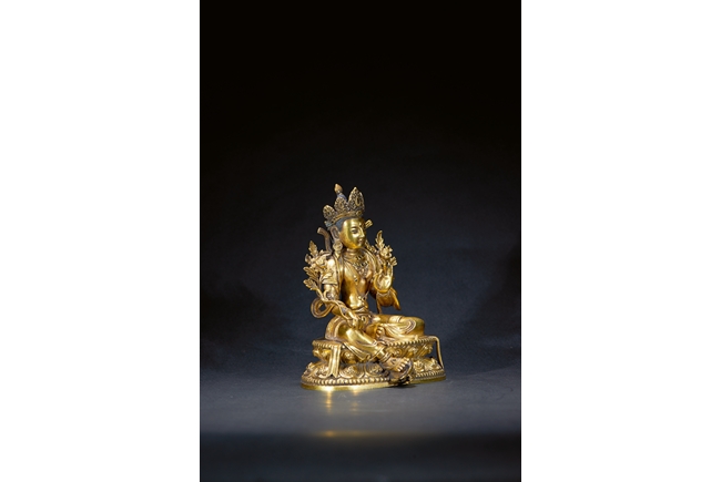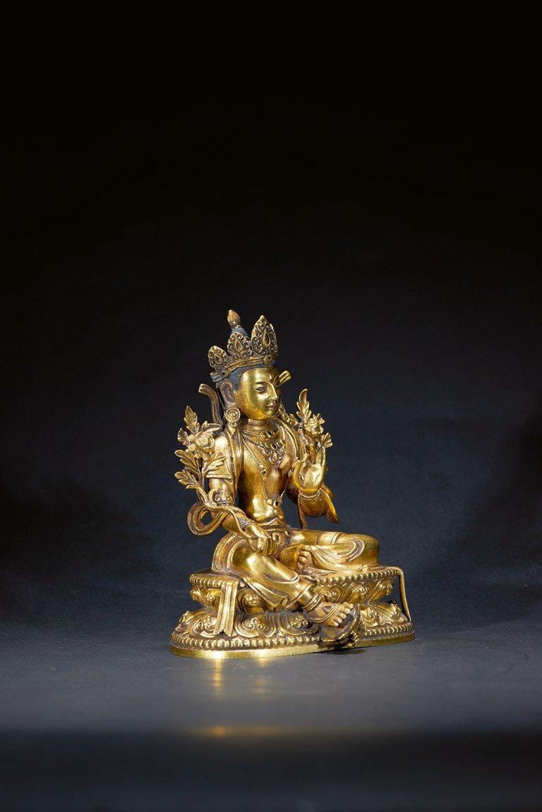 The deity is seated in lalitasana on a double-lotus base , her hands held in varadamudra and vitarkamudra. dressed in a flowing dhoti and adorned with a streaming sash and beaded jewelry, with a lotus blossom at each shoulder. Her benevolent face is surmounted by the tall chignon and a foliate tiara. Qing Dynasty Kangxi period.