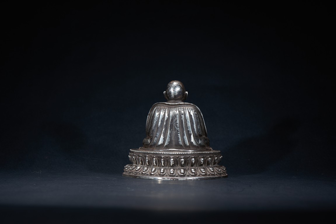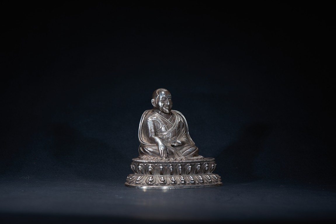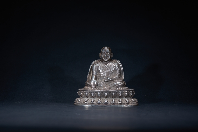 Seated on a double lotus throne, the lama wears a voluminous and layered robe with finely incised borders and patterns, his right hand in bhumisparshamudra and left hand rested on lap, the face with smiling expression and of short-cropped hairstyle.Qing Dynasty period.