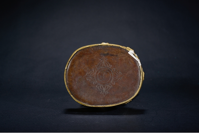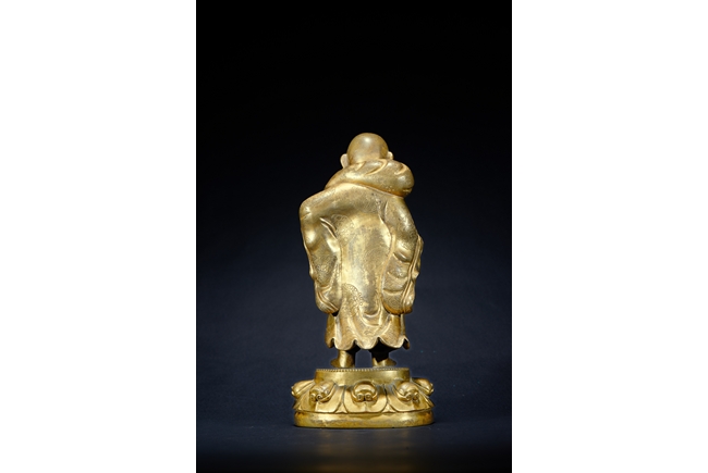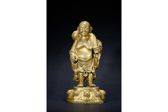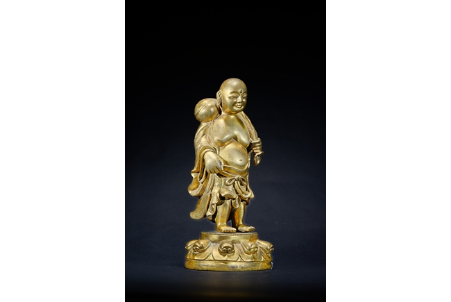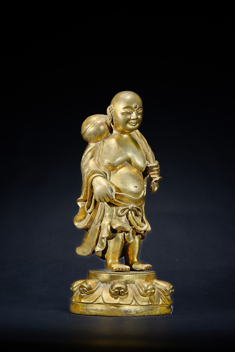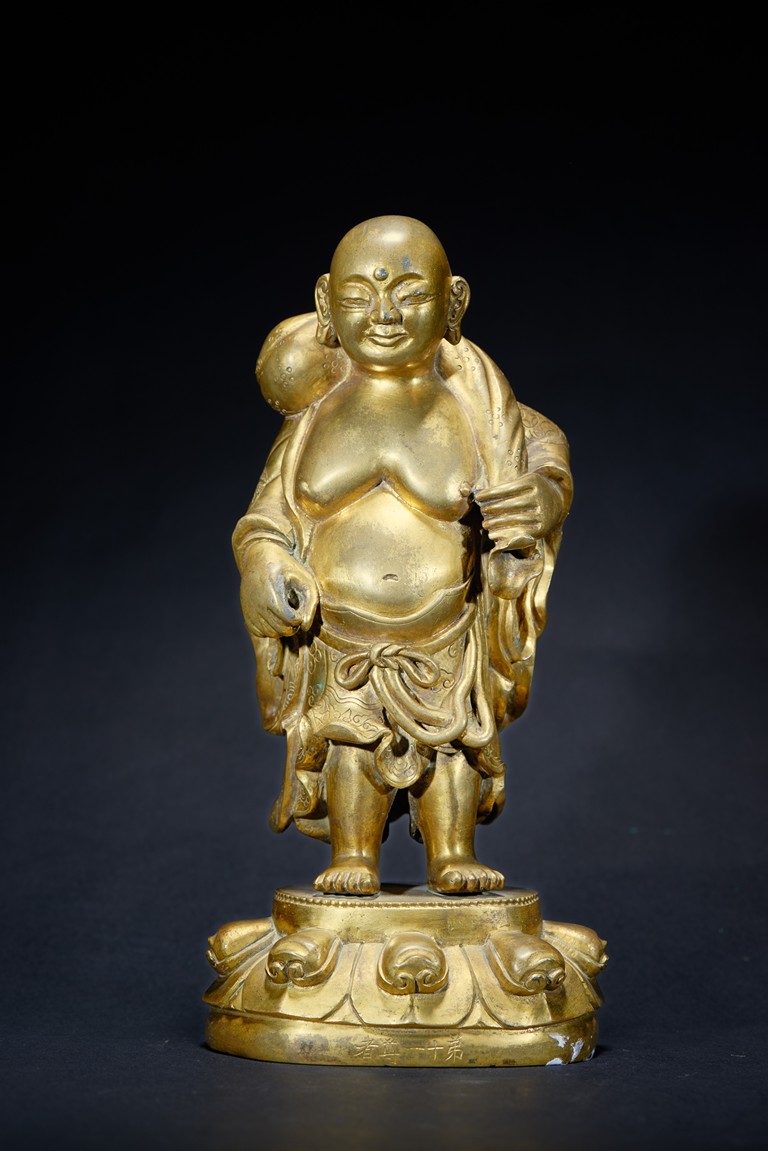 The figure is shown standing upon a lotus throne, the left hand holding a bag over shoulder, wearing voluminous robe with decorated medallions and exposing bare chest, the face with benigh expression. The front of the base with mark. Qing Dynasty period.