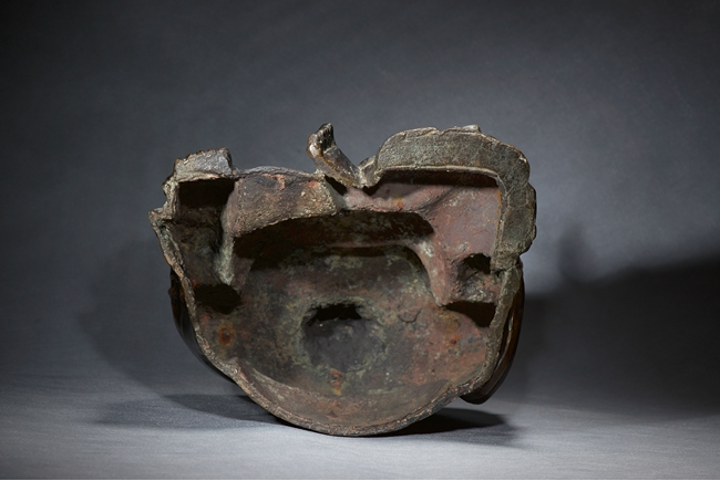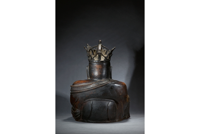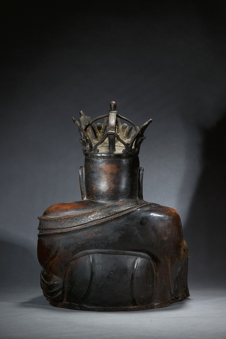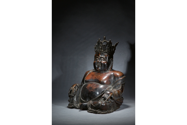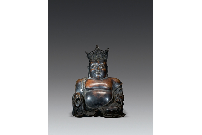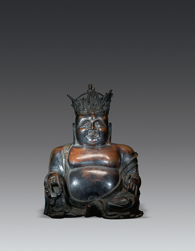 Shown seated with the right knee raised, holding a sack full of cash on the left hand and a strand of praying beads on the right, wearing a loose robe falling off the right shoulder and open to reveal his full belly, the head surmounted by a five-leaf diadem each enclosing a figure of Buddha Amitabha, the face with a hearty laughing expression. Qing Dynasty period.