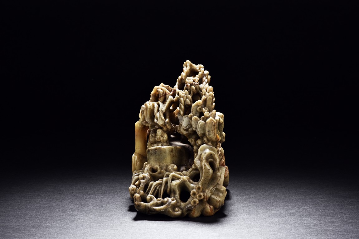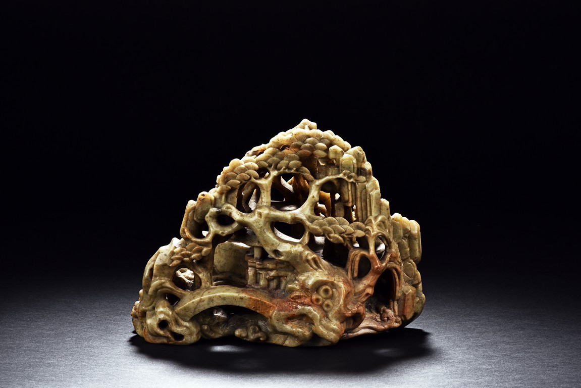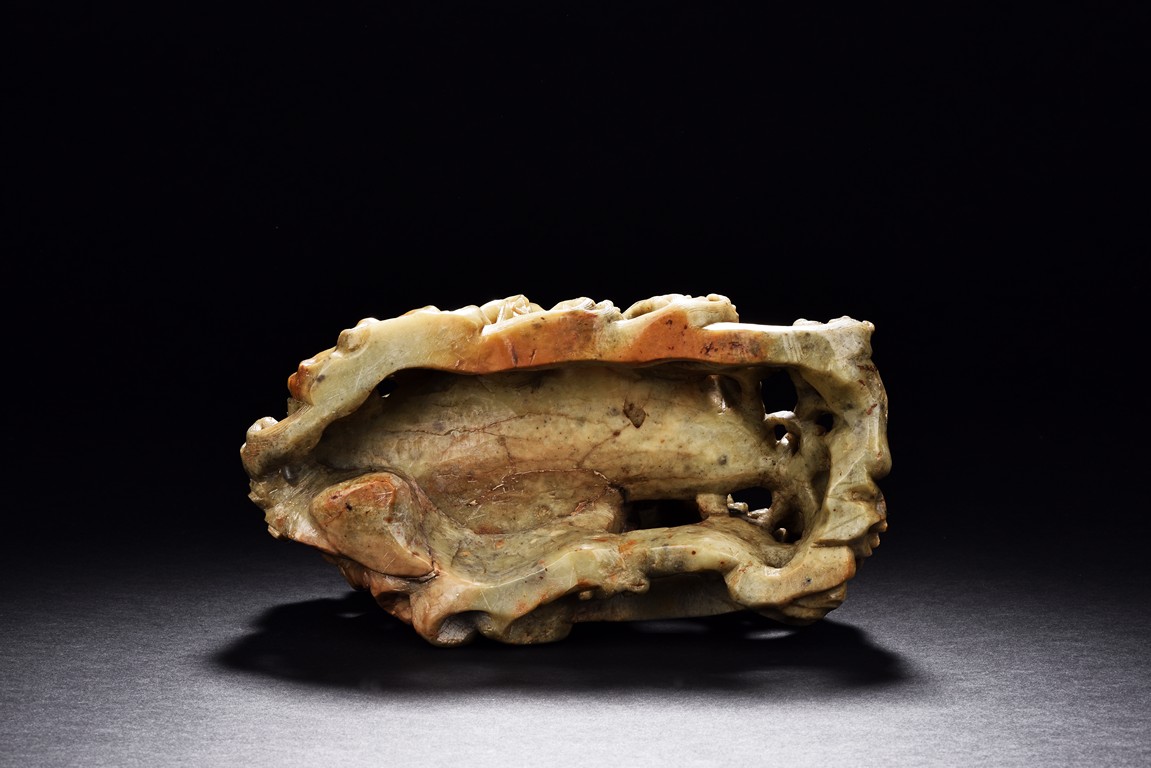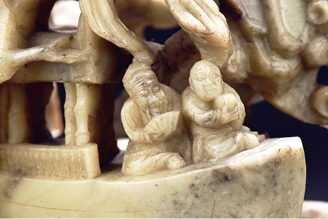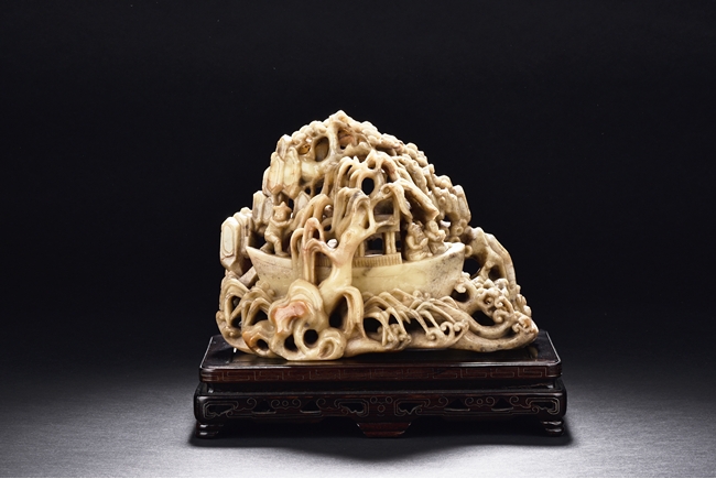 Delicately carved, it is shown with three figures on a boat going through turbulent waves, detailed with incised lines. A large tree emerging from a rockbase in the foreground over the boat, the background with a rocky mountain and pine trees. Qing Dynasty period.