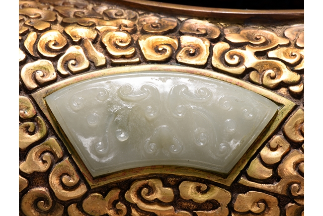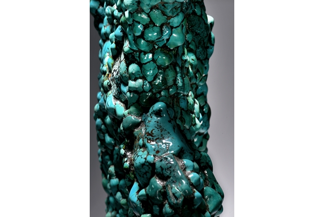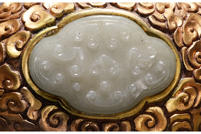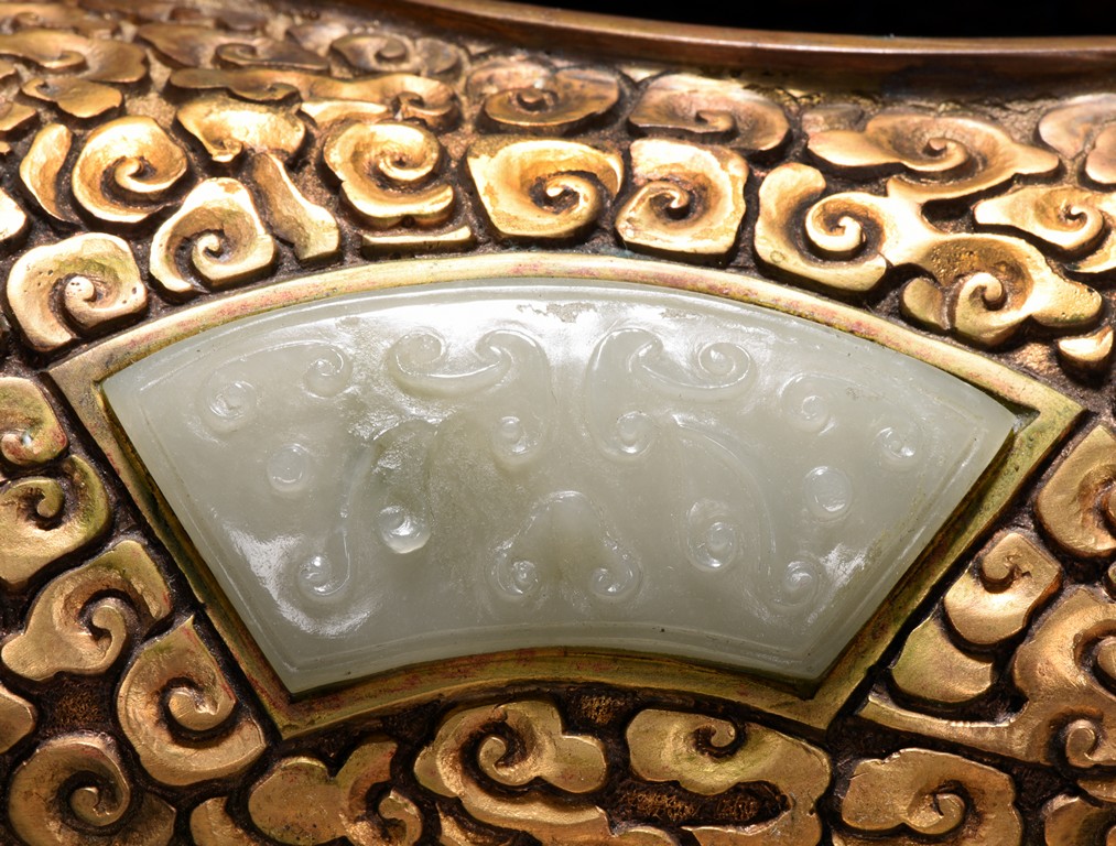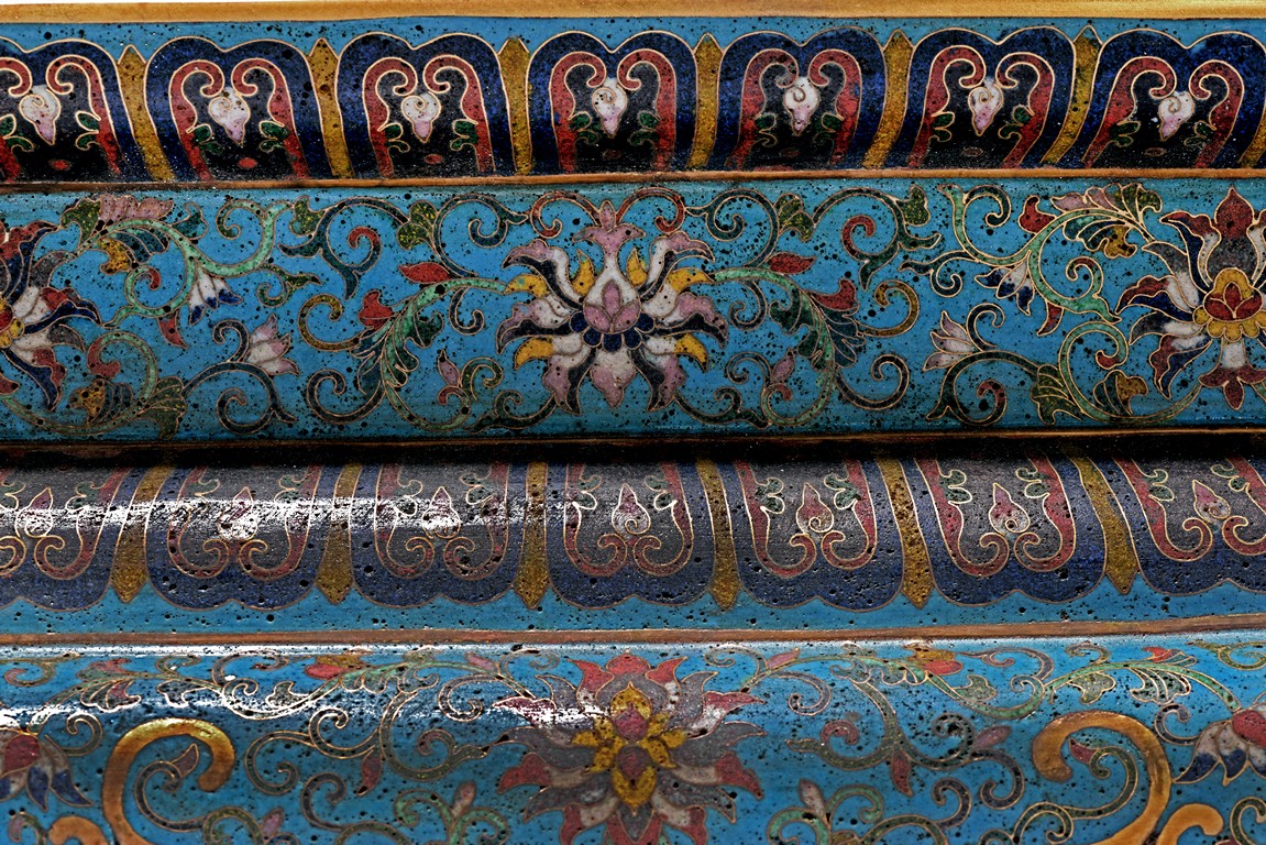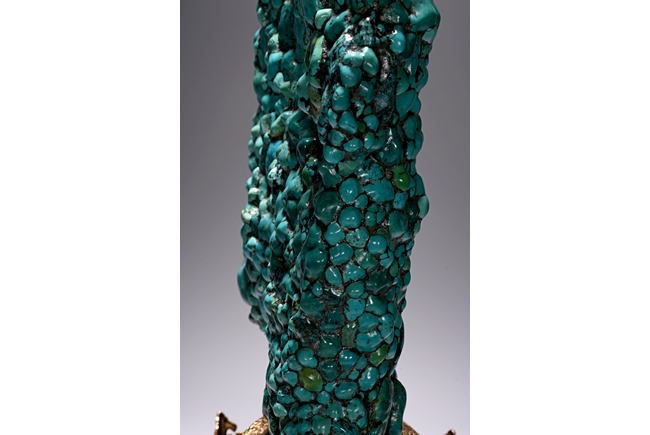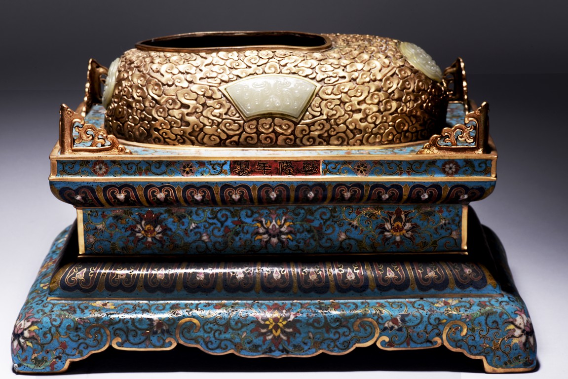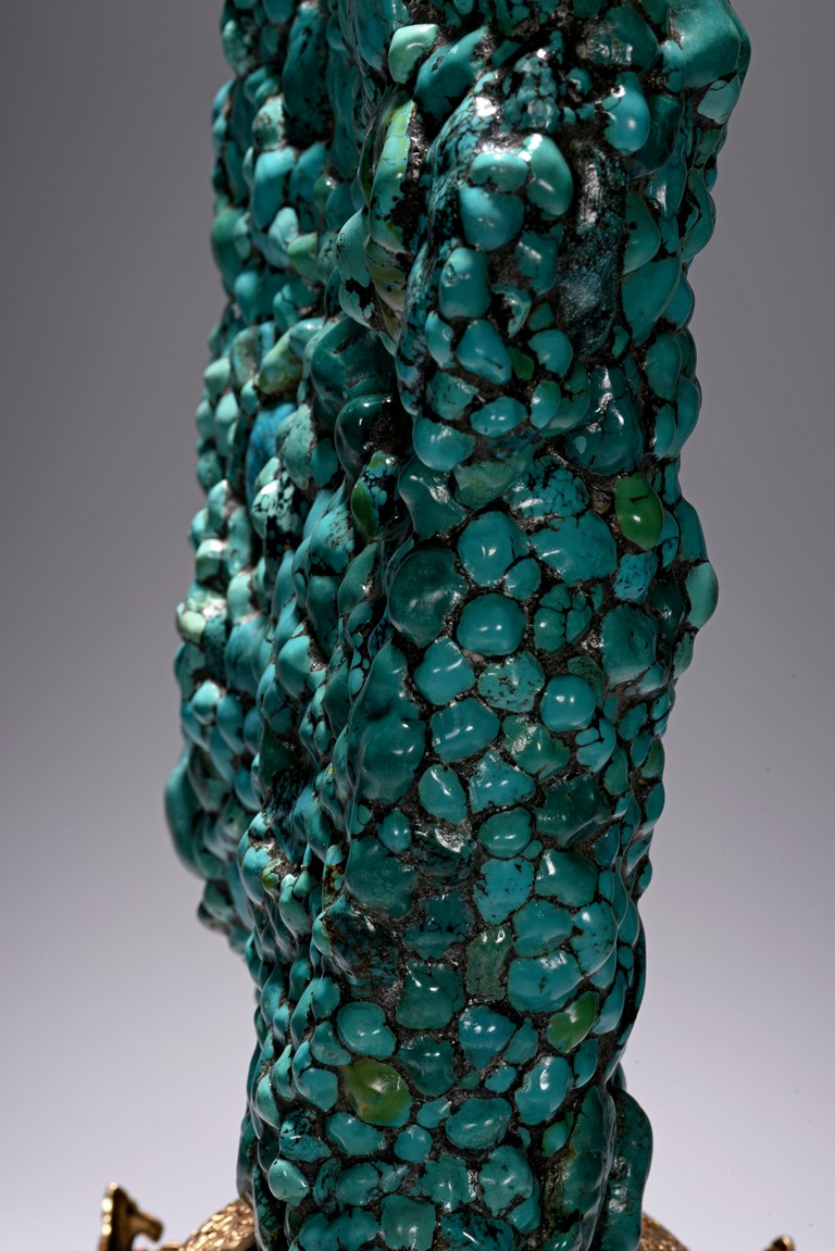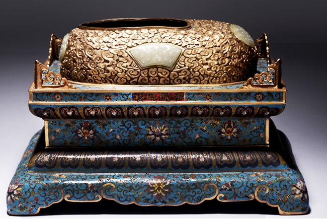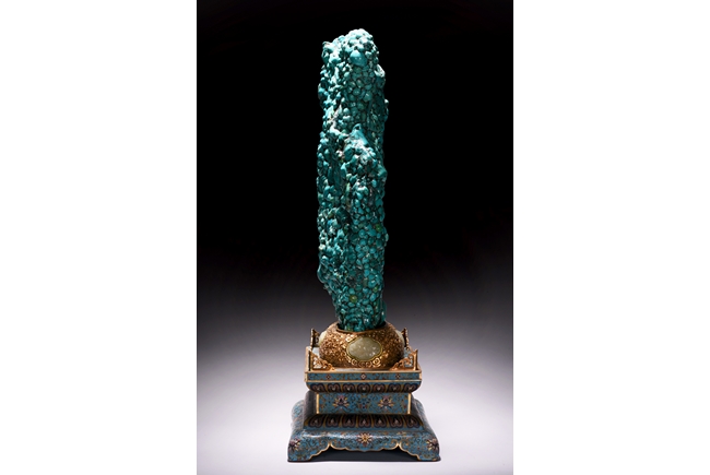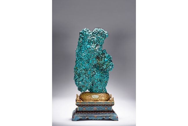 The boulder is of vertical and naturalistic form, the stone is of deep turquoise green tone, all set on gilt bronze stand with scrolled cloud design, each of four sides embellished with white jade plaque, all supported on a waisted cloisonne enamel stand decorated with double lotus and scrolled floral pattern.