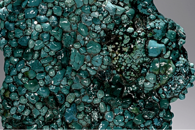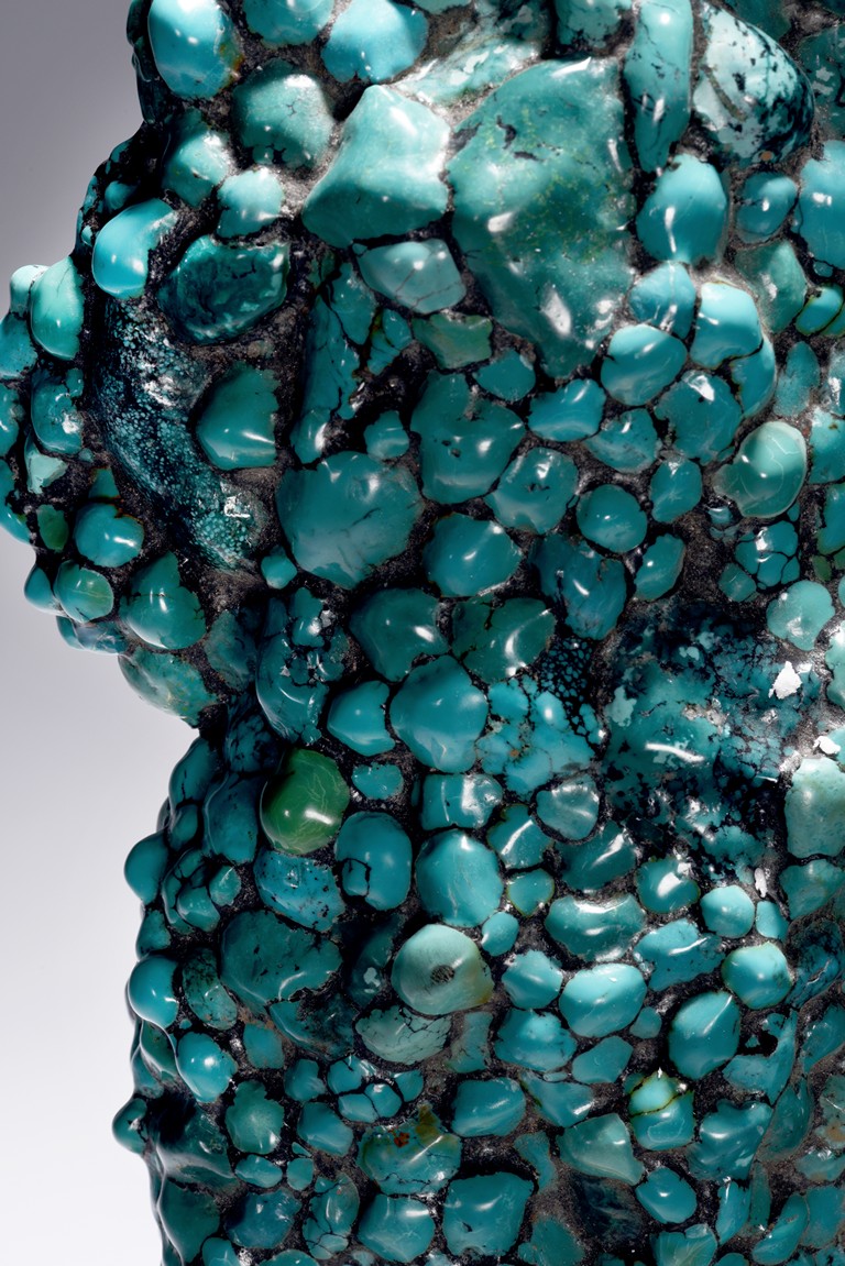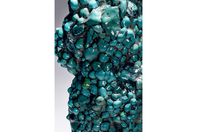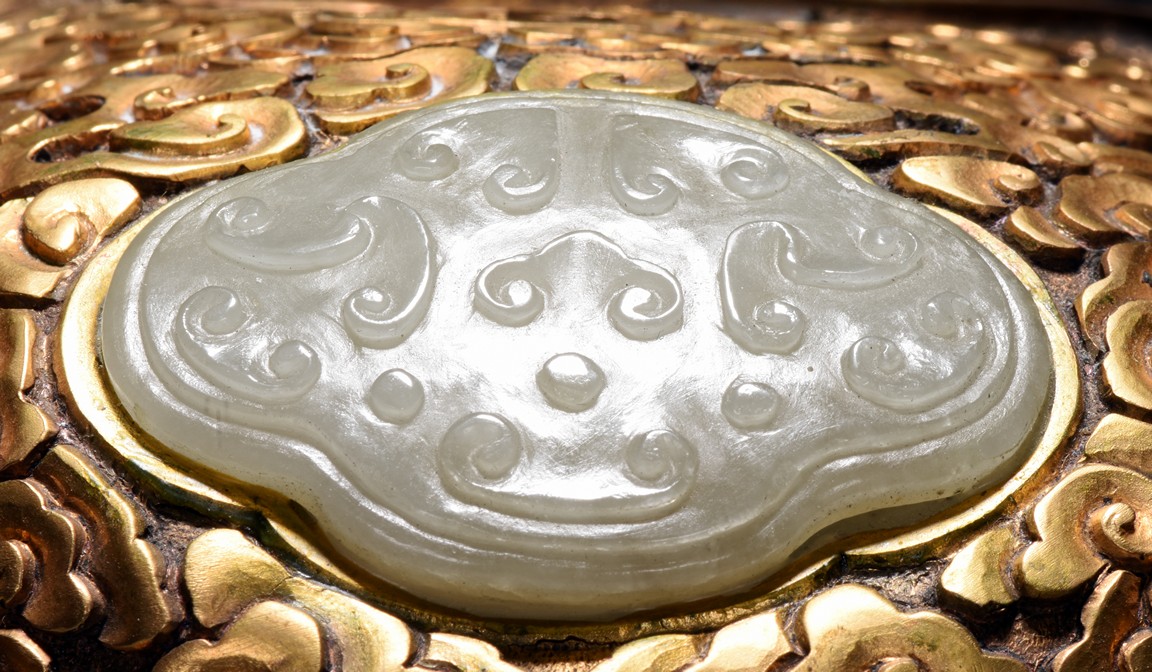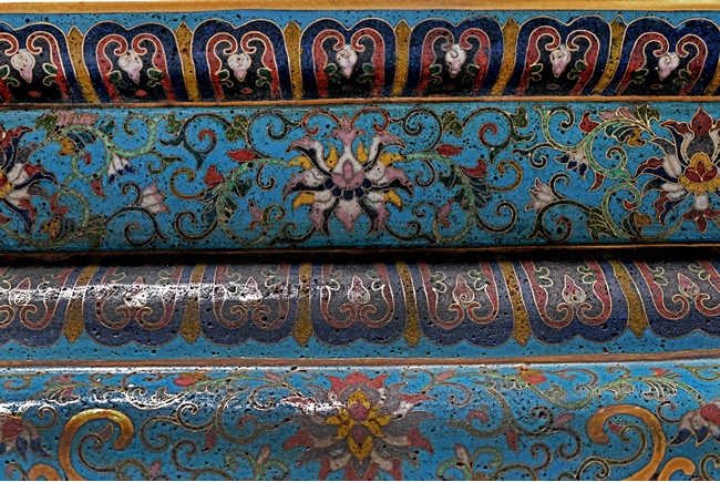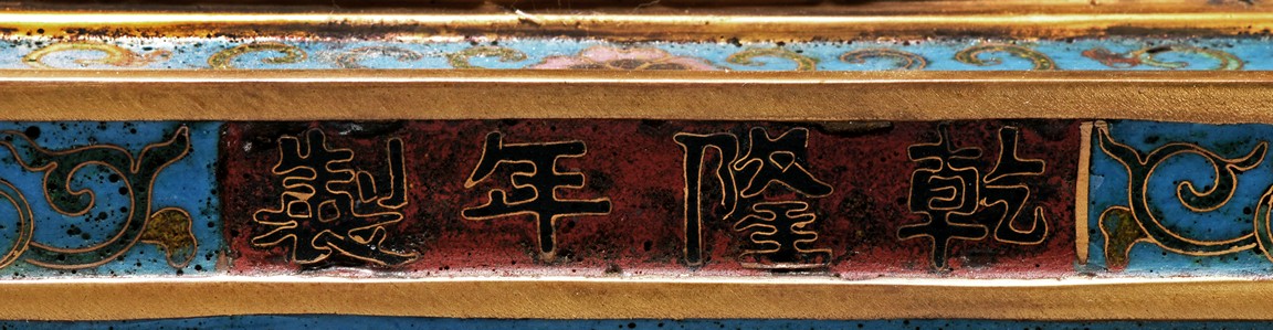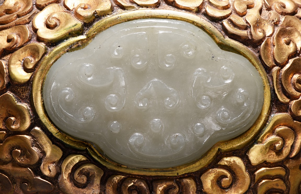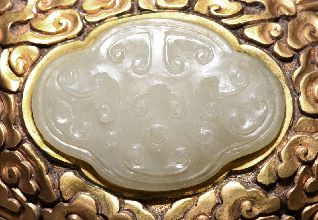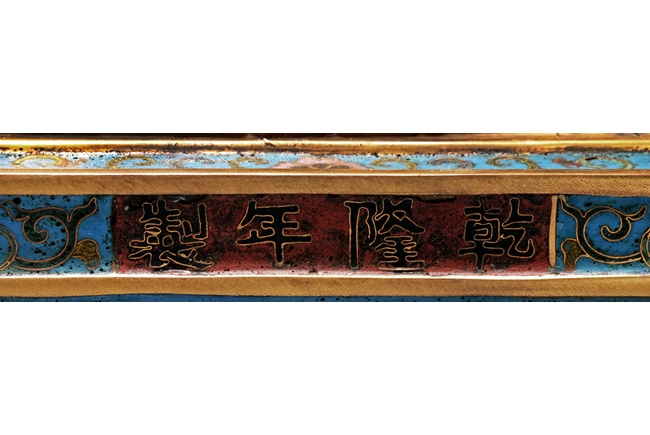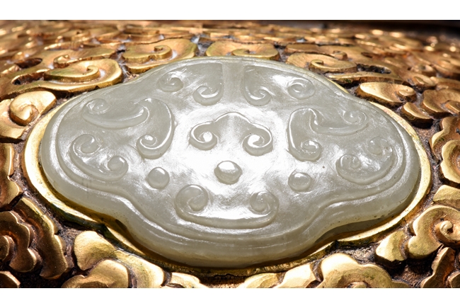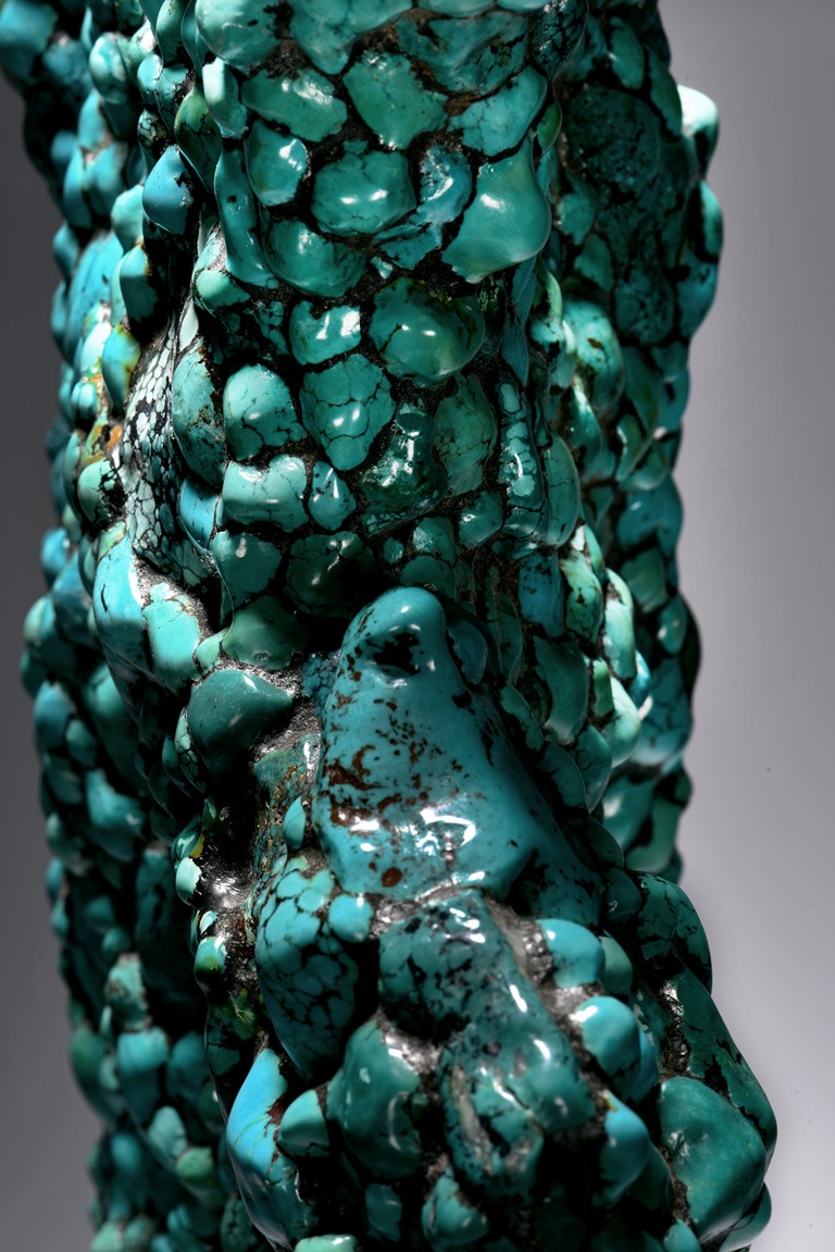 The boulder is of vertical and naturalistic form, the stone is of deep turquoise green tone, all set on gilt bronze stand with scrolled cloud design, each of four sides embellished with white jade plaque, all supported on a waisted cloisonne enamel stand decorated with double lotus and scrolled floral pattern.