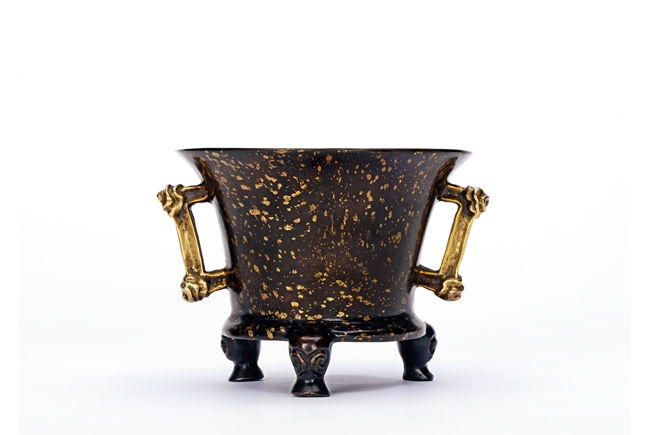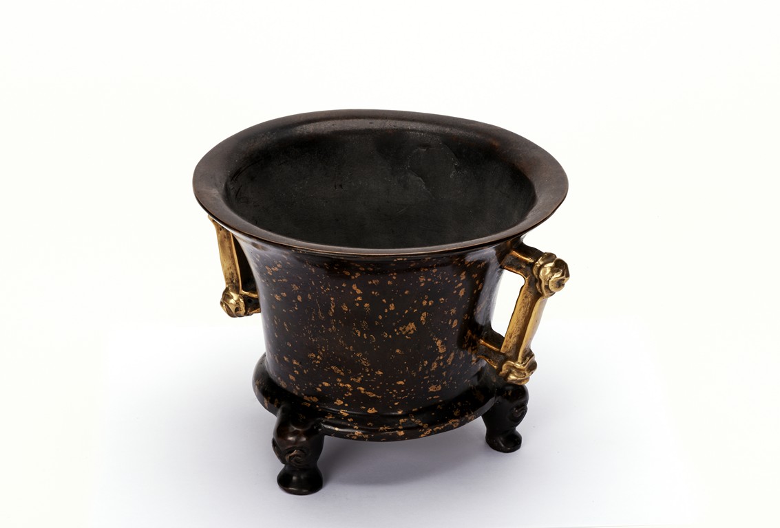 Supported on three short feet, the body rises to a spreading mouth, flanked by two gilt-bronze handles, overall with splash-gilt decoration, the bottom with six character 'Xuande' mark.
