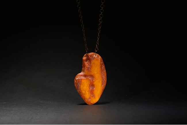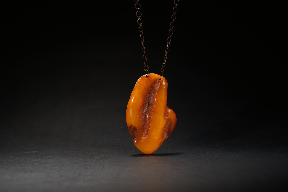 Of naturalistic shape, the amber pendant is of translucent rich caramel tone. Total weight is 52 g.