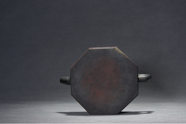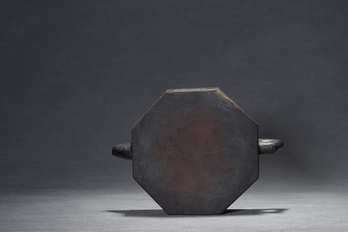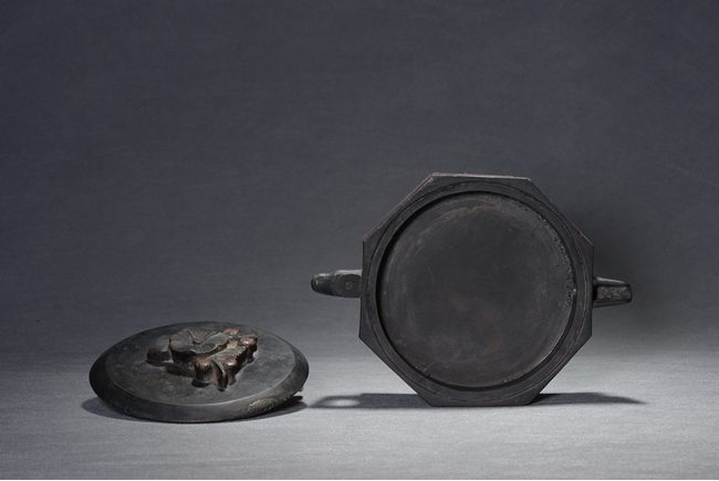Of octagonal form, the teapot inkstone is carved with plum as finial, with short rectangular spout, bamboo formed handle, the body with fine patina. Qing Dynasty period.
