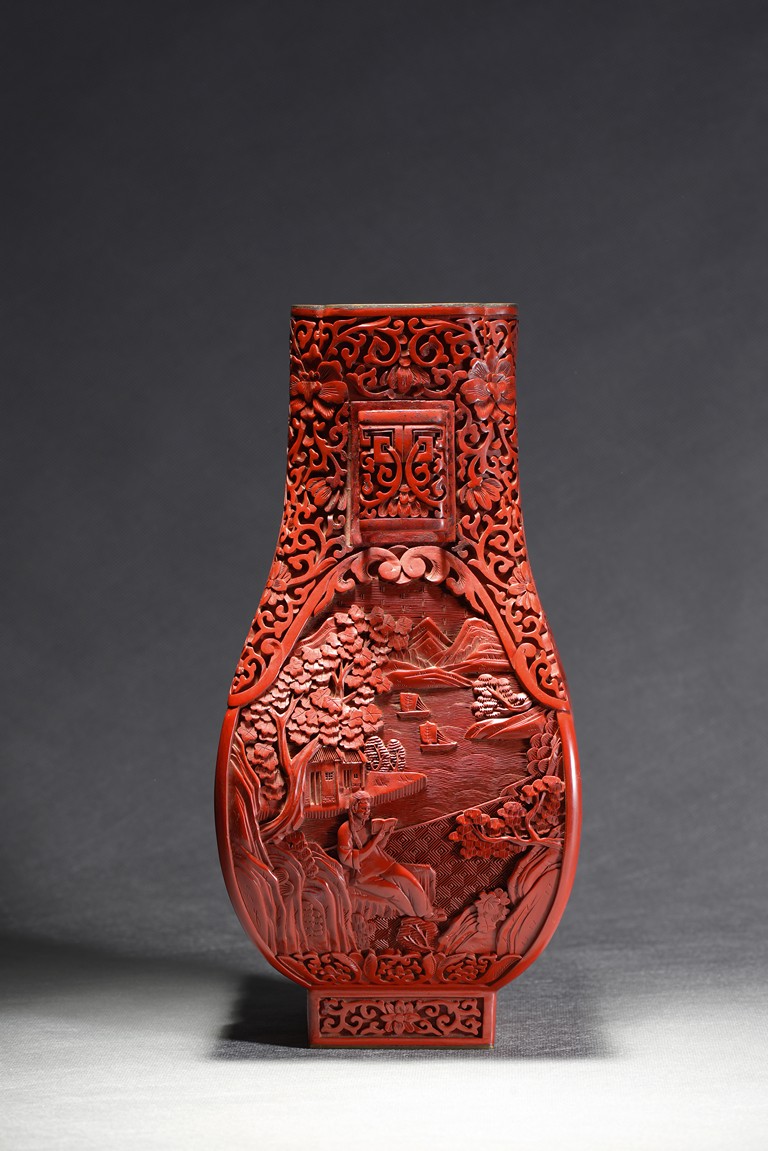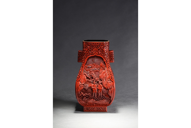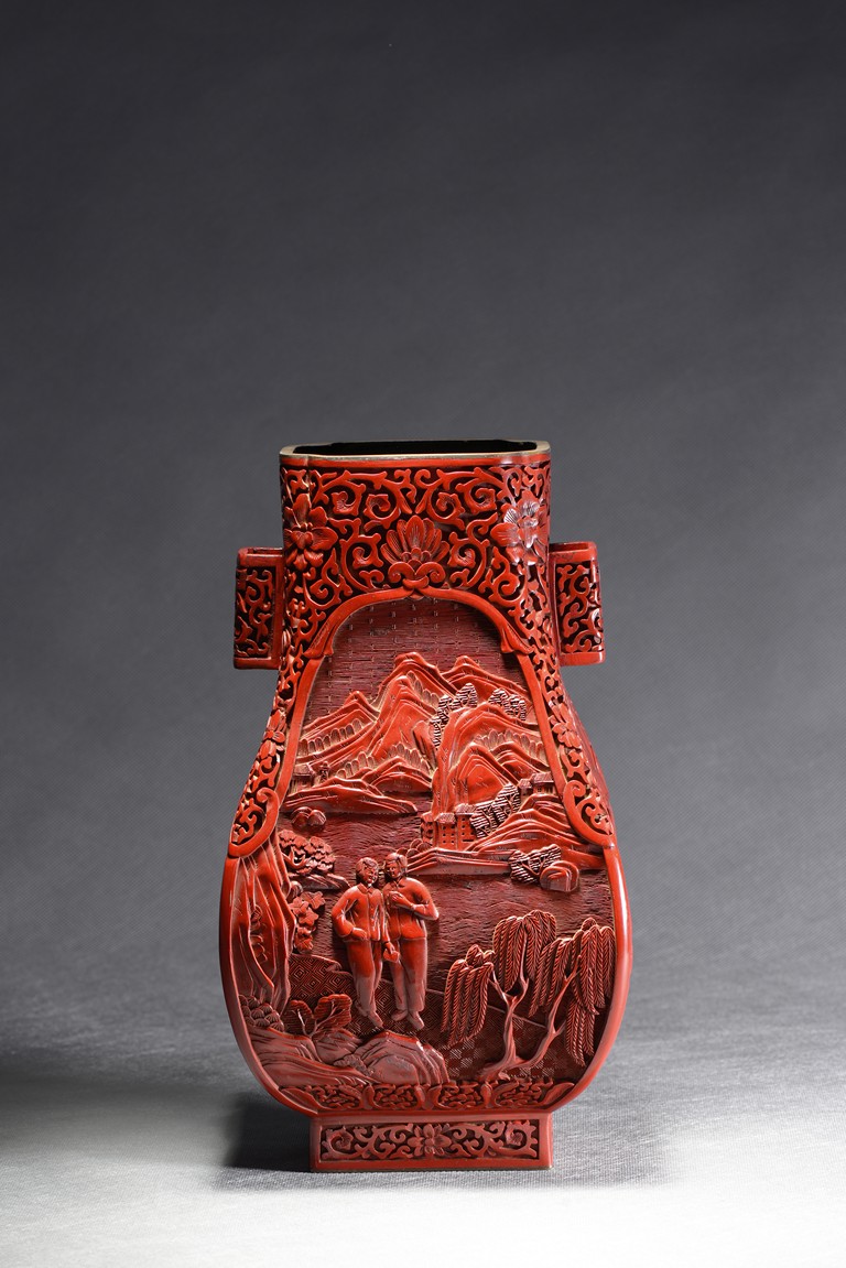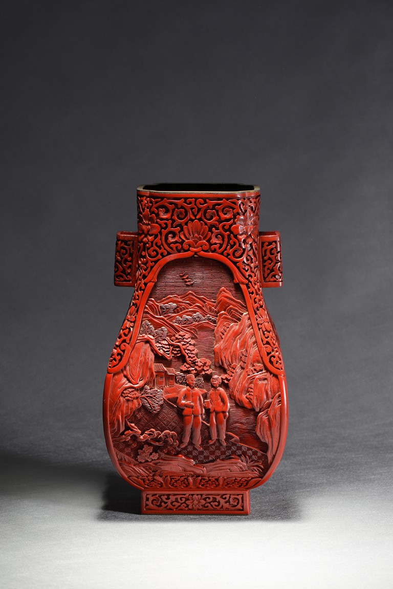 Supported on square feet, the body finely carved figures within countryside landscape scene on each side, each depicting two young figures dressed in Cultural Revolution fashion, holding and reading Quotations from Chairman Mao, the neck and ear-handles decorated with scrolled foliate pattern. 20th Century.