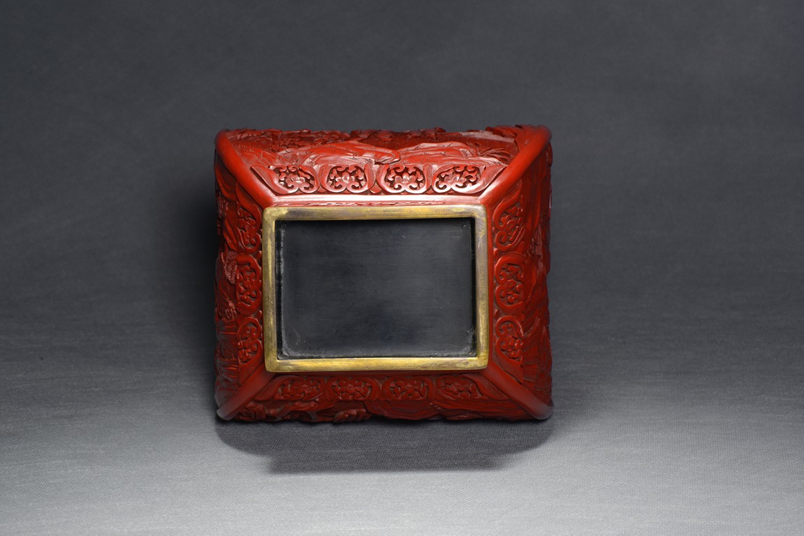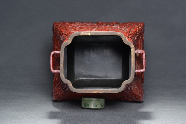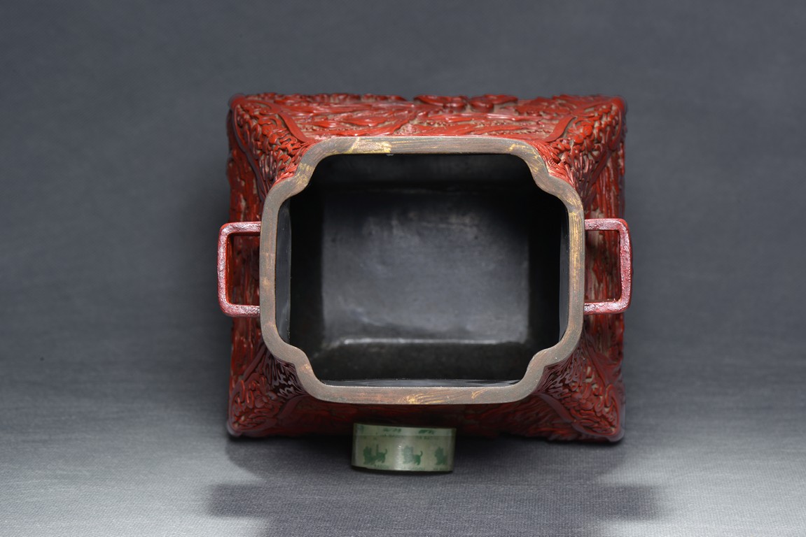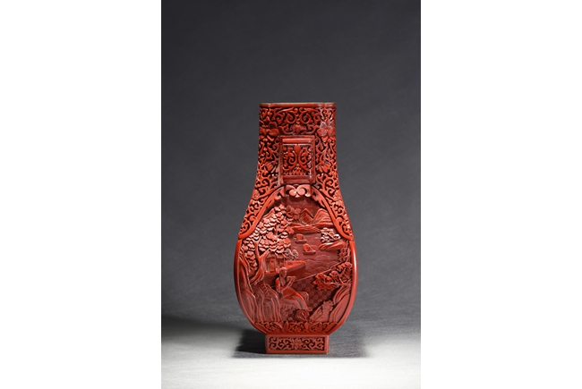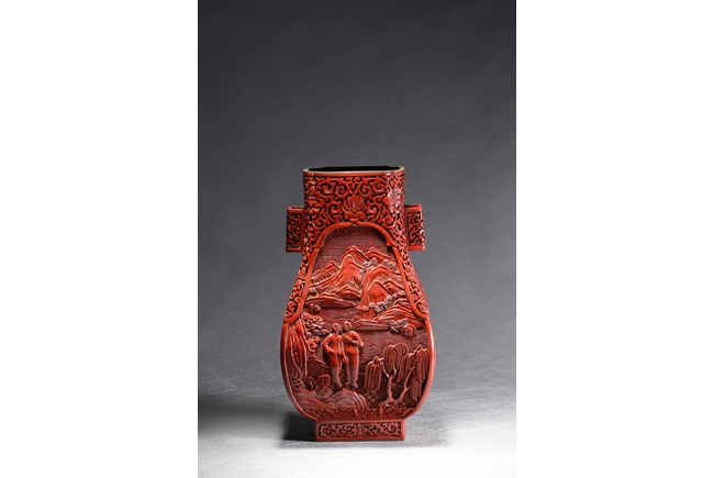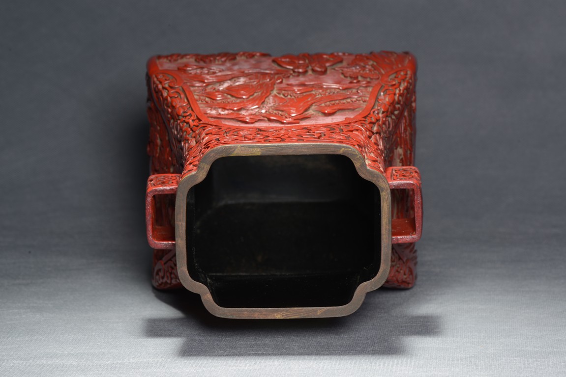 Supported on square feet, the body finely carved figures within countryside landscape scene on each side, each depicting two young figures dressed in Cultural Revolution fashion, holding and reading Quotations from Chairman Mao, the neck and ear-handles decorated with scrolled foliate pattern. 20th Century.