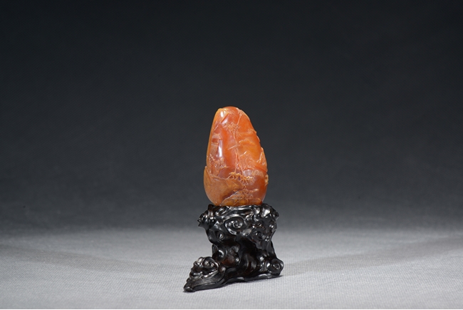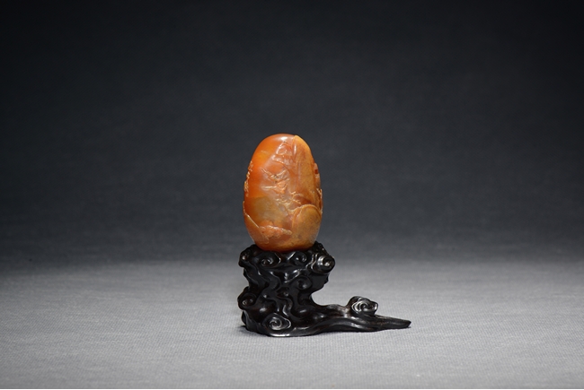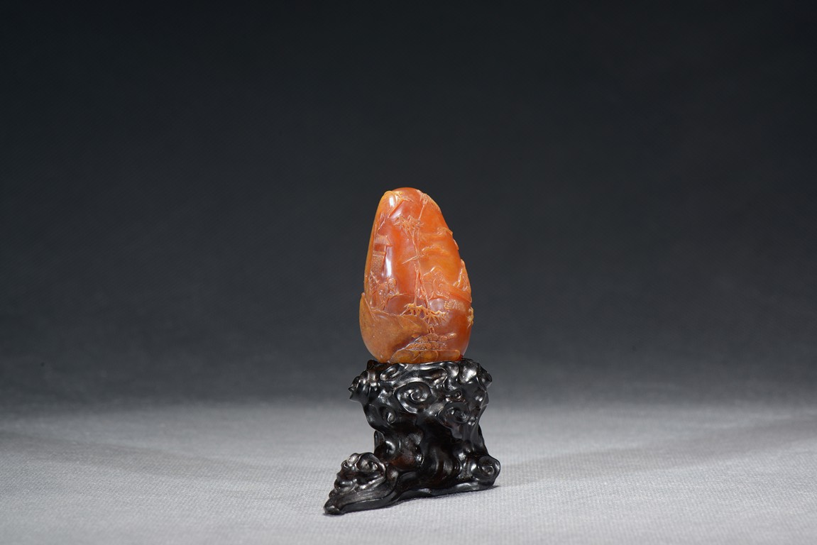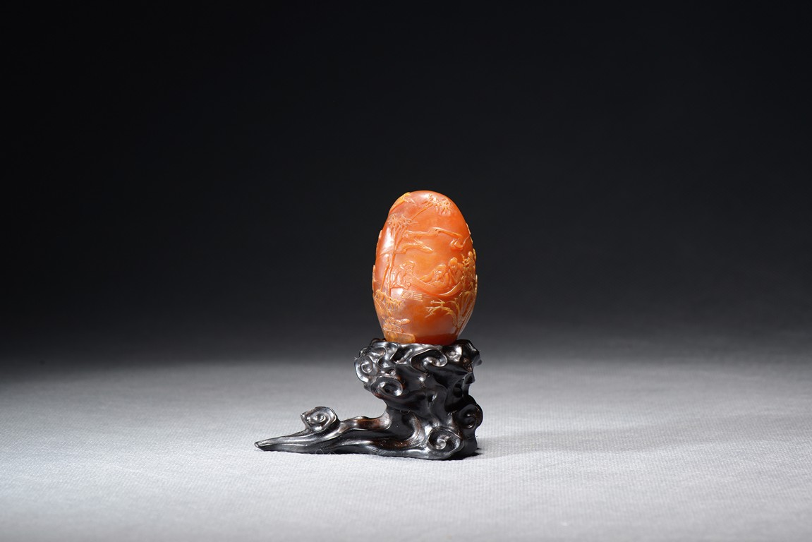 Of upright egg form, it is finely carved in shallow relief with three seated elderly scholars appreciating a hand scroll within a bamboo garden situated in a deep mountain, the reverse with two cranes in flight by a mountain cliff. The stone is of rich brown caramel tone. Total weight is 79.6 grams. Qing Dynasty period.