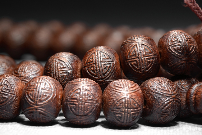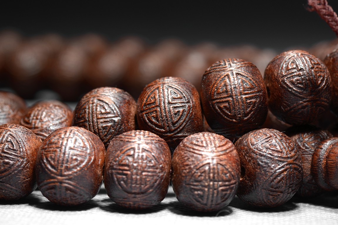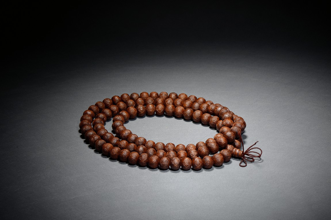 Comprising of 108 agarwood carved slightly compressed globular beads, each finely carved with stylized shou characters. Qing Dynasty period.