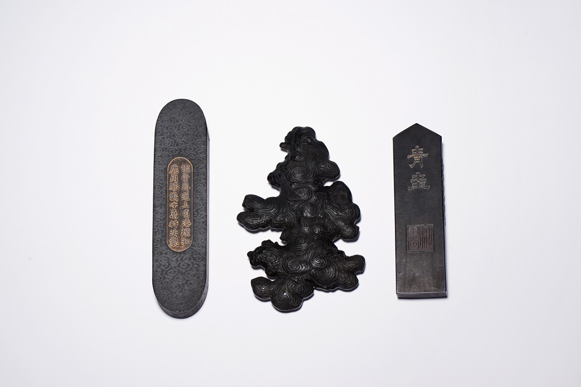 Comprising of three imperial inkcakes, including one in elongated form with rounded sides, with inscription to the center, the rest with auspicious clouds in shallow relief; an irregular cloudlike inkcake with four inscription; a rectangular inkcake with triangle end, finely carved with two polychrome dragons, the reverse with two character and seal mark.Qing Dynasty Qianlong period.