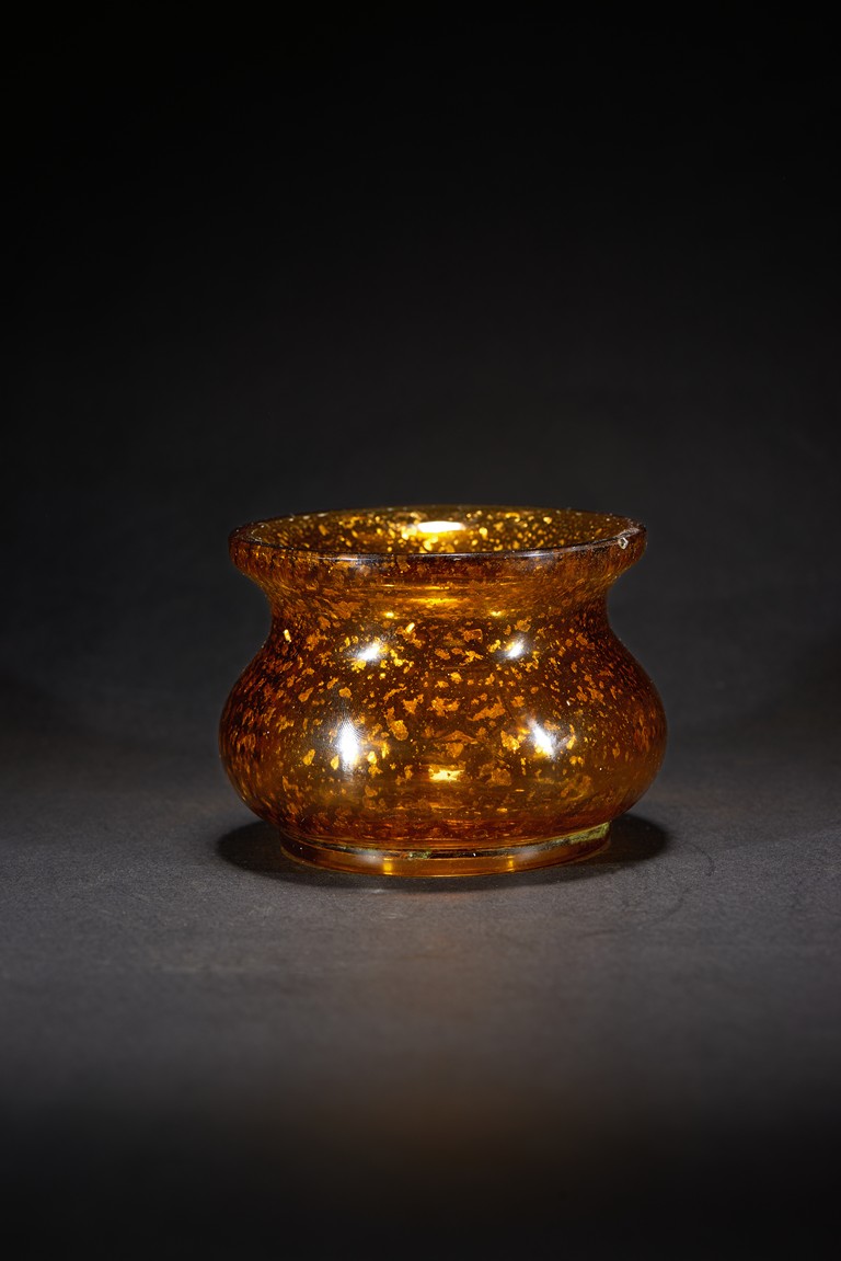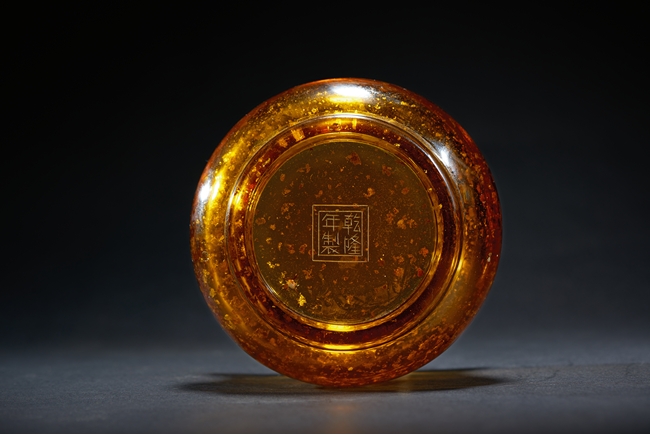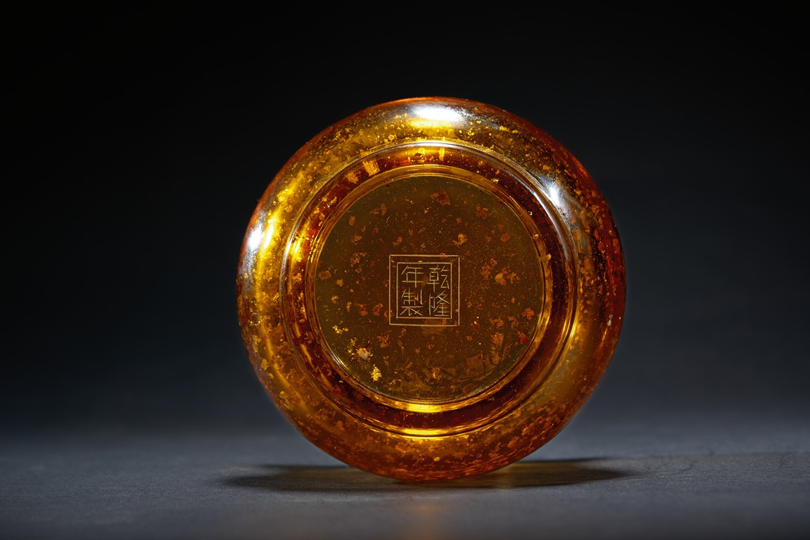 The jar has a spreading trumpet neck atop the compressed globular mid-section, all raised on a short straight foot, overall with transparent amber tone and splashed gilt, base with QIANLONG mark. Qing Dynasty Qianlong period.
