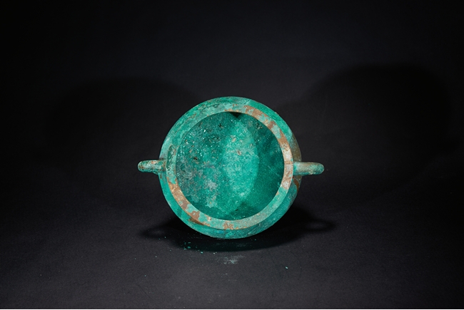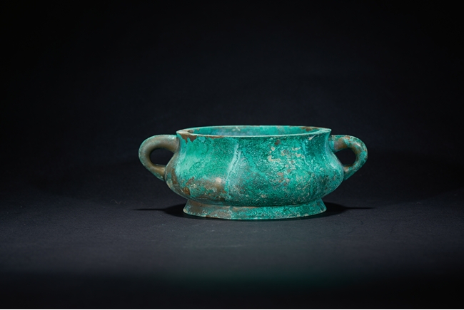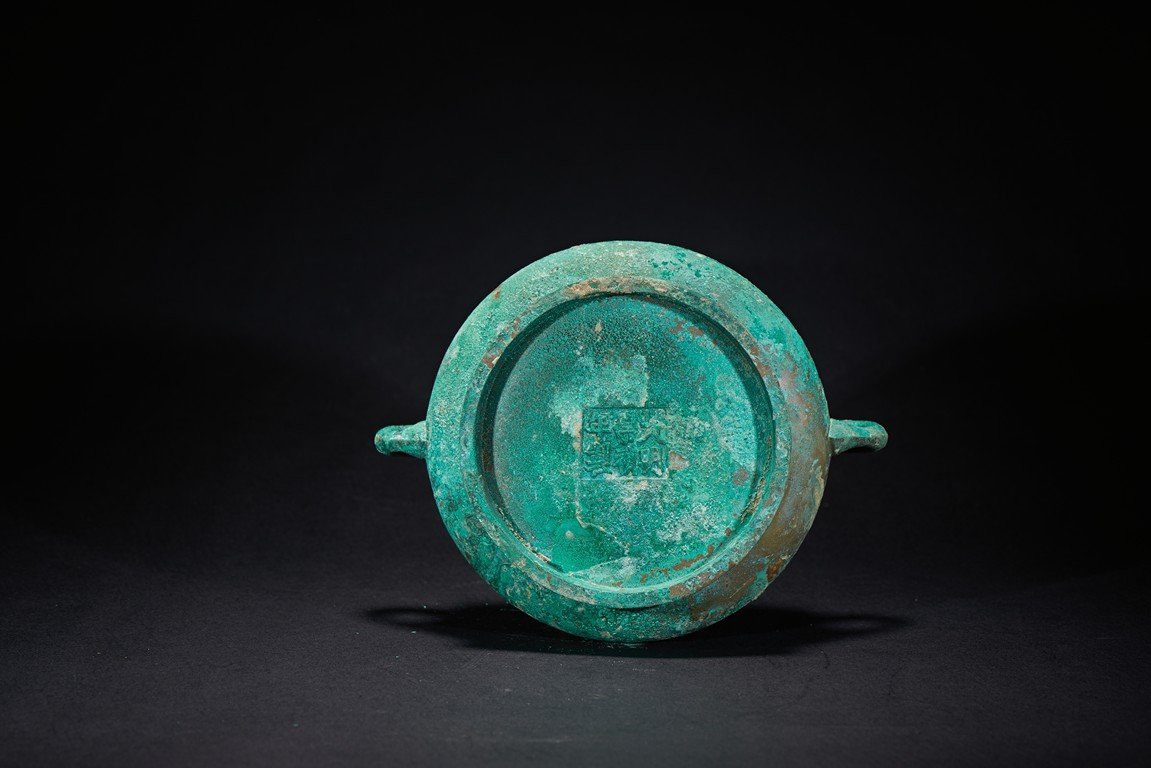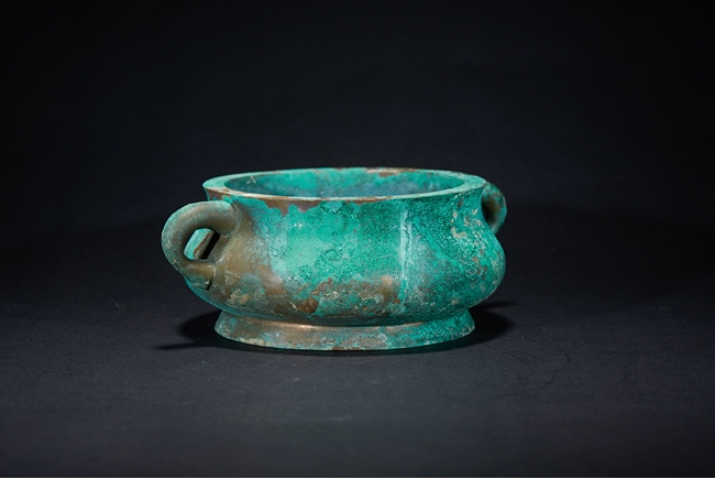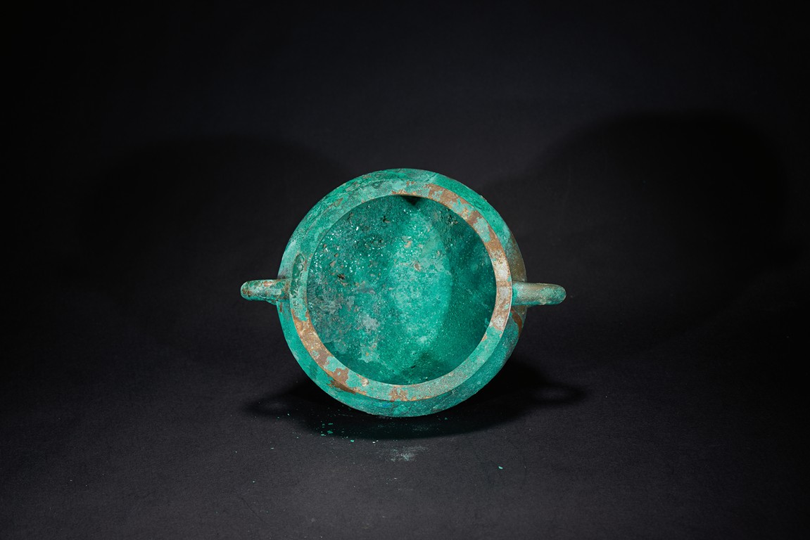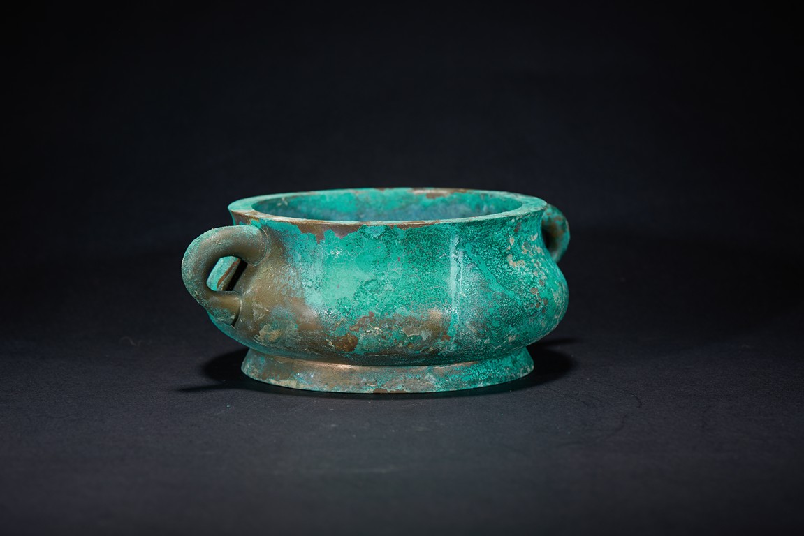 Supported on spreading foot ring and of compressed globular form, the censer is flanked by two loop handle, overall covered with turquoise-tone encrustation, the base with six character CHONGZHENG mark.Ming Dynasty period.