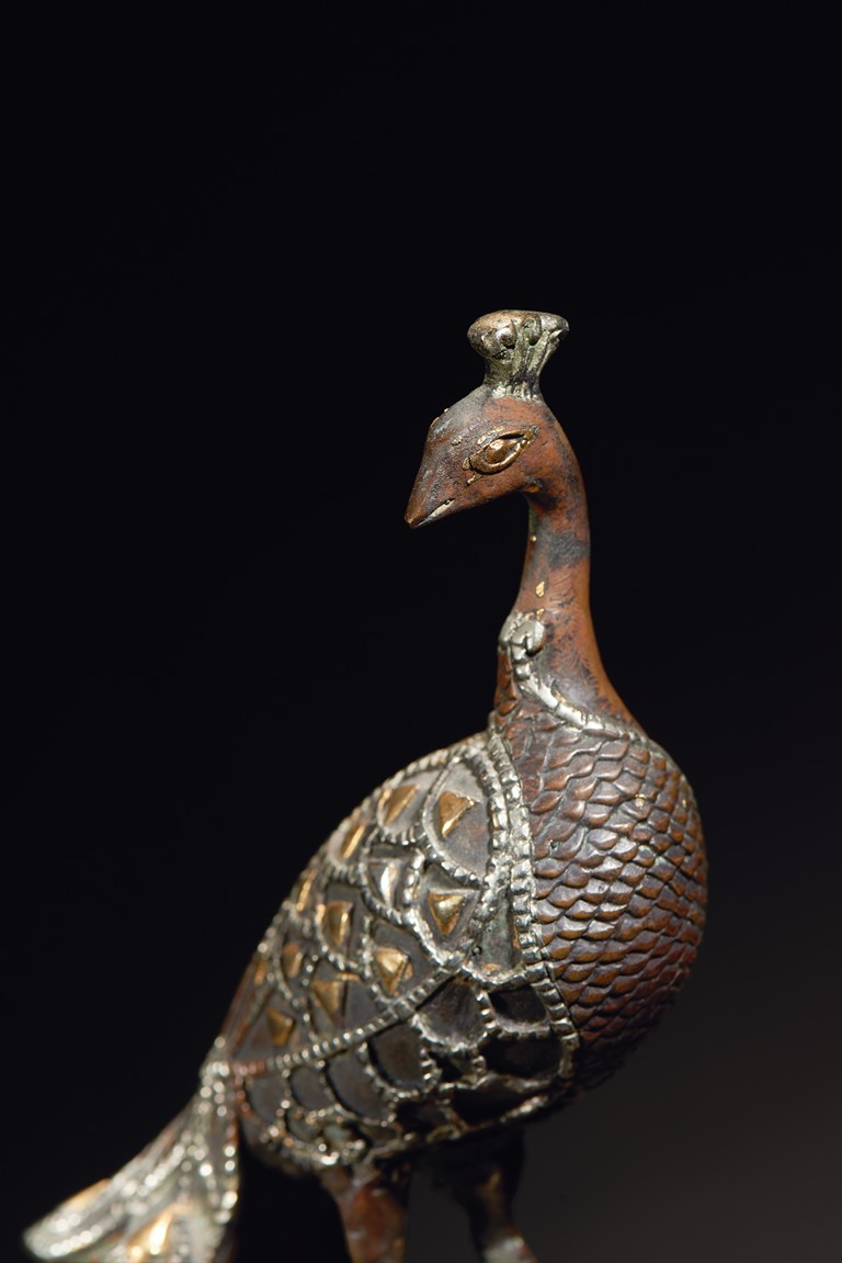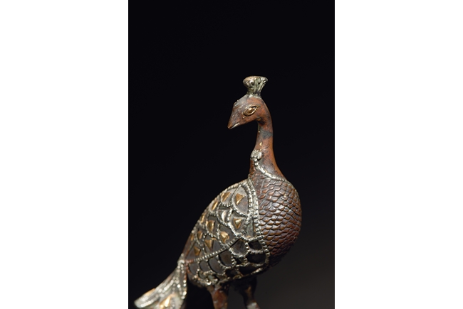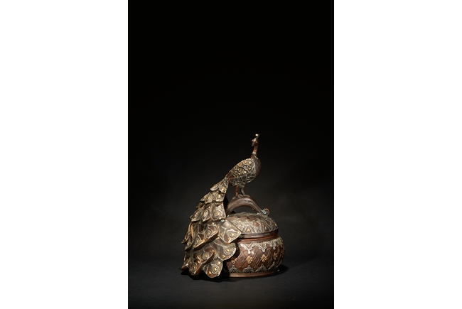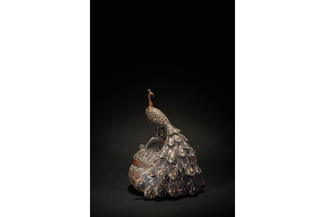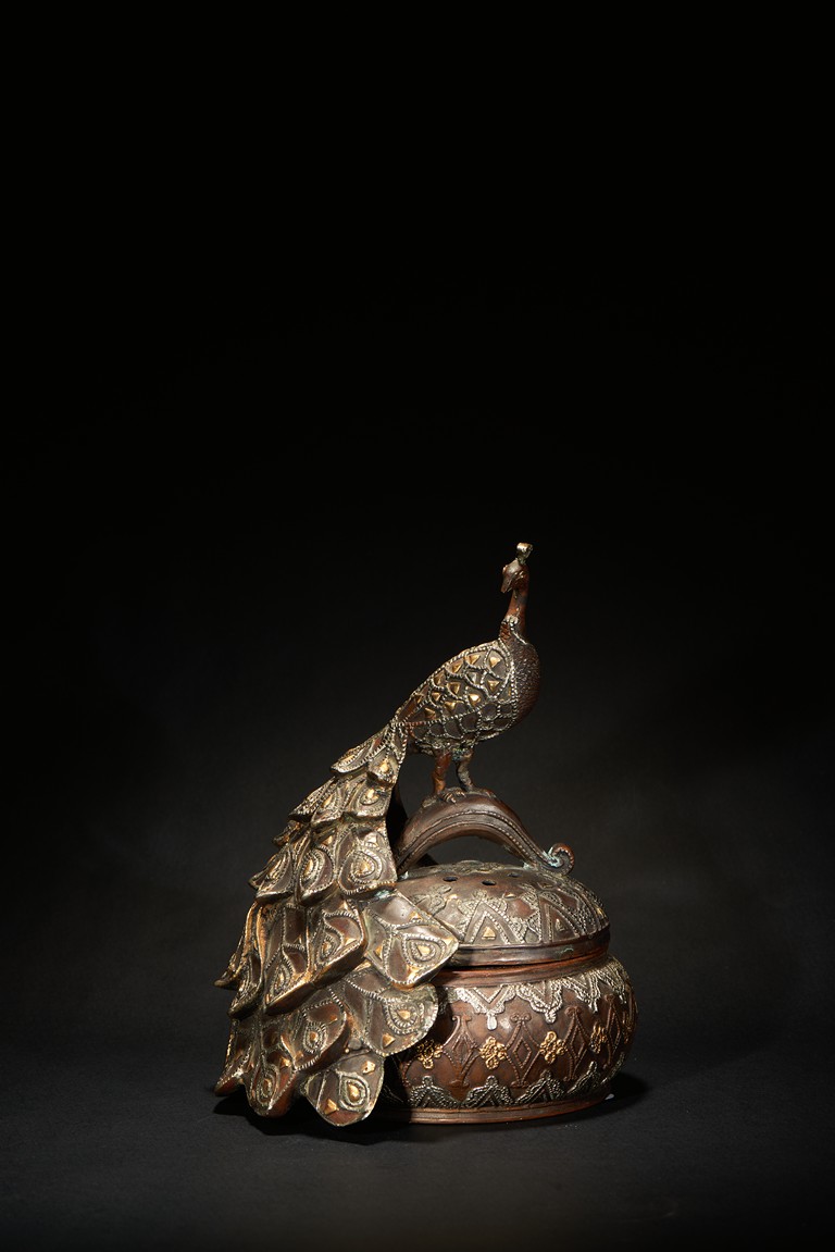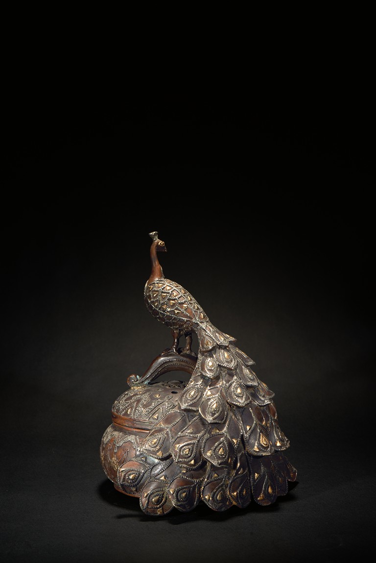 The censer body is of compressed globular form, the cover with a finely cast peacock standing upon arched handle as finial, with large tail swept downward, all decorated with silver and gold decoration. Qing Dynasty period.