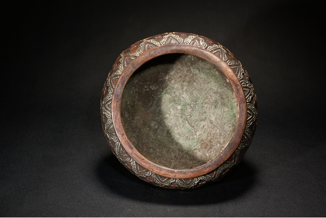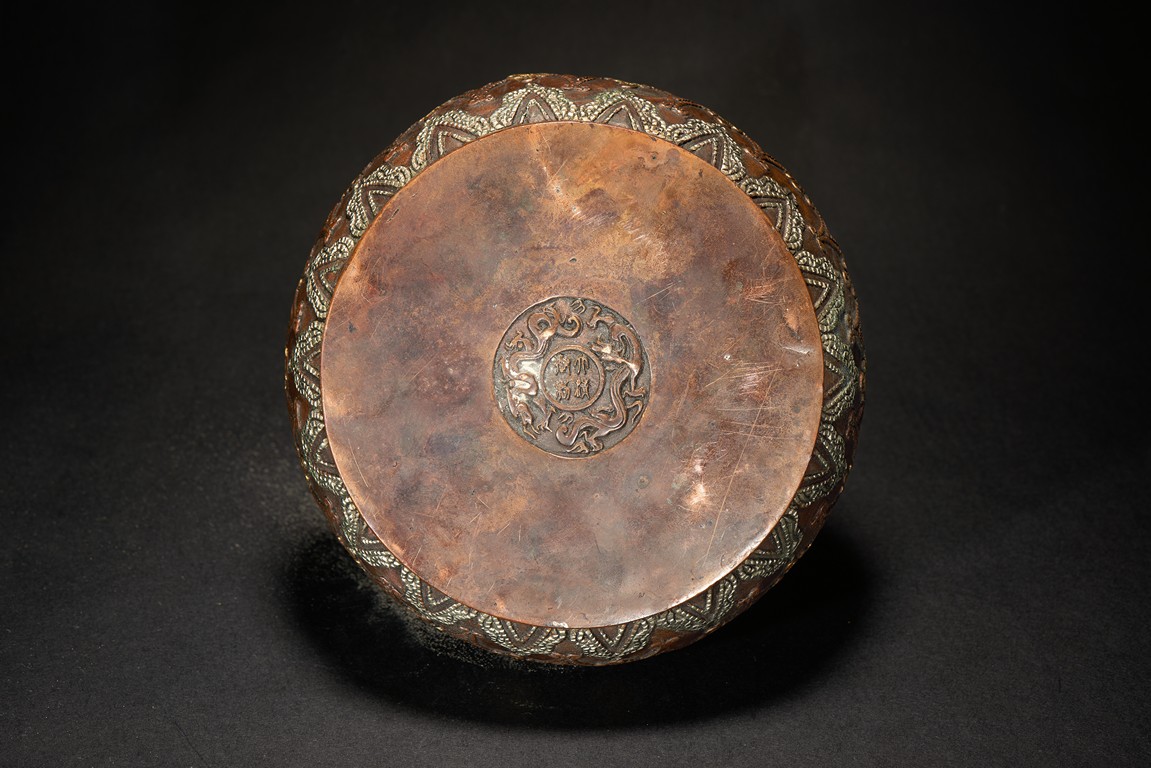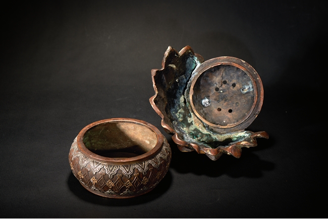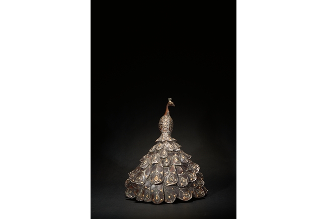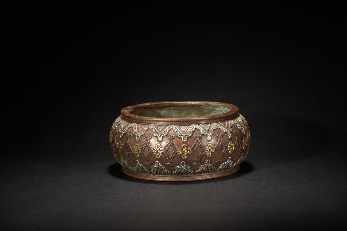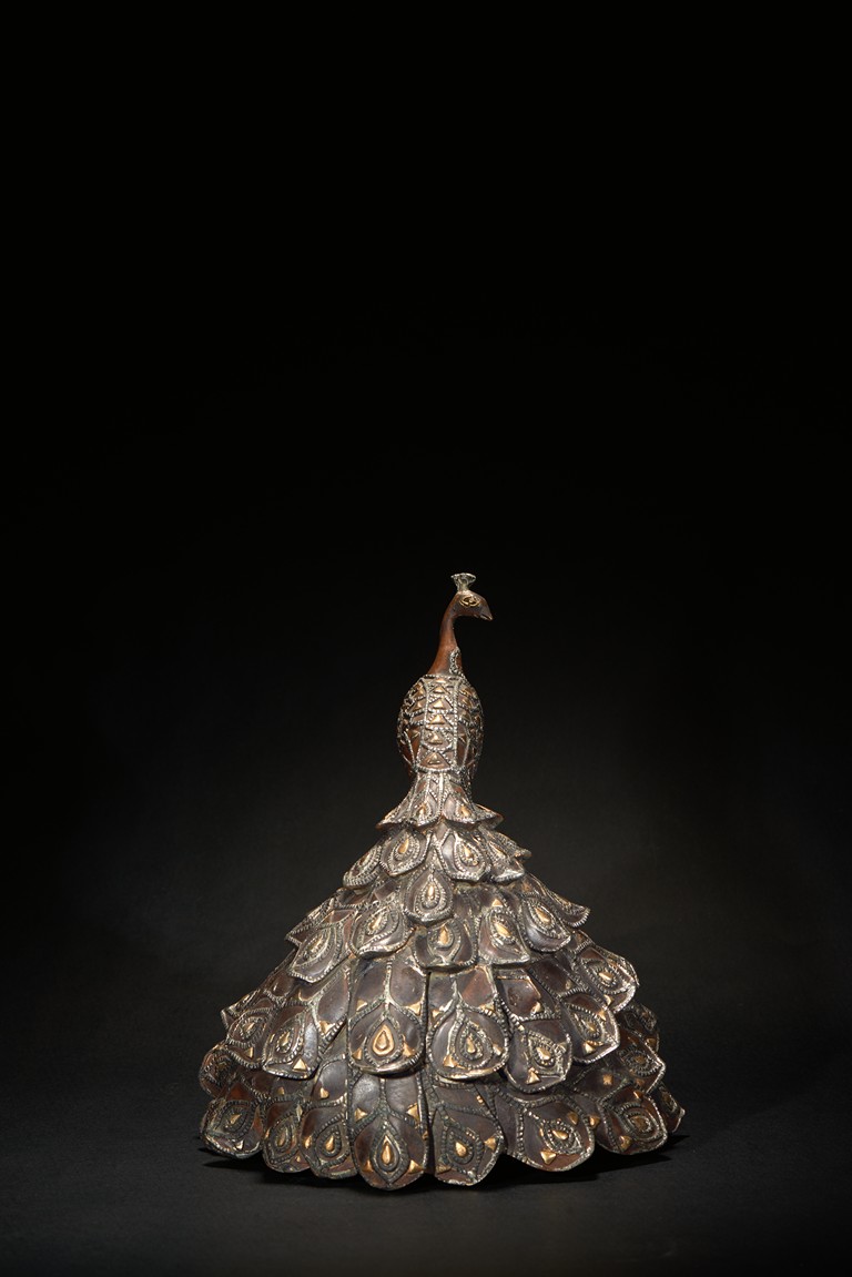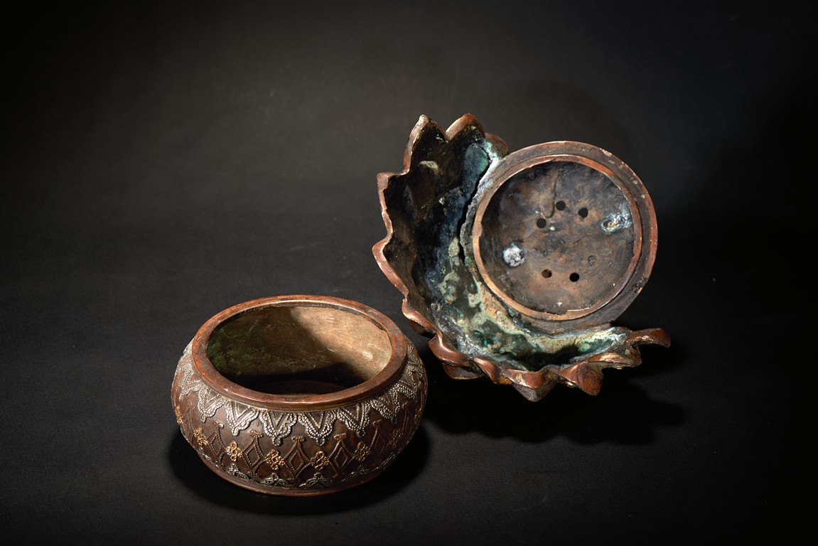 The censer body is of compressed globular form, the cover with a finely cast peacock standing upon arched handle as finial, with large tail swept downward, all decorated with silver and gold decoration. Qing Dynasty period.