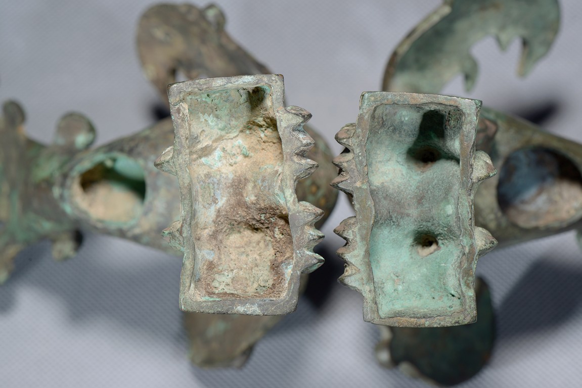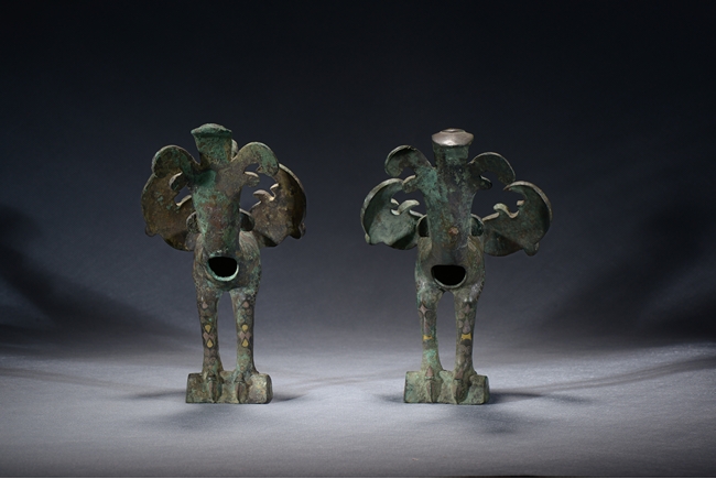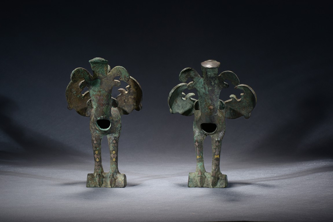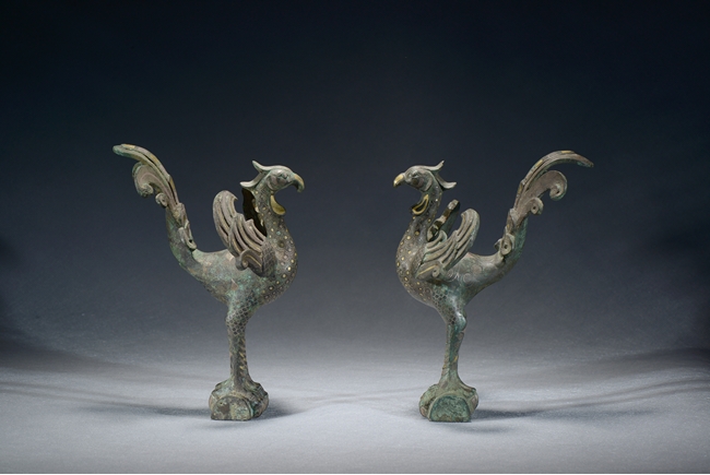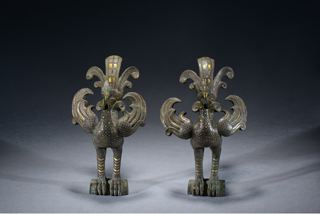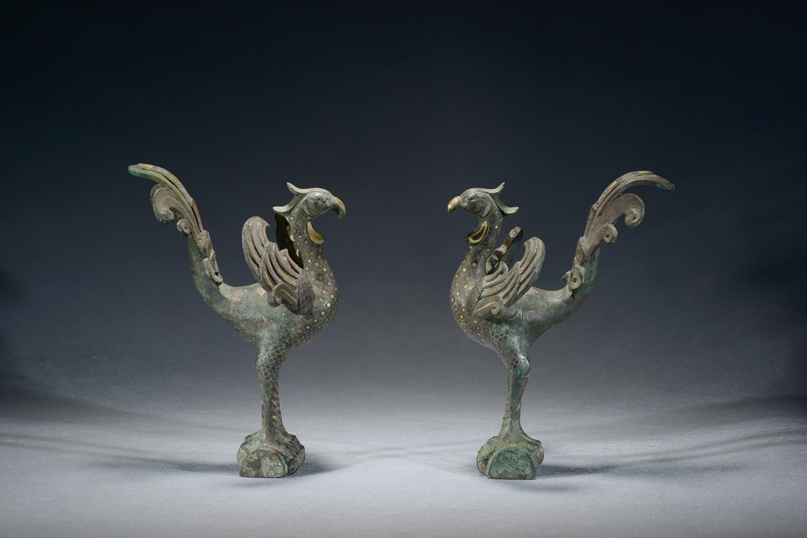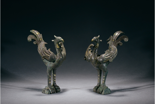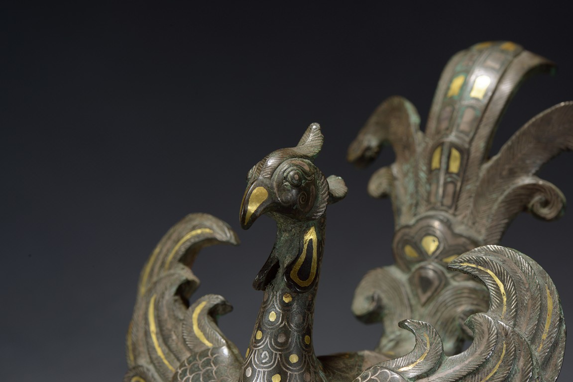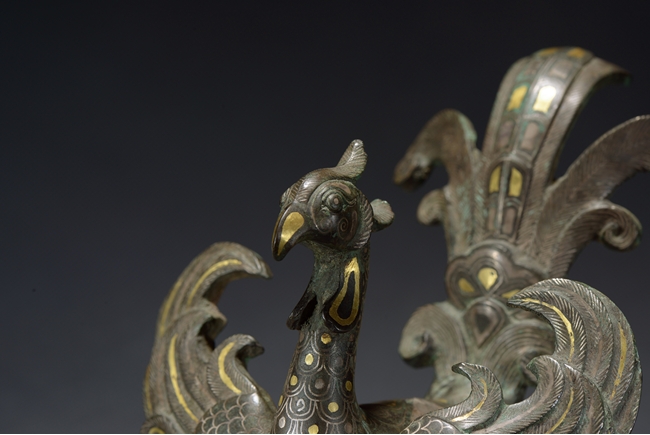 Each phoenix is shown standing upright, with wings upswept on either side, tail also swept upward, the exterior overall finely inlaid with silver and gold linings in geometric pattern representing the feathers, with areas of green and brown encrustation.Warring state period.