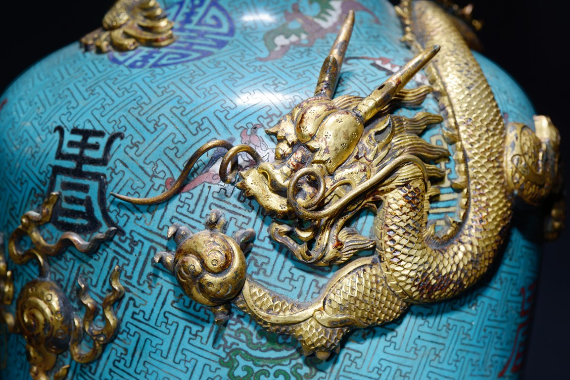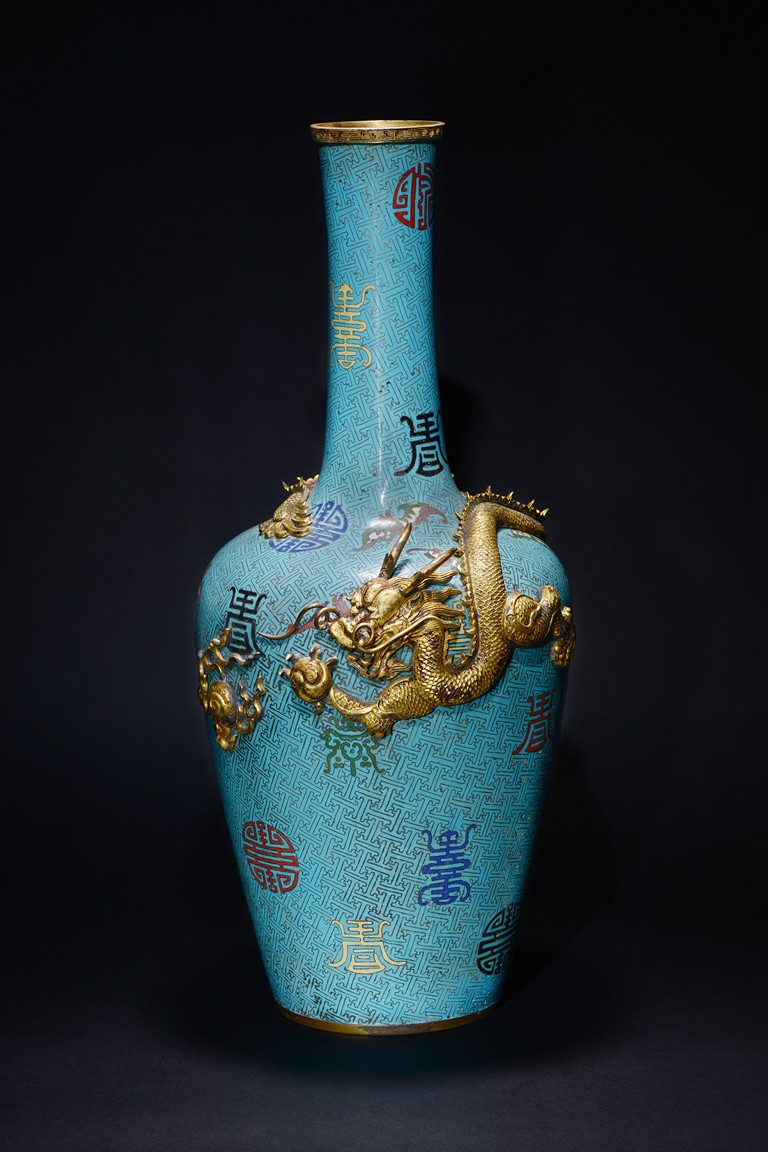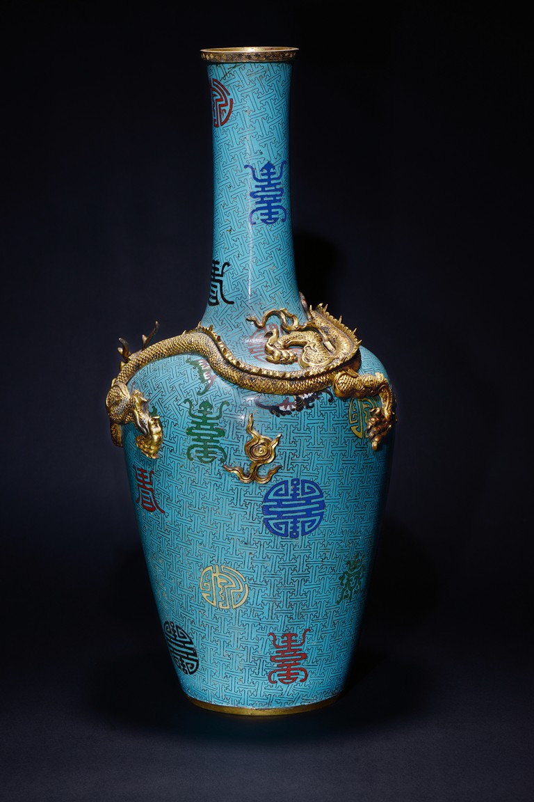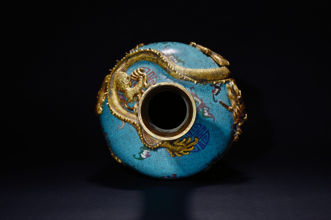 The vase is finely modelled with a powerful gilt-bronze dragon in chase of flaming pearl in high relief on the body, the exterior overall decorated with stylized shou characters and auspicious bats reserved on dense geometric pattern and turquoise ground. The base with four character QIANLONG mark.Qing Dynasty period.