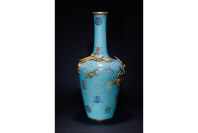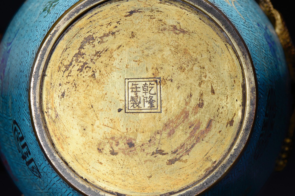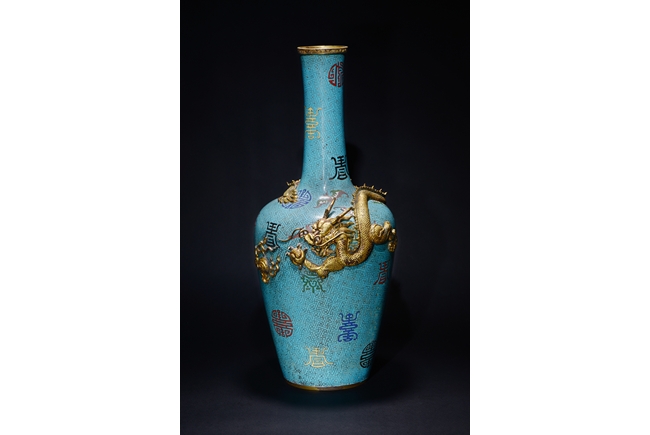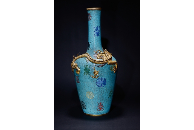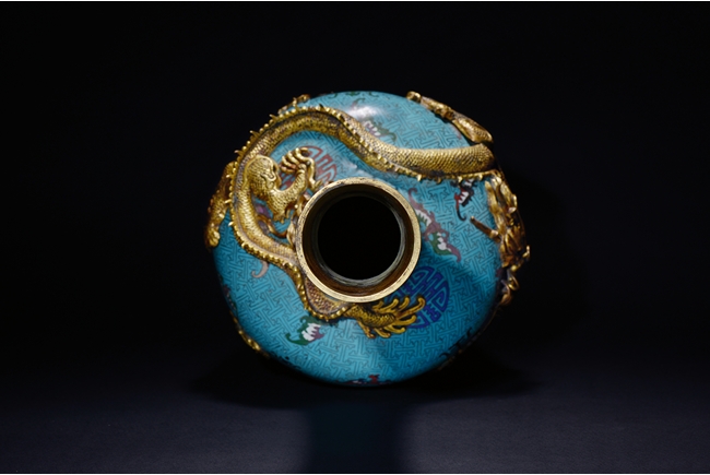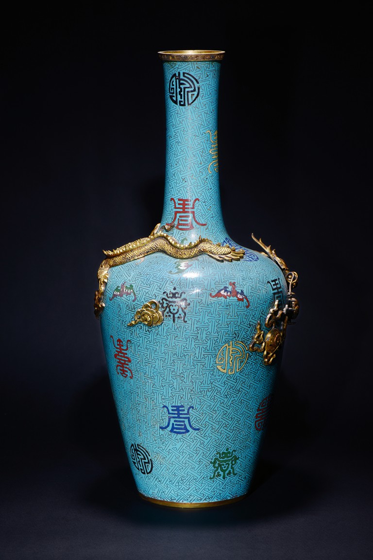 The vase is finely modelled with a powerful gilt-bronze dragon in chase of flaming pearl in high relief on the body, the exterior overall decorated with stylized shou characters and auspicious bats reserved on dense geometric pattern and turquoise ground. The base with four character QIANLONG mark.Qing Dynasty period.