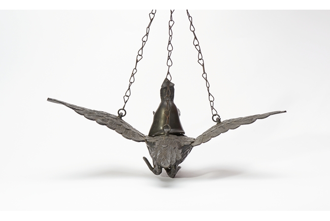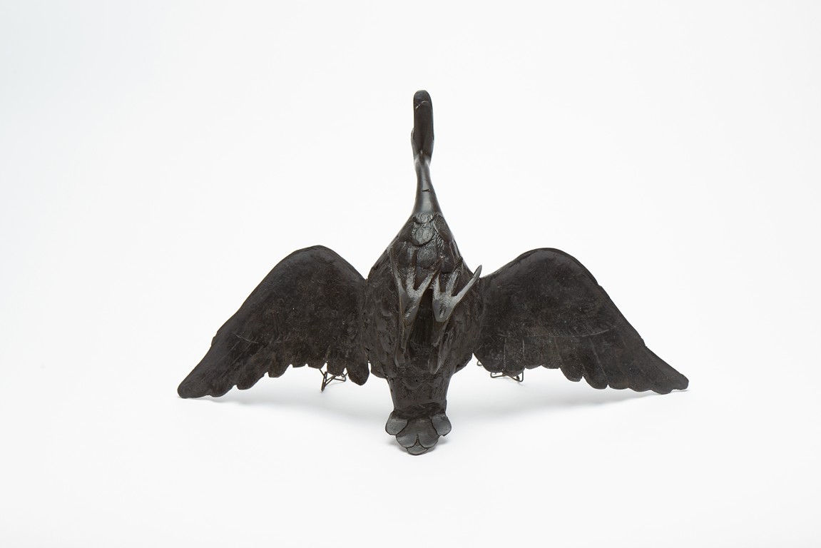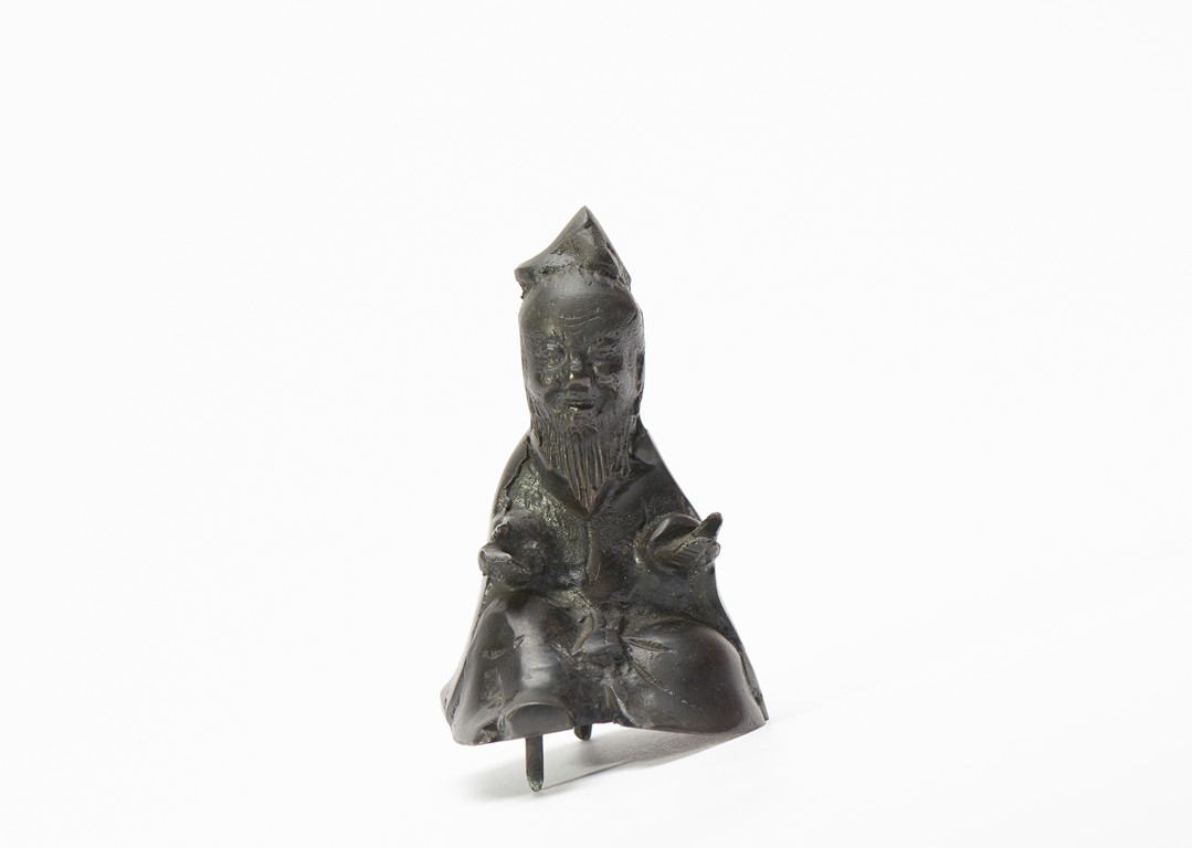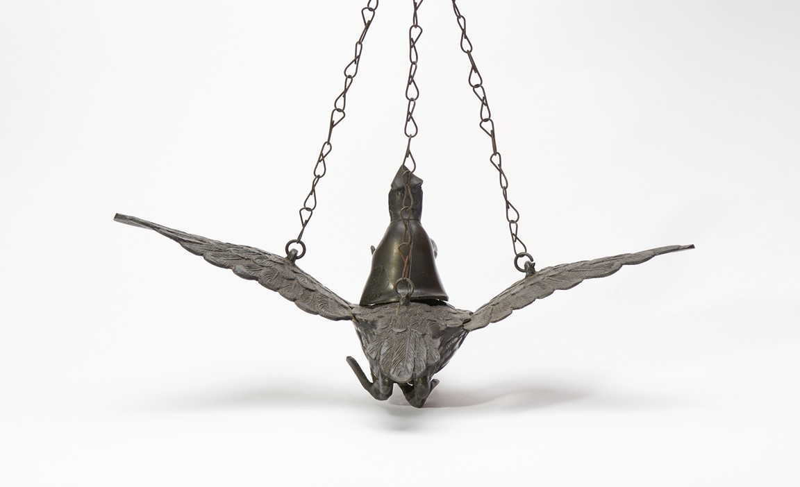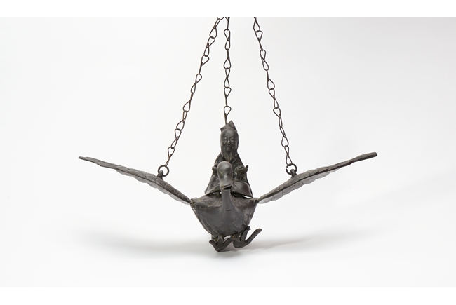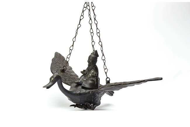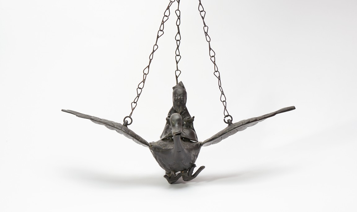 Modelled with an elderly immortal seated upon a crane as censer cover, the crane with swings open and upswept, with chains tied to the wings.Qing Dynasty period.