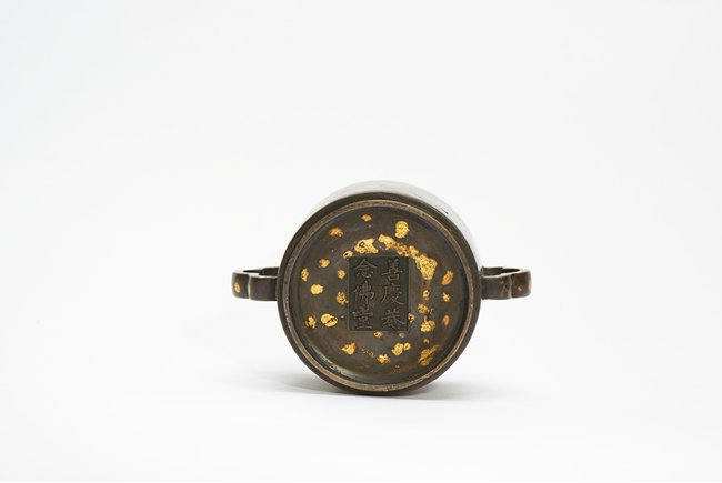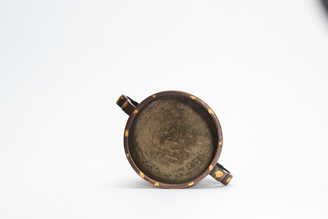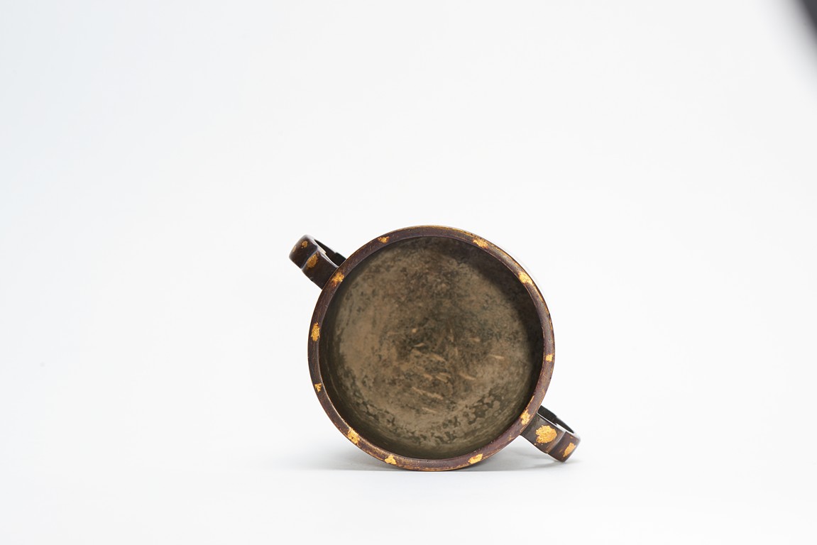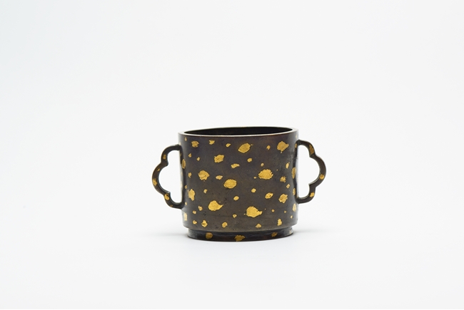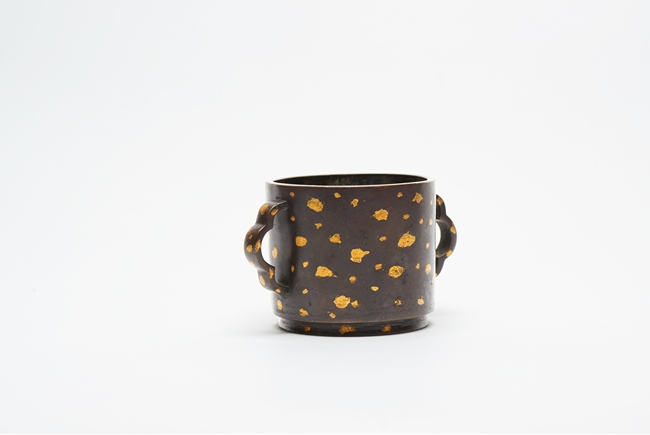 Of cylindrical form, the body with splashed gilt, flanked by two shaped arched handles, the base with six character 'shanqingyan lianfotang' mark in relief. Qing Dynasty period.