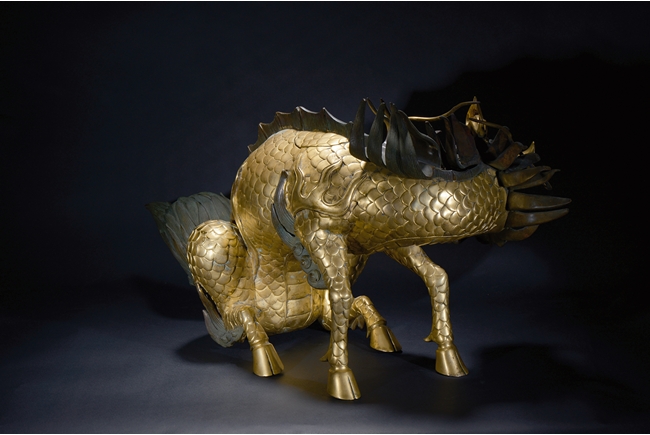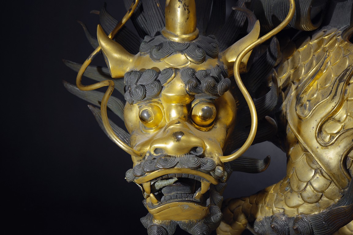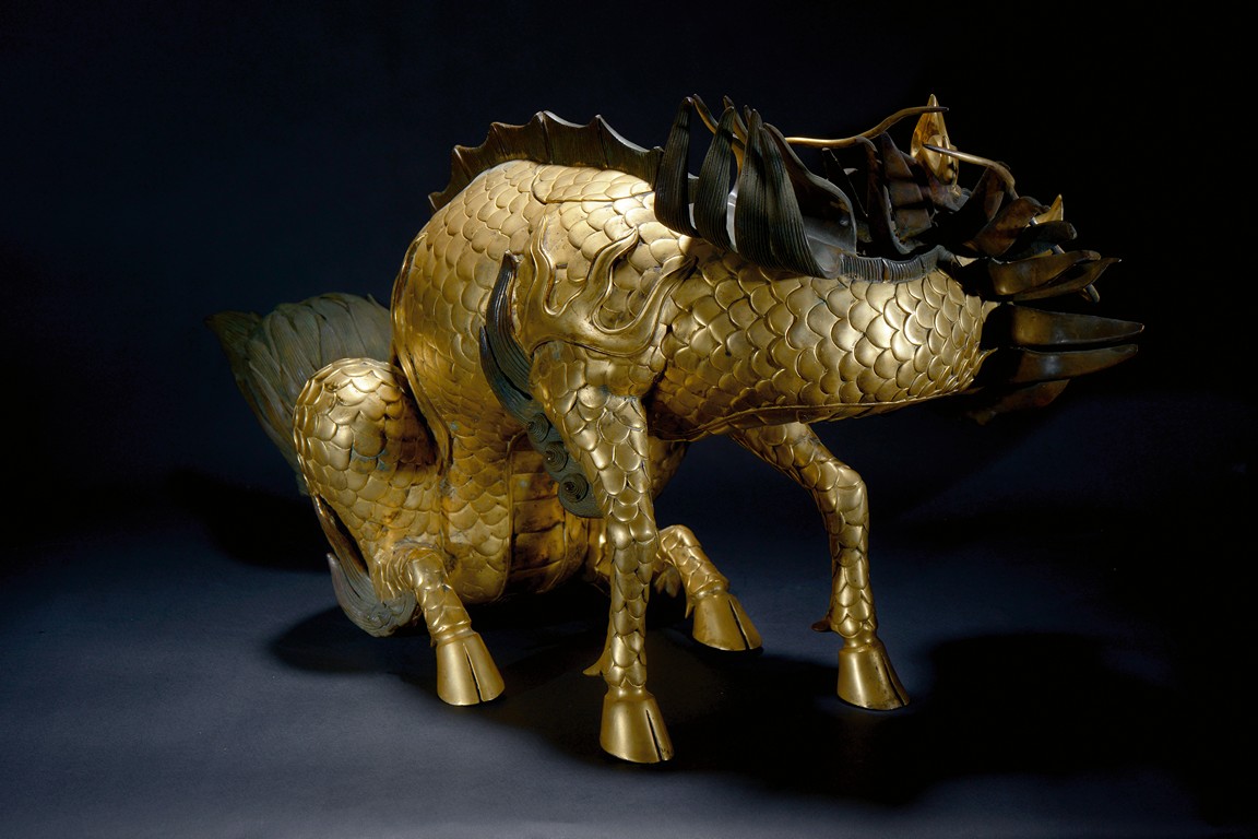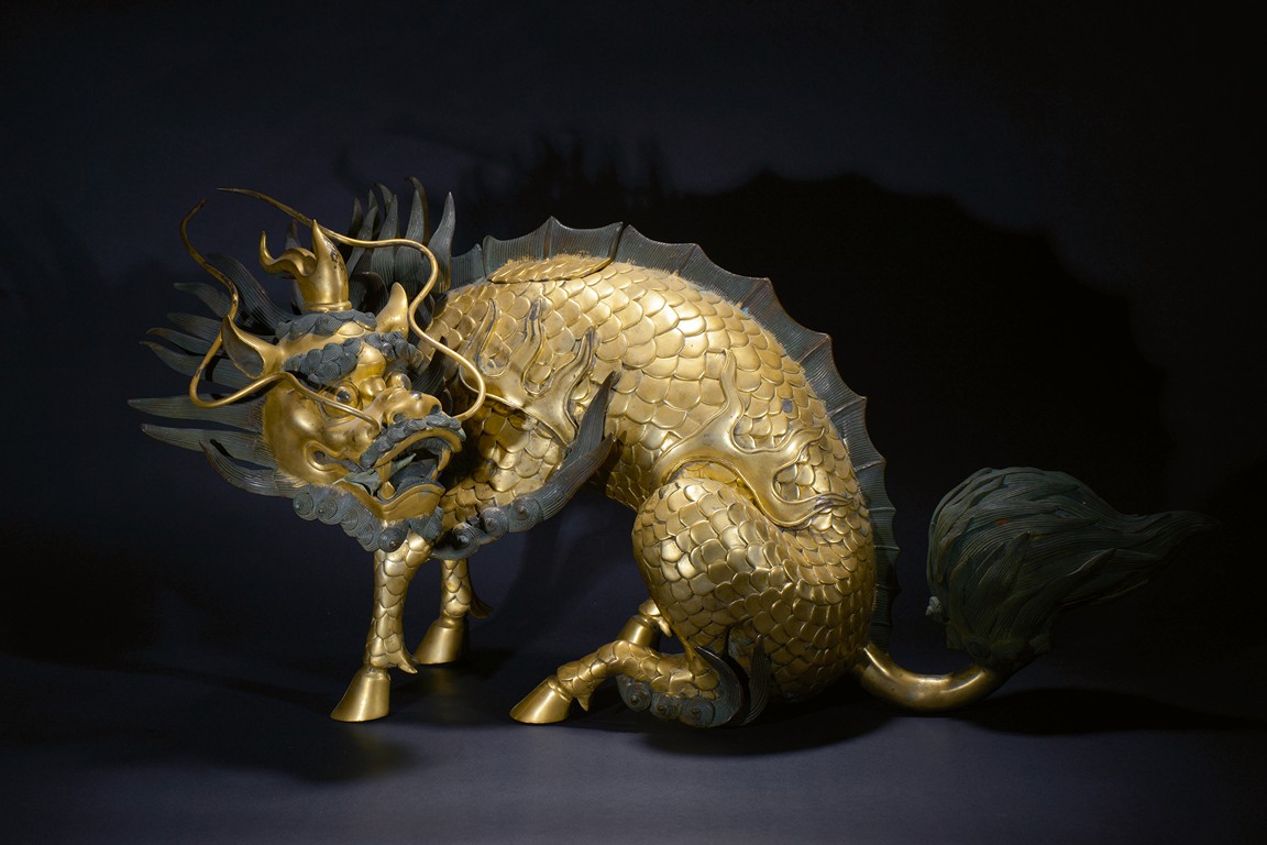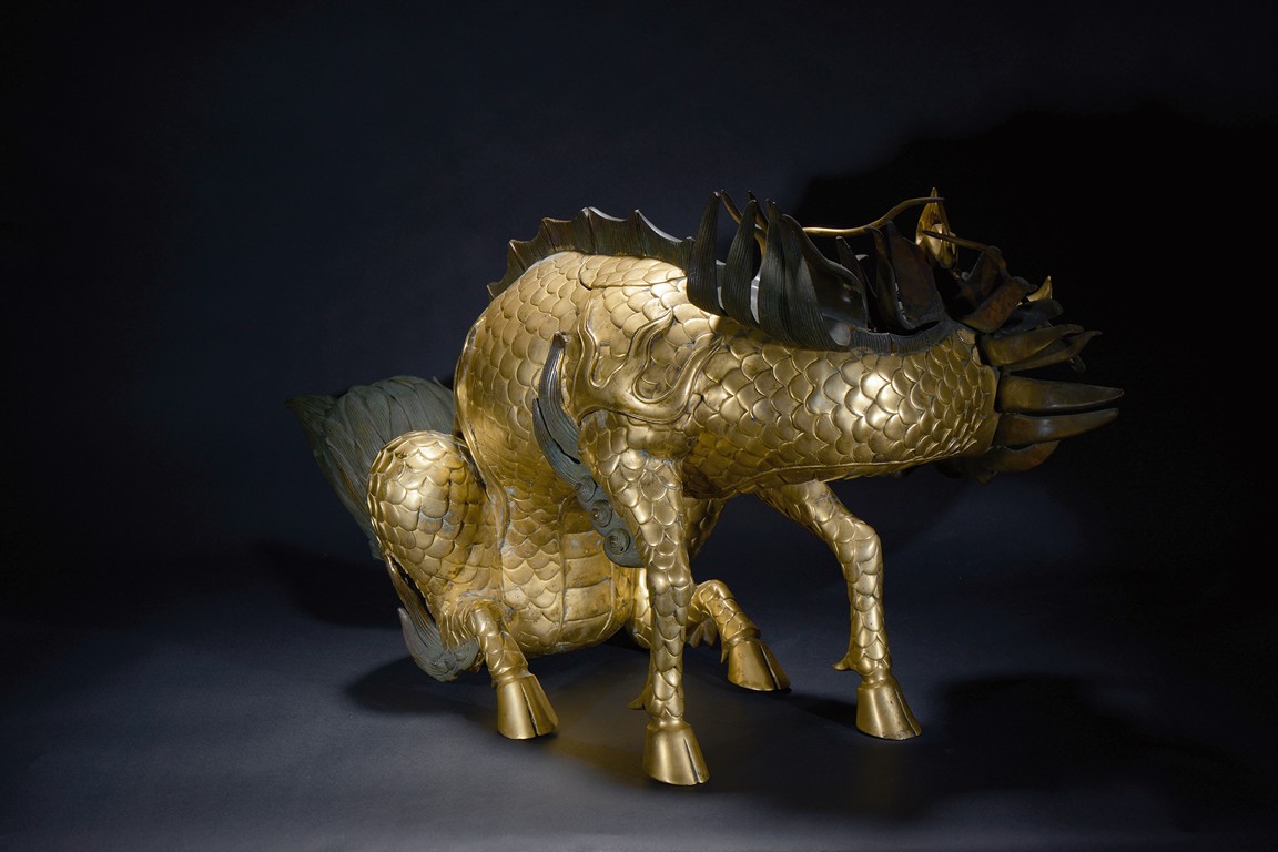 The censer is modelled as a qilin with head turned sharply to the side, with mouth agape in roar, with incised mane and tail, the scales on the body richly applied in gilt, the cover finely incorporated into its back. Qing Dynasty period.