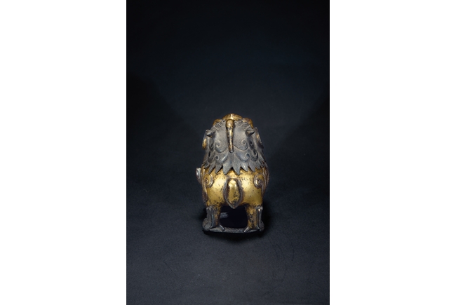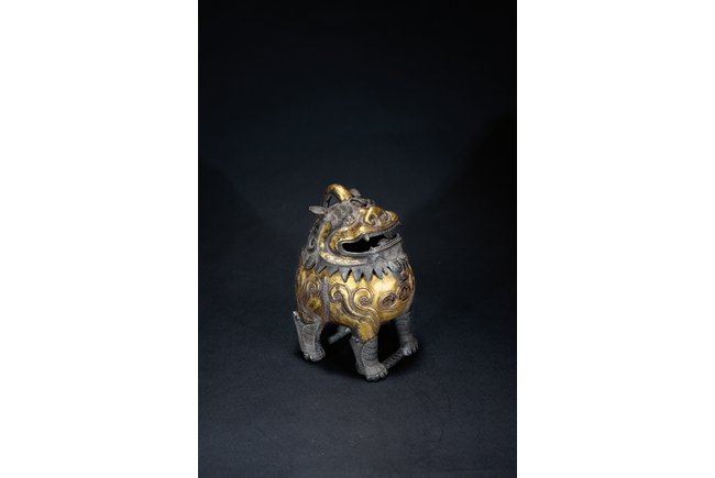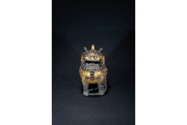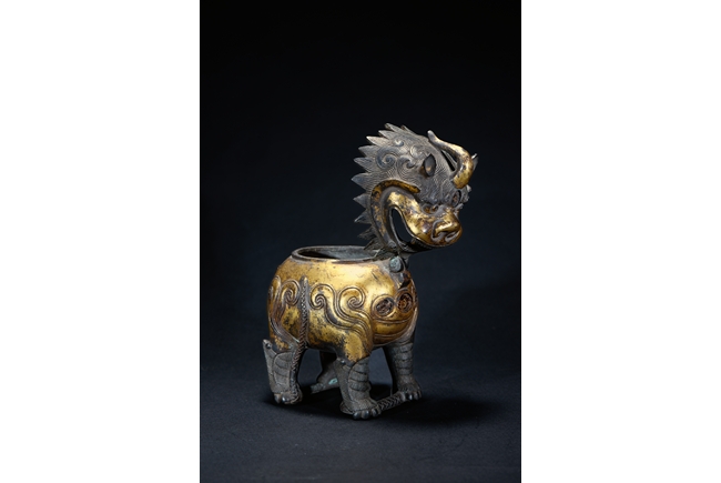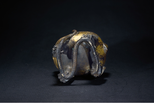The beast is cast standing foursquare on a snake which slithers up the body. The hinged head has an open mouth as cover, and is crowned by a horn rising above the bulging eyes. Qing Dynasaty period.