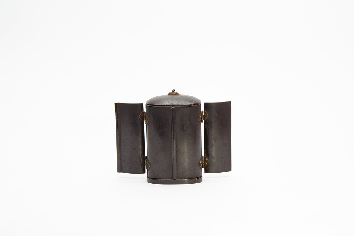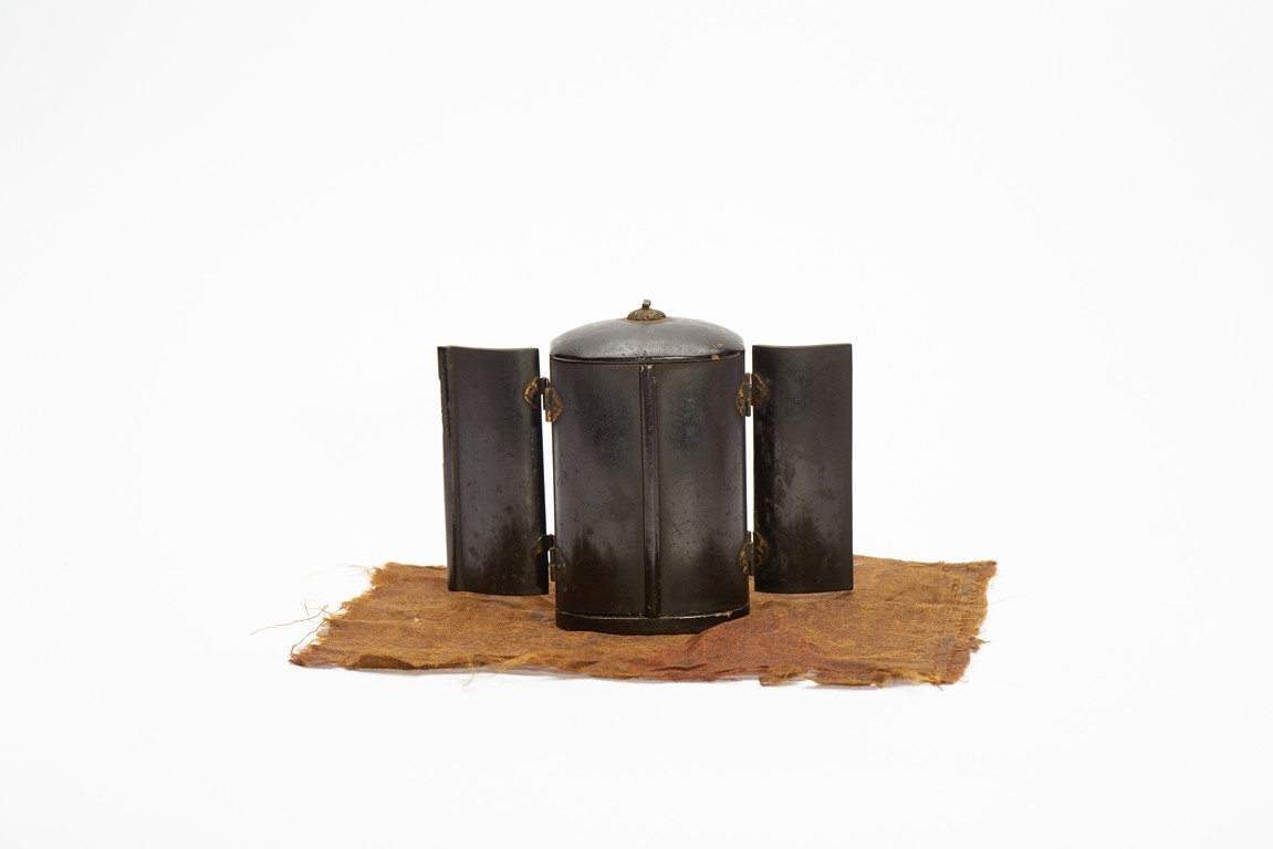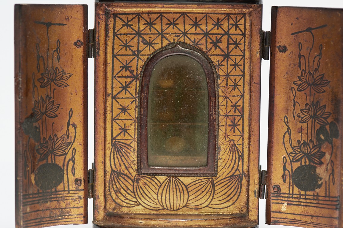 The group includes three sarira beads(Buddhist Relics), placed within a hardwood and golden lacquer display, the interior painted with lotus, the sarira beads shaped in ovoid form. Ming Dynasty period.
