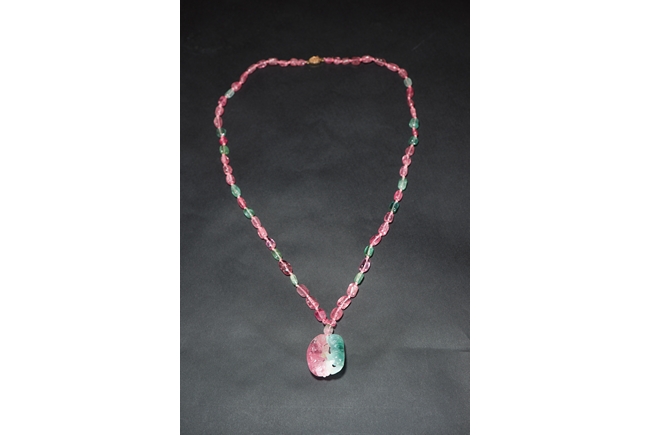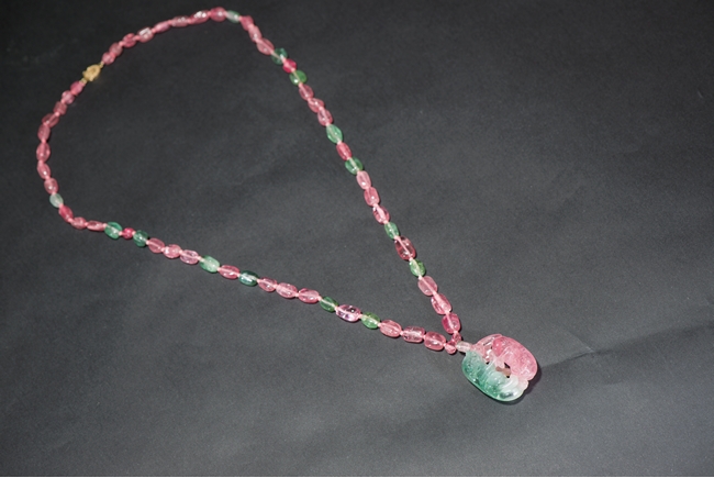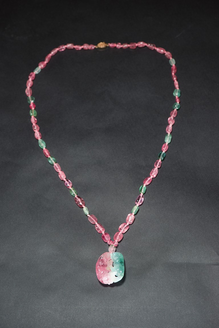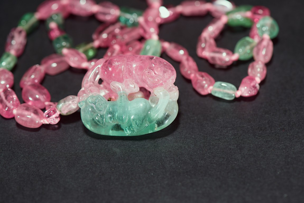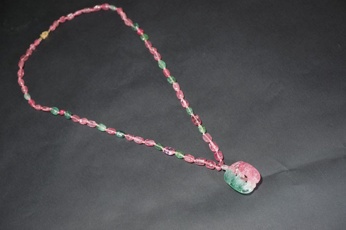 Comprising of pink and green tourmaline, the bead is of oblong form, the twin-cat pendant with both green and pink tone, the stone is of very good translucency. Qing Dynasty period.