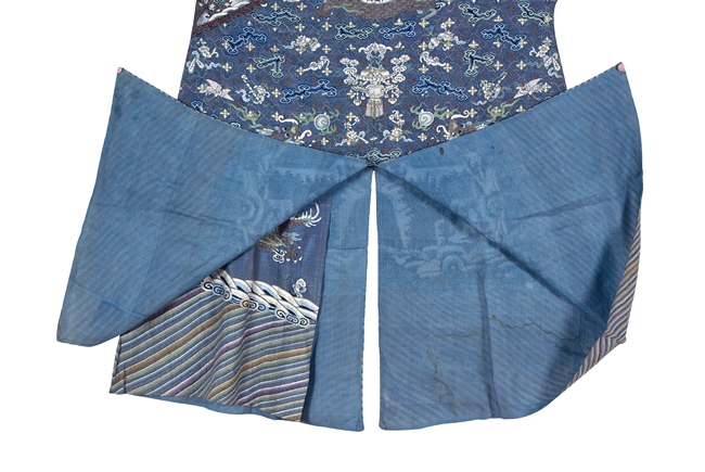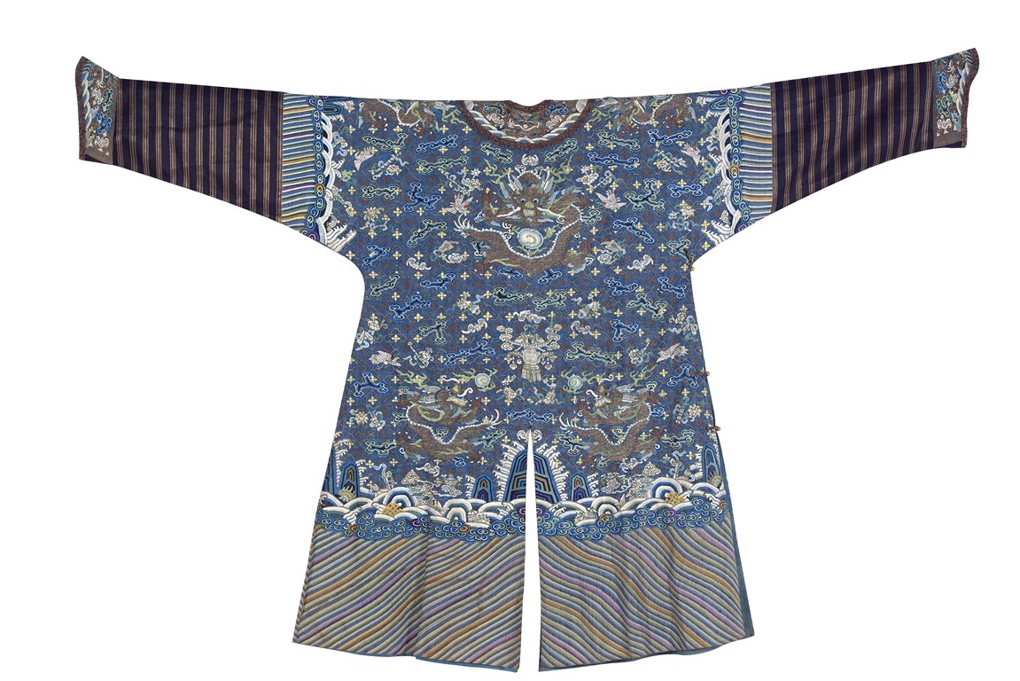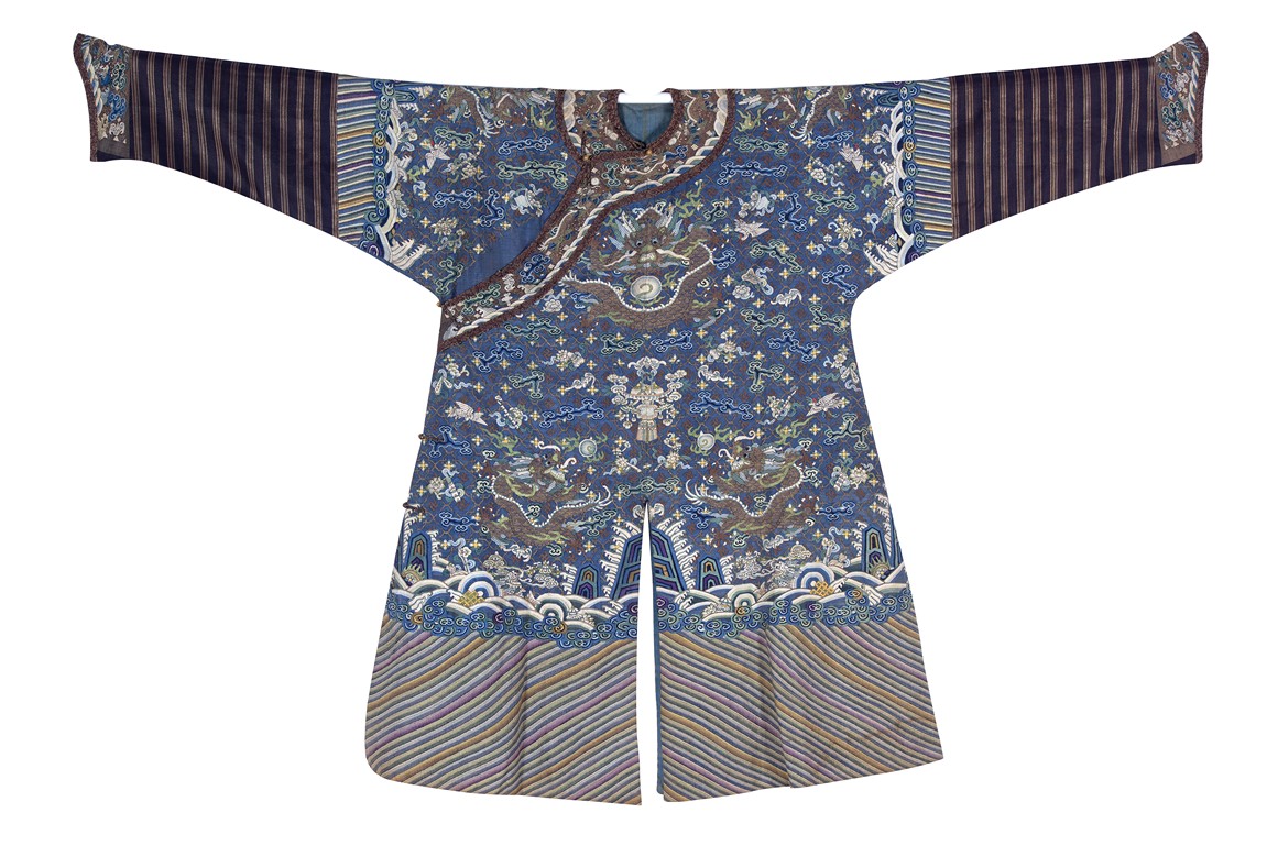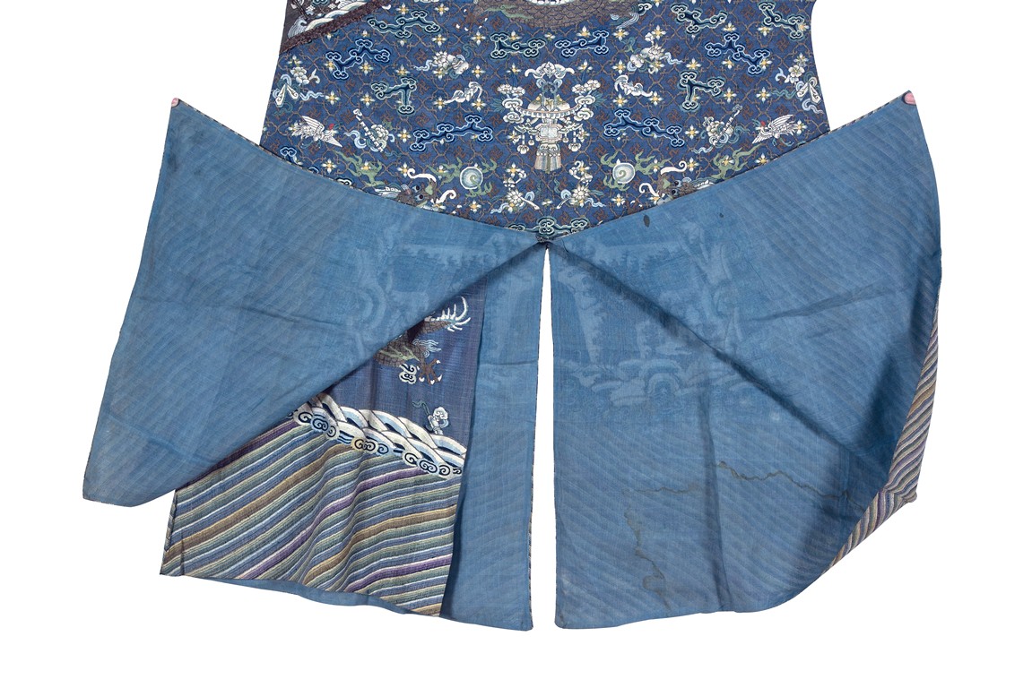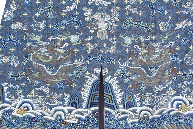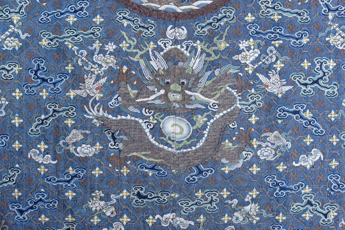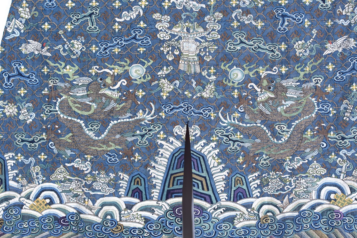The variously posed dragons woven in kesi and chasing flaming pearl on a busy ground of clouds, bats, cranes, and shou characters and auspicious objects in dark blue with green and purple details. Qing Dynasty period.