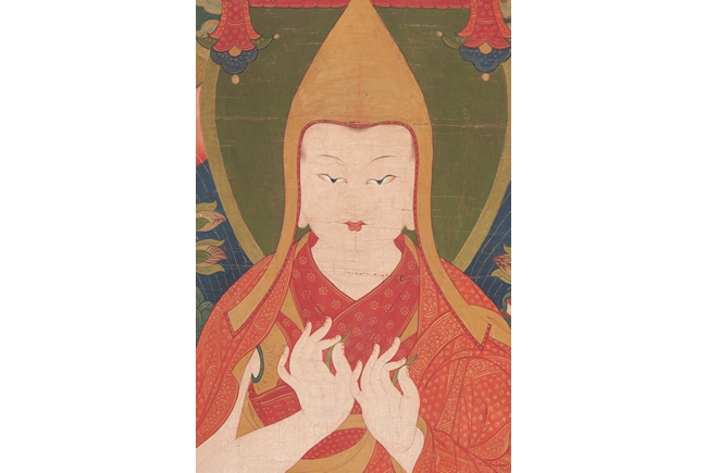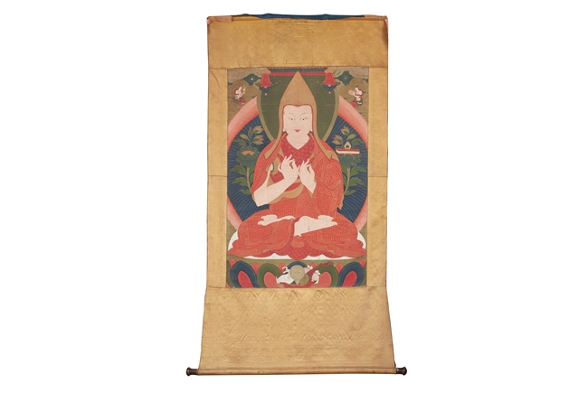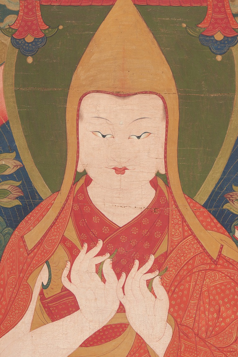 The Thangkha depicts Tsongkhaba seated upon lotus throne, hands raised in mutra, backed by an aureole, flanked by two fairchildren. Qing Dynasty period.