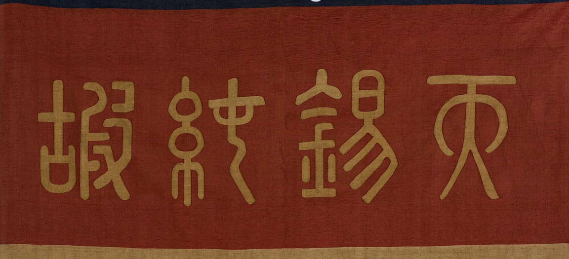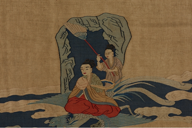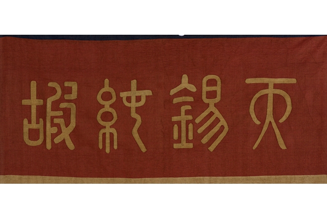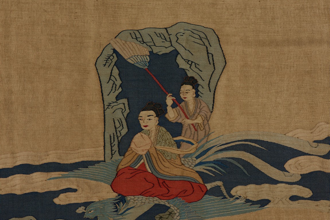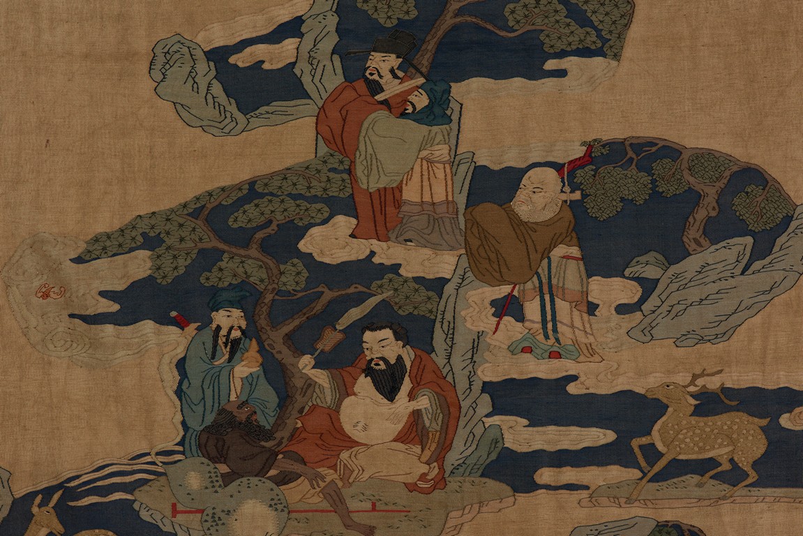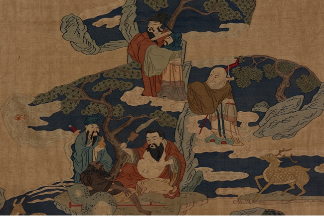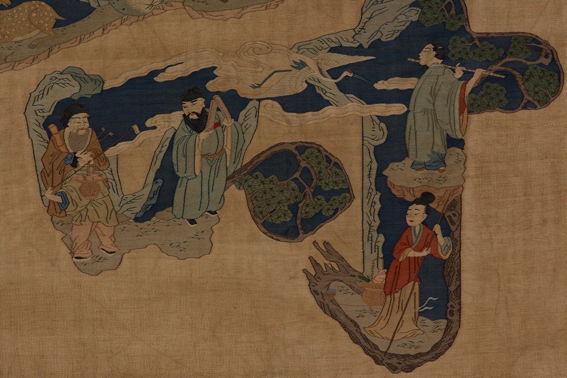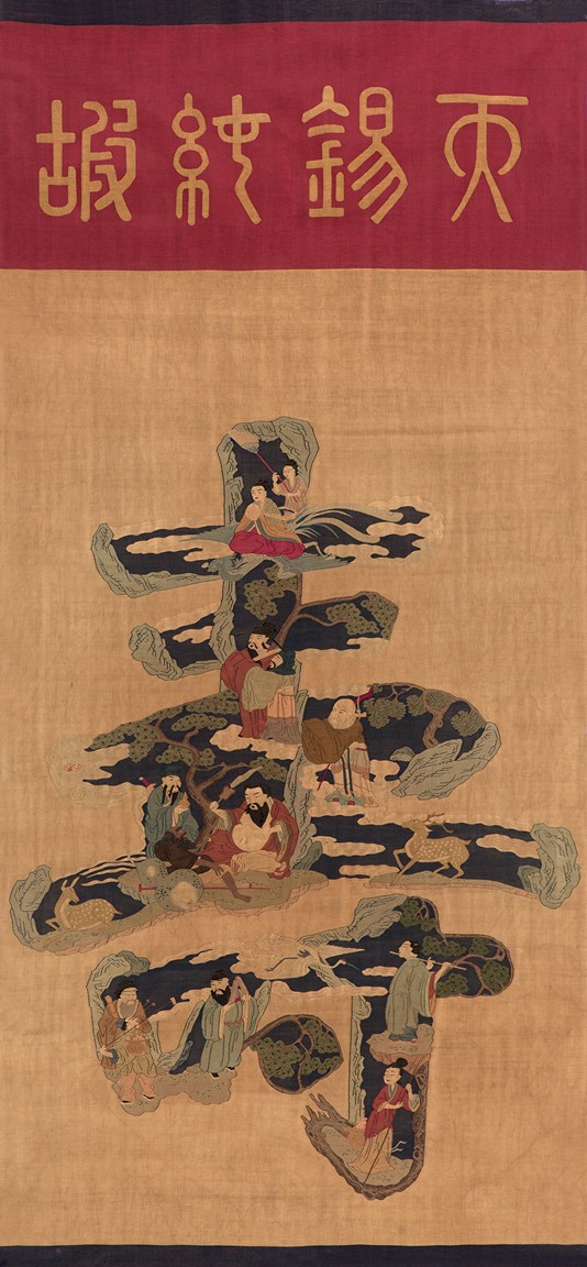 The panel finely woven to depict a shou character containing polychrome decoration of Taoist immortals upon clouds against blue ground, the upper side with four characters. Unframed. Qing Dynasty period.