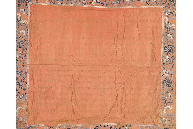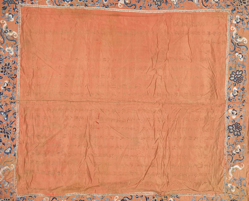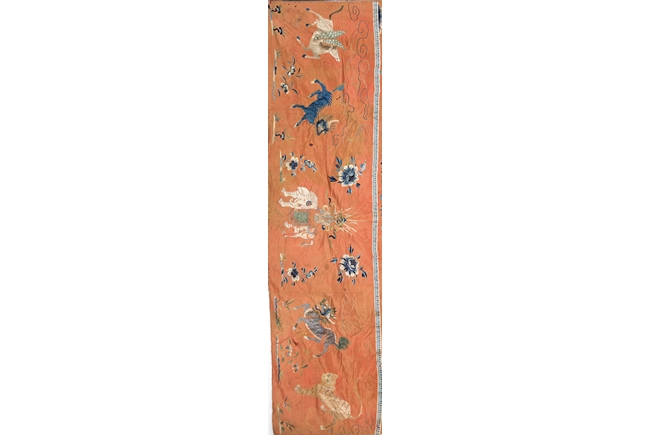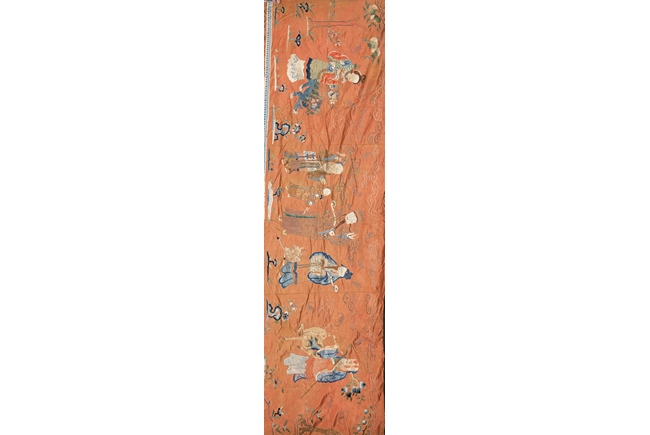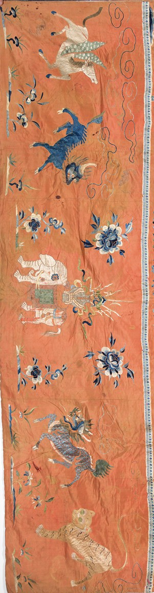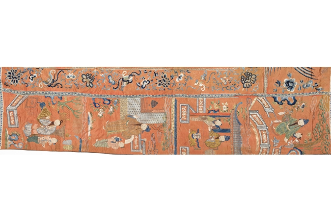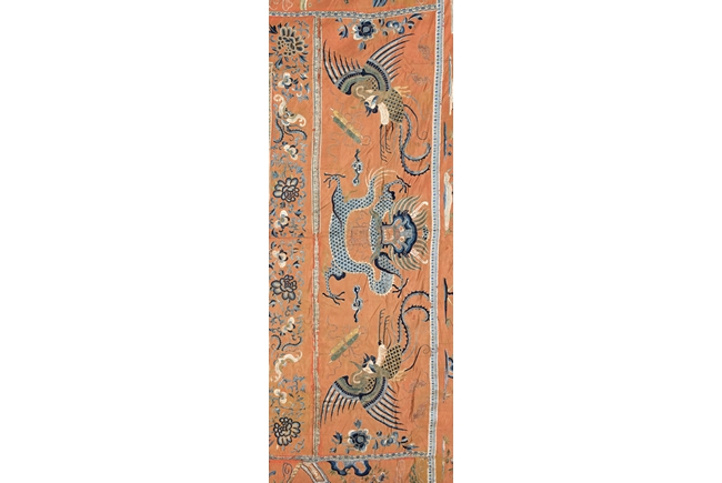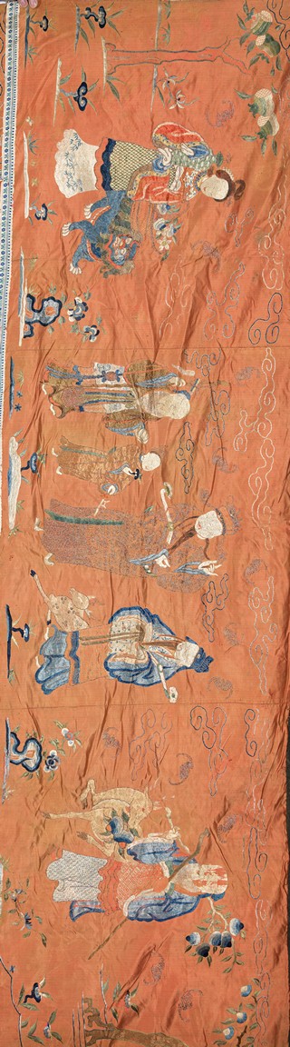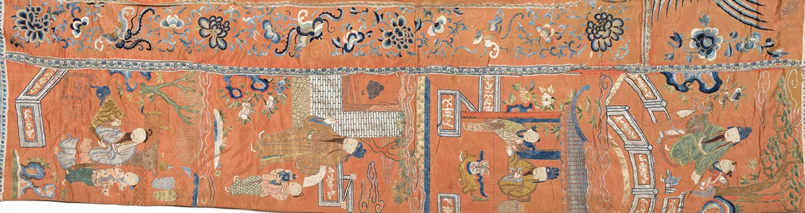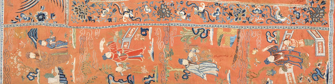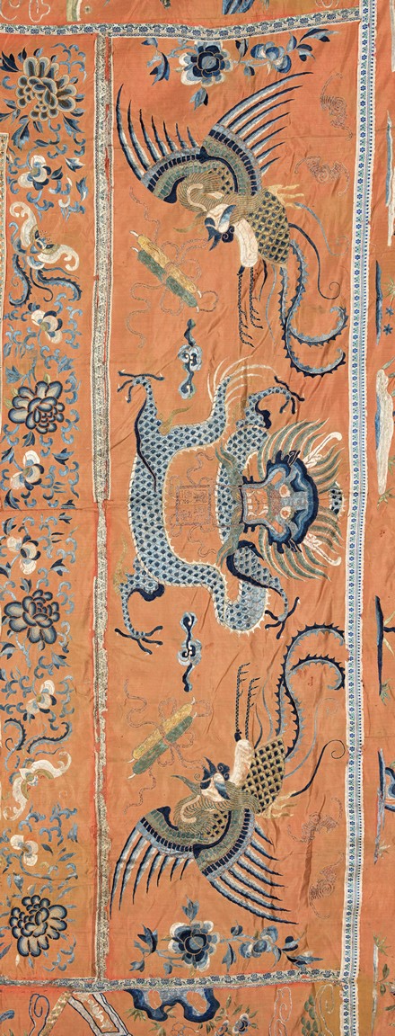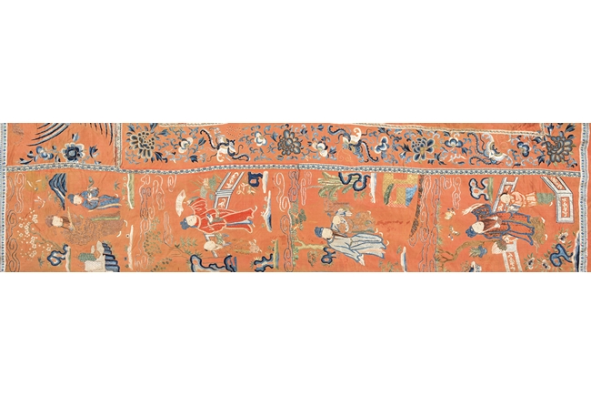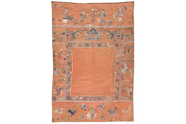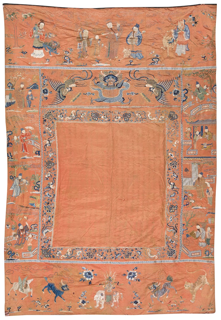 The panel finely depicts various figures and mythical beats to the outer margin, the inner margin woven with dragons and phoenix and floral scrolls, all delicately executed with polychrome against orange ground. Qing Dynasty period.