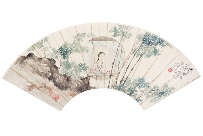 PAN ZHENYONG: A COLOR AND INK ON PAPER 'BEAUTY' FAN PAINTING 潘振鏞 扇面侍女 設色紙本
