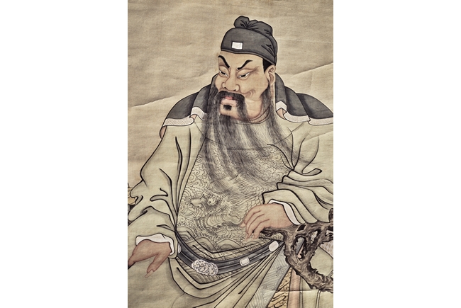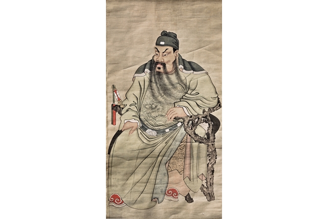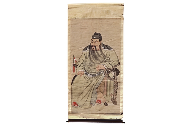 Ink and color on paper. Hanging scroll. With depiction of Guan Yu seated on wood chair, with long beard and stern expression.