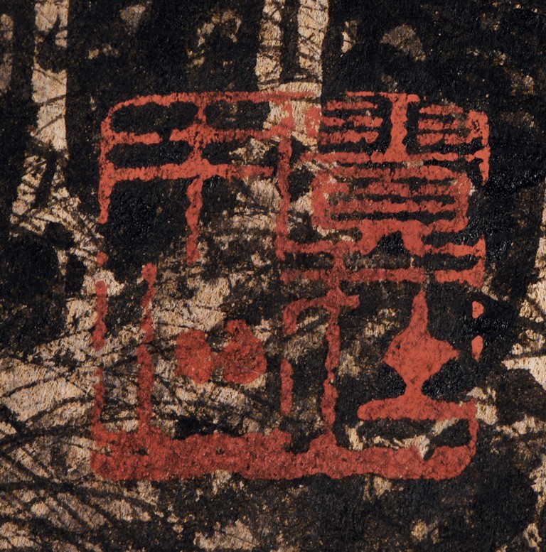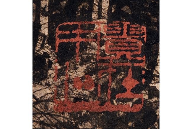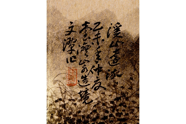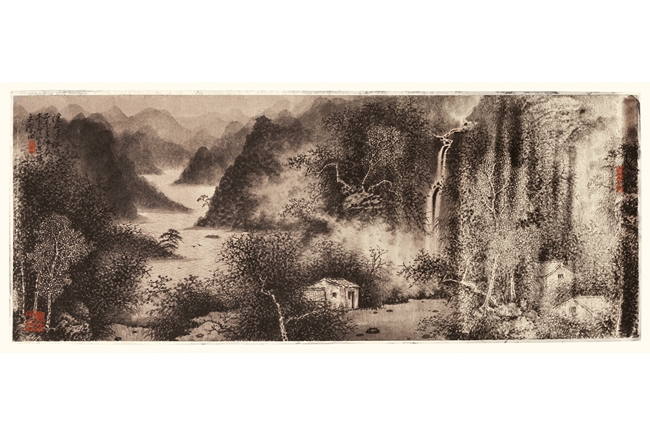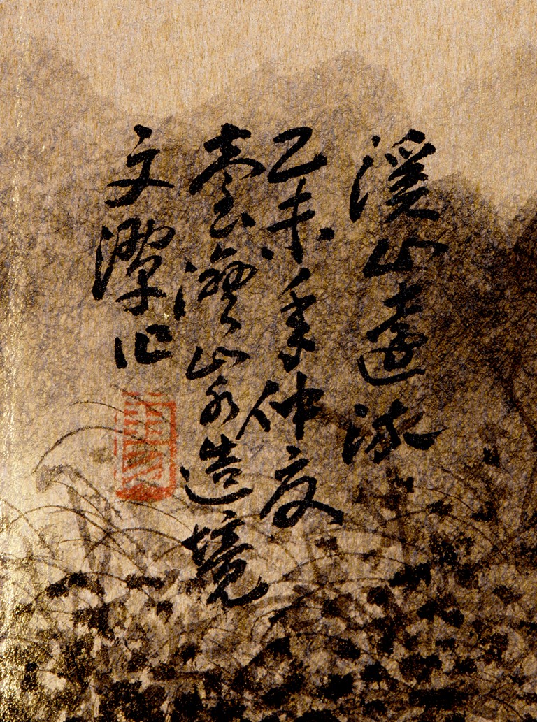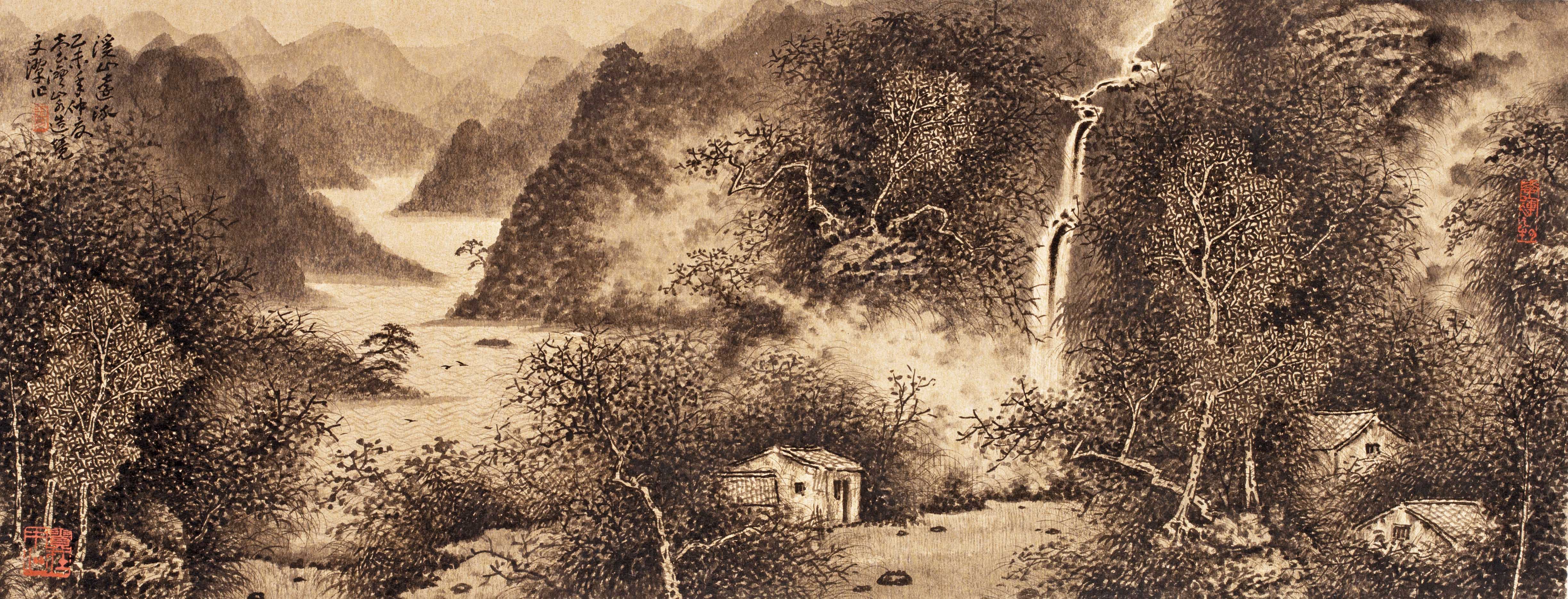 Depicting a horizontal riverside scene, the background with waterfalls and numerous hills. Inscribed, signed, and with two seals of the artist.