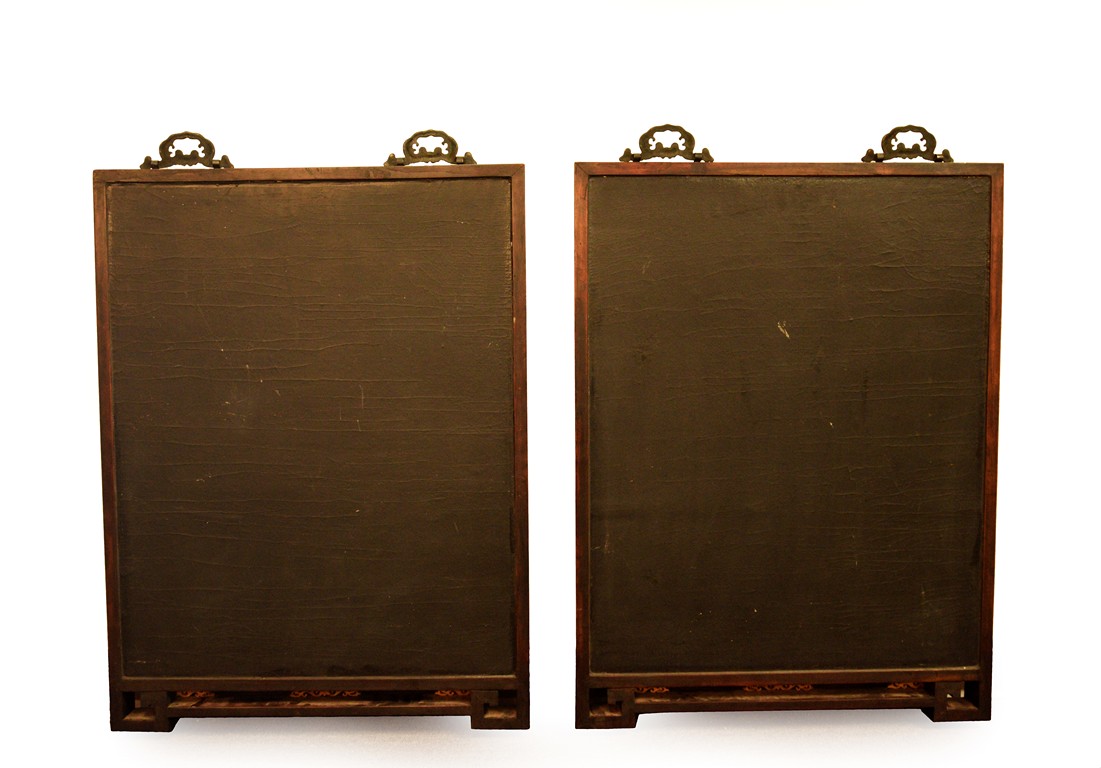 These hanging cabinet panels framed in zitan wood is each inlaid with various jades and hardstones to depict an ensemble of scholar's objects in a closet, including a spinach jade bowl containinga lapis lazuli rockwork, a agate and jadeite vase with implements, a gilt bronze cloisonne enamel censer, a jadeite elepahnt, and an agate and jade ruyi with lapis lazuli carved silk tassel, etc, all against ochre lacquer ground and fixed with a gilt bronze hanging bracket. The borders of the interior closet is exquisitely carved with colored frames in open works of scrolling foliage patterns.