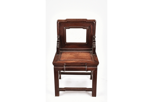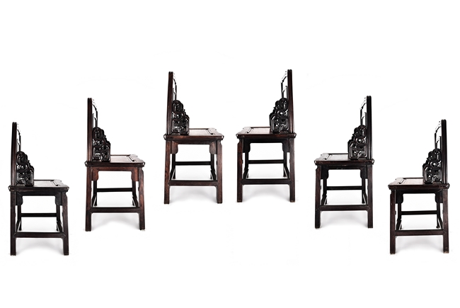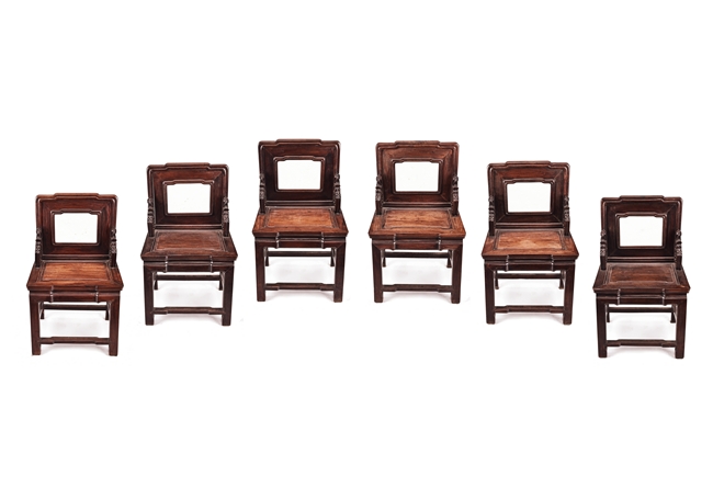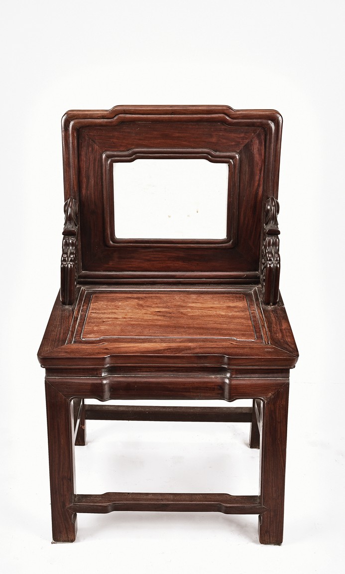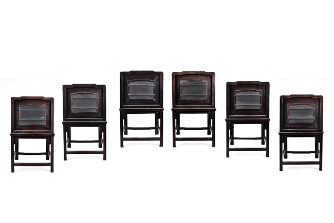 Each chair with scroll form chilong arm, the back inset with rectangular marble panel, with recessed waist, the legs joined by stretchers. Qing Dynasty period.