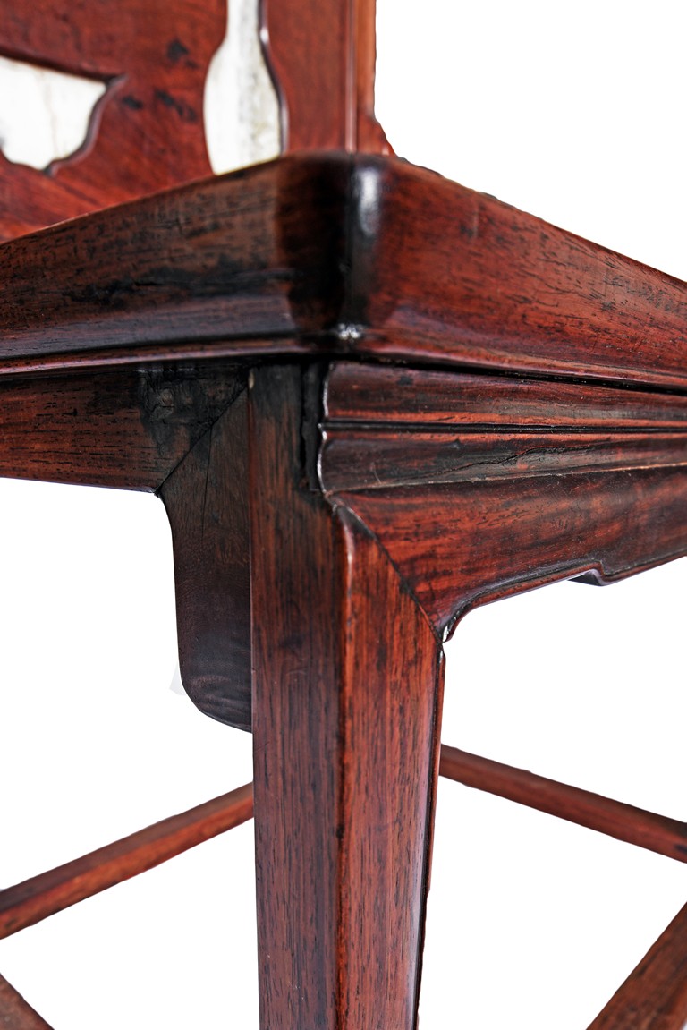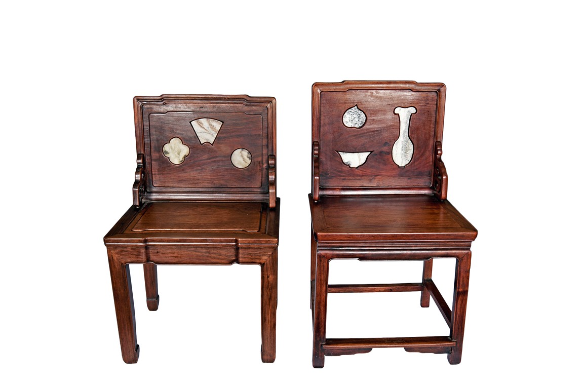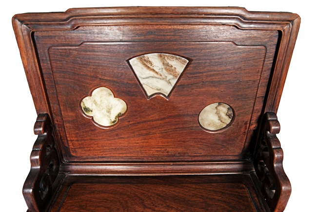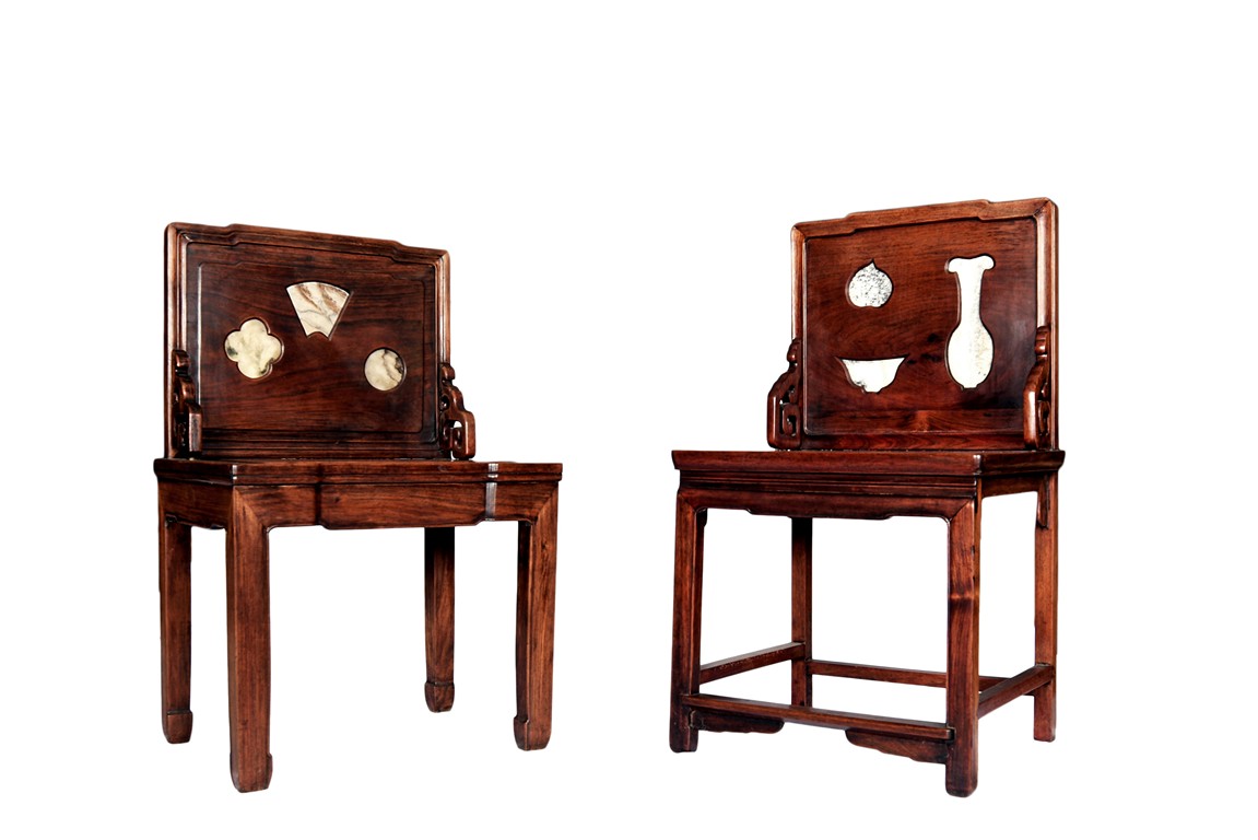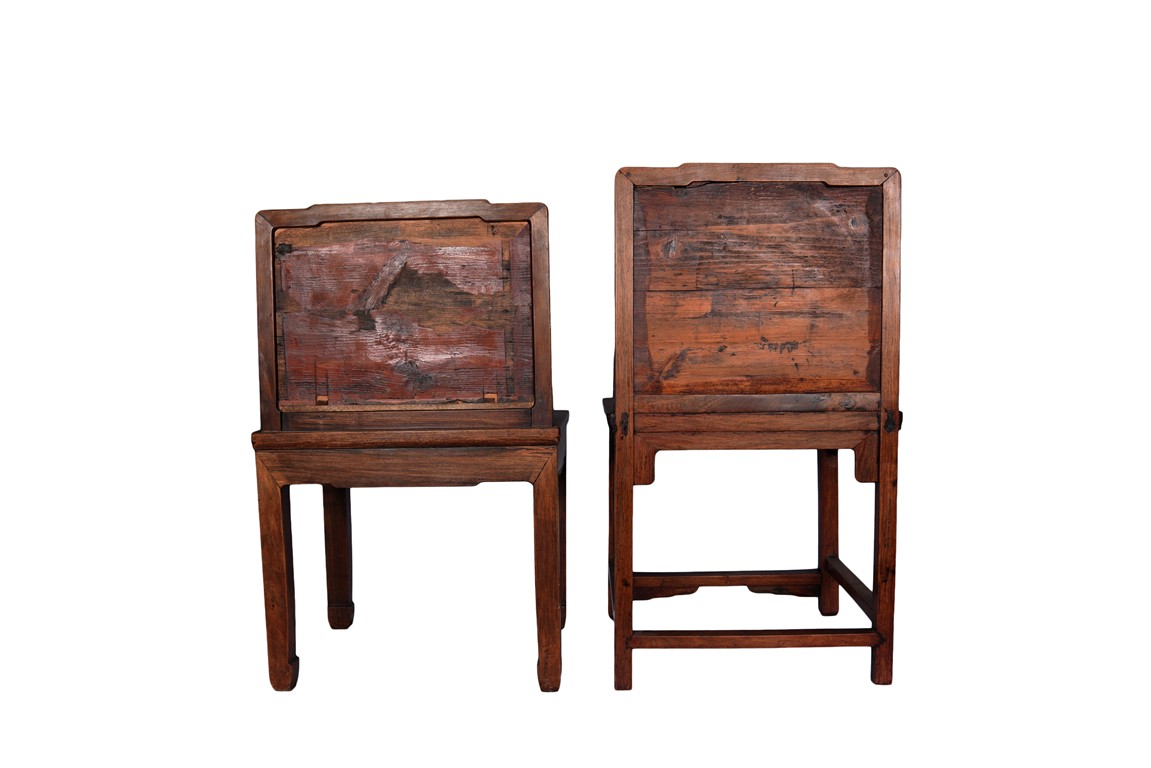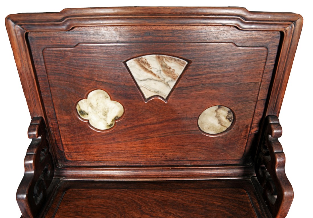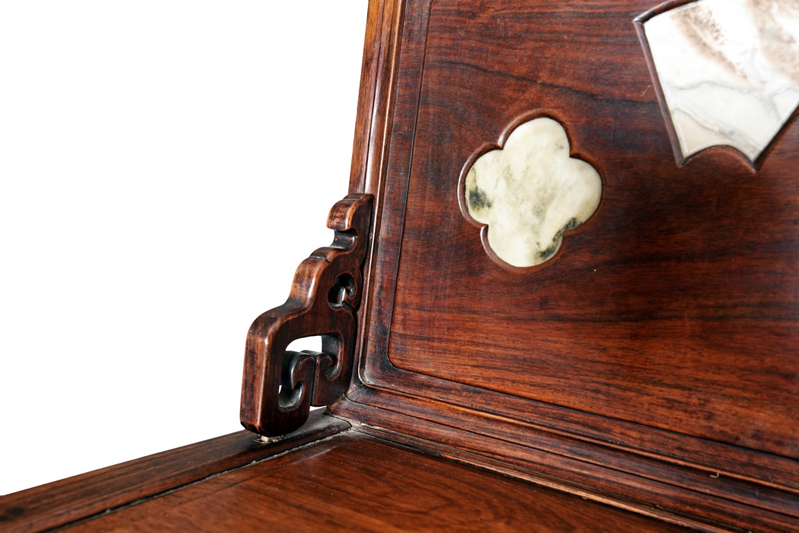 Each backrest inlaid with three shaped marble panels, the panelled seat above beaded apron, one supported by square legs terminating in hoof feet, the other supported by four square feet joined by stepped stretchers. Qing Dynasty period.