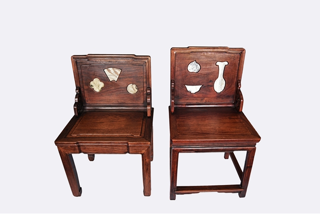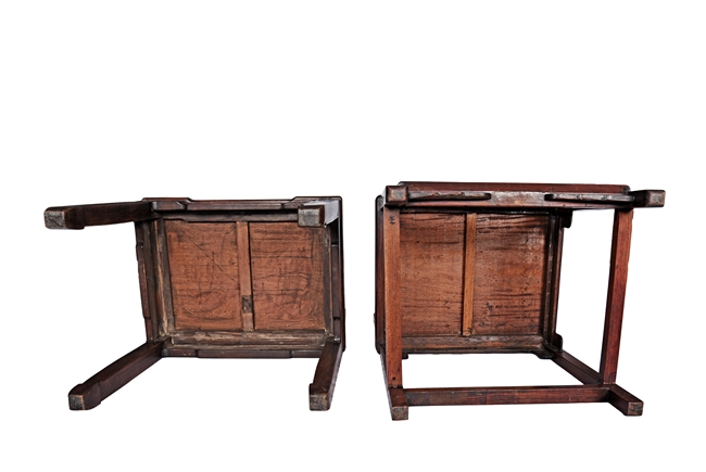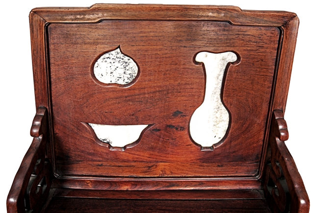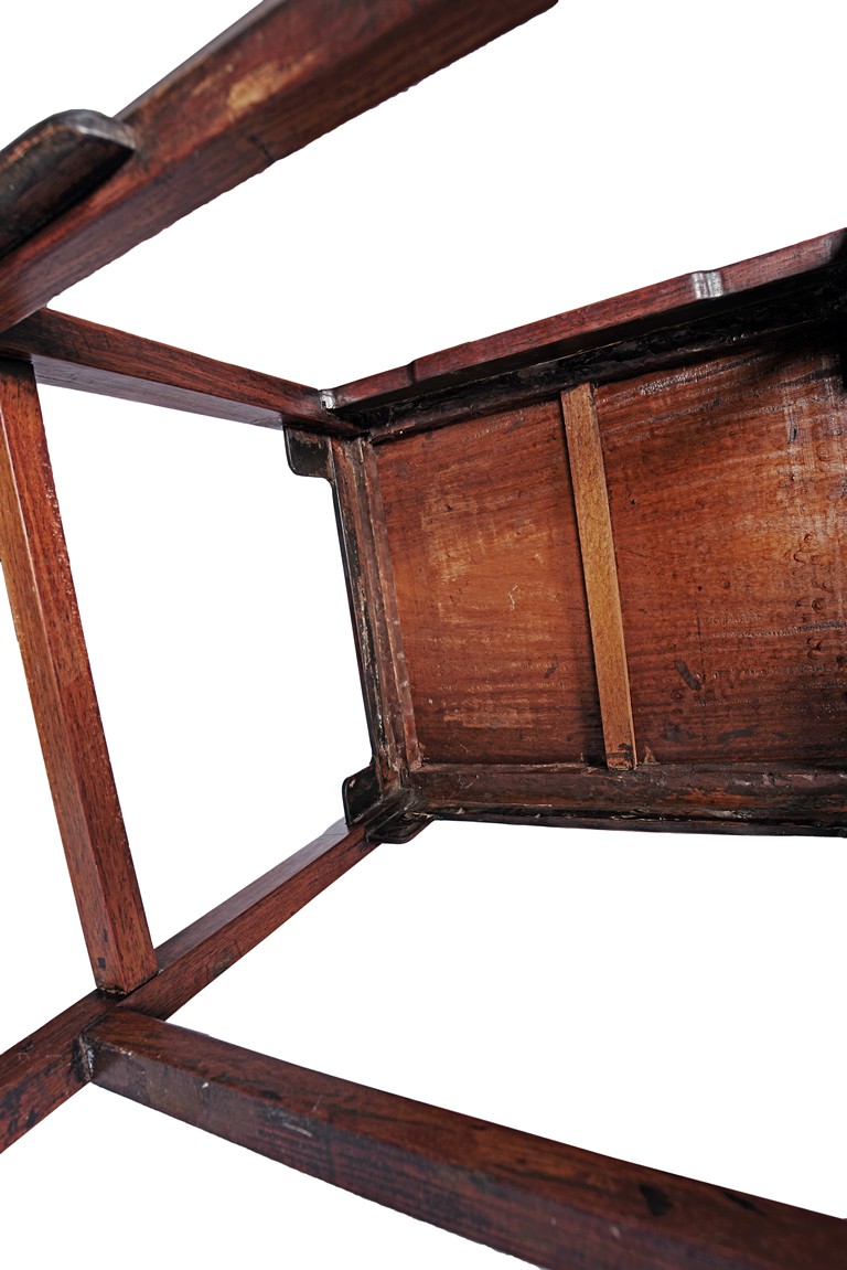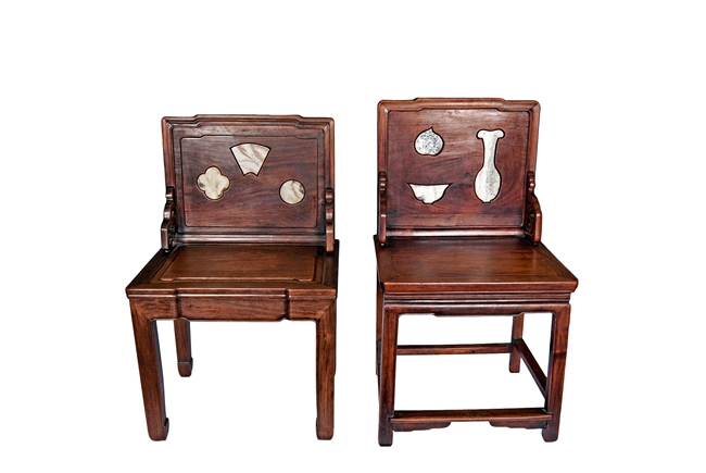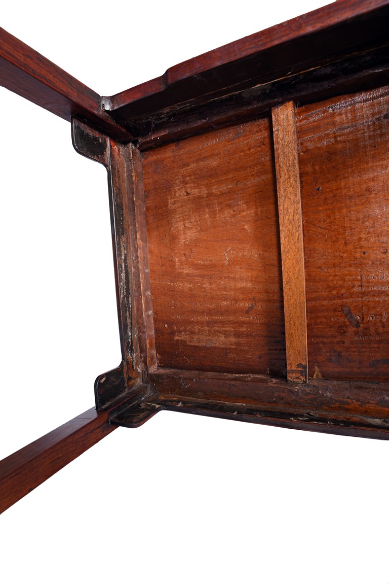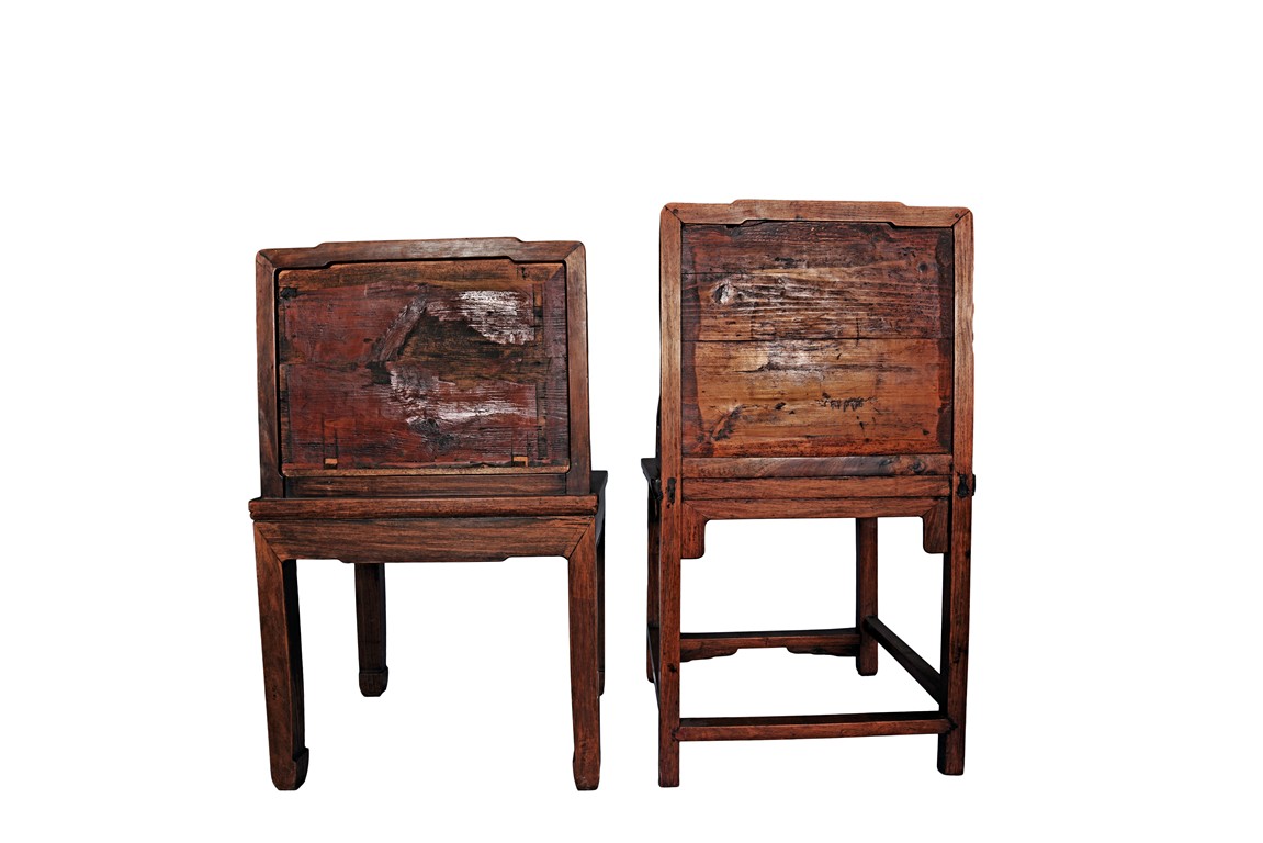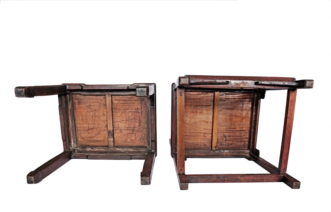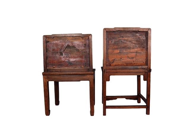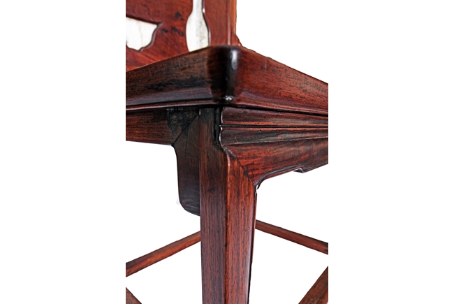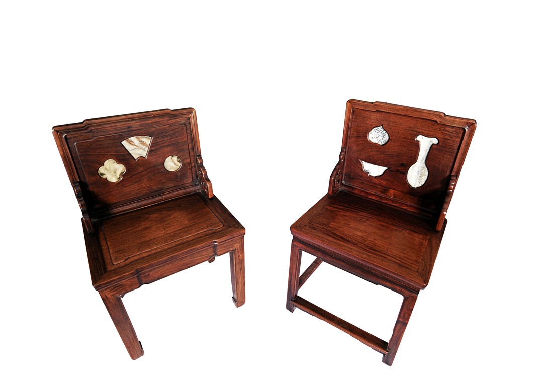 Each backrest inlaid with three shaped marble panels, the panelled seat above beaded apron, one supported by square legs terminating in hoof feet, the other supported by four square feet joined by stepped stretchers. Qing Dynasty period.