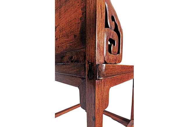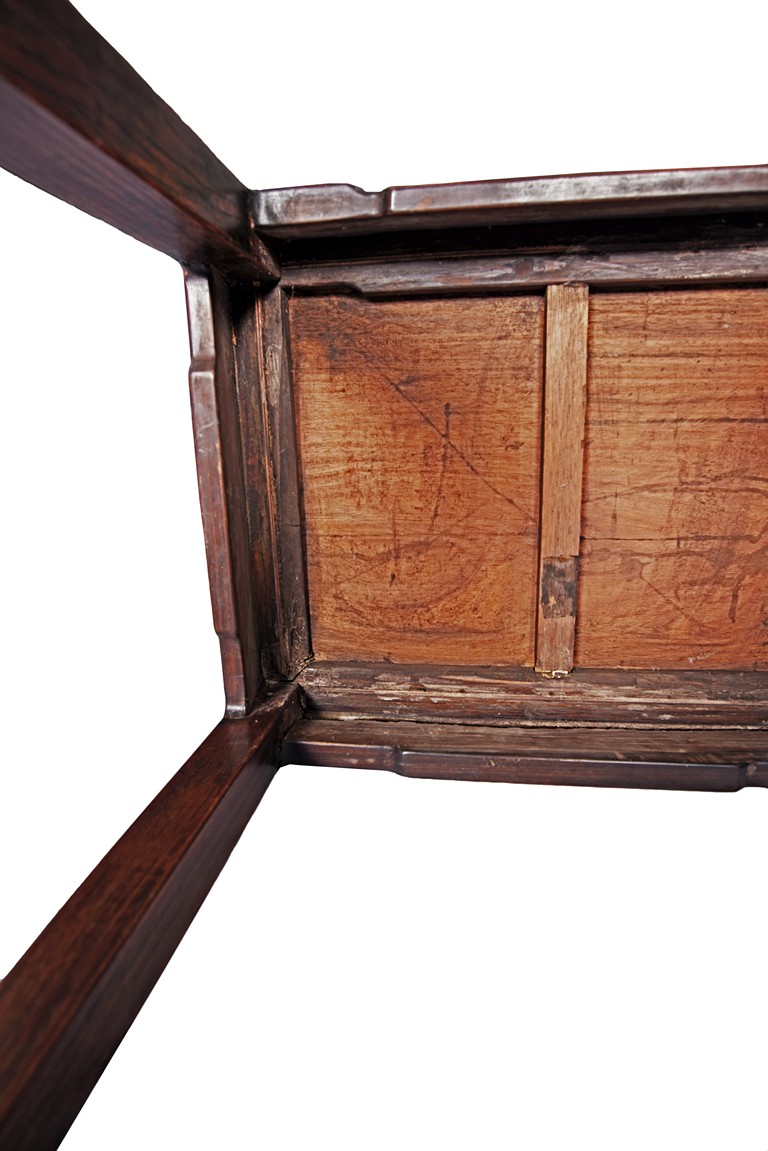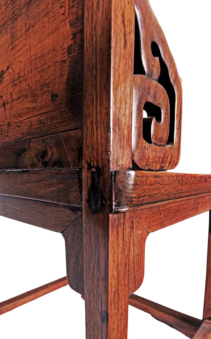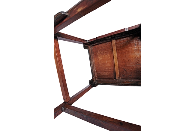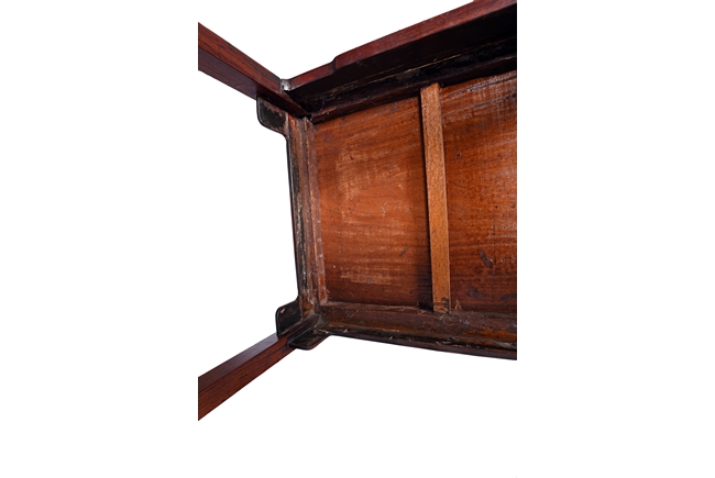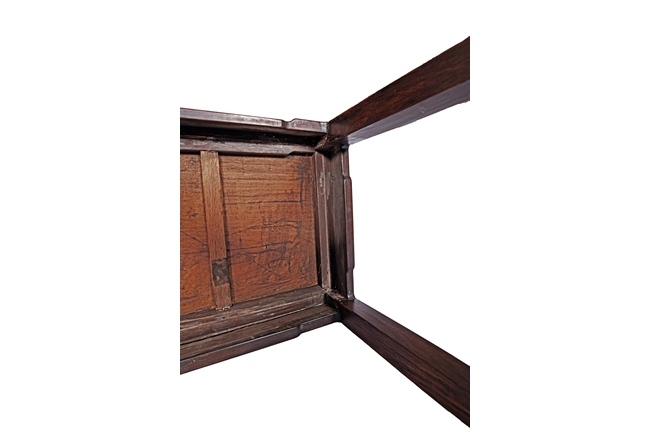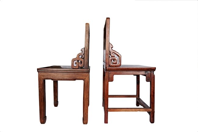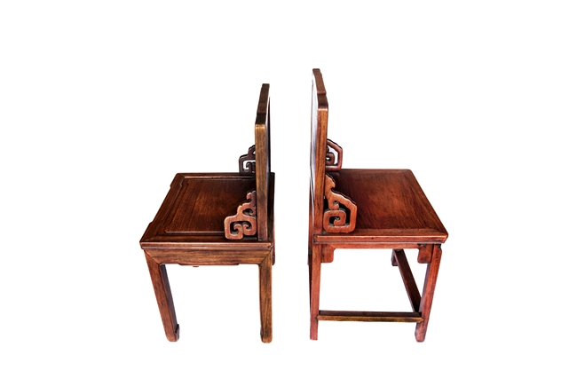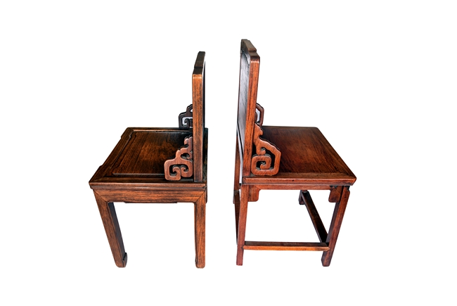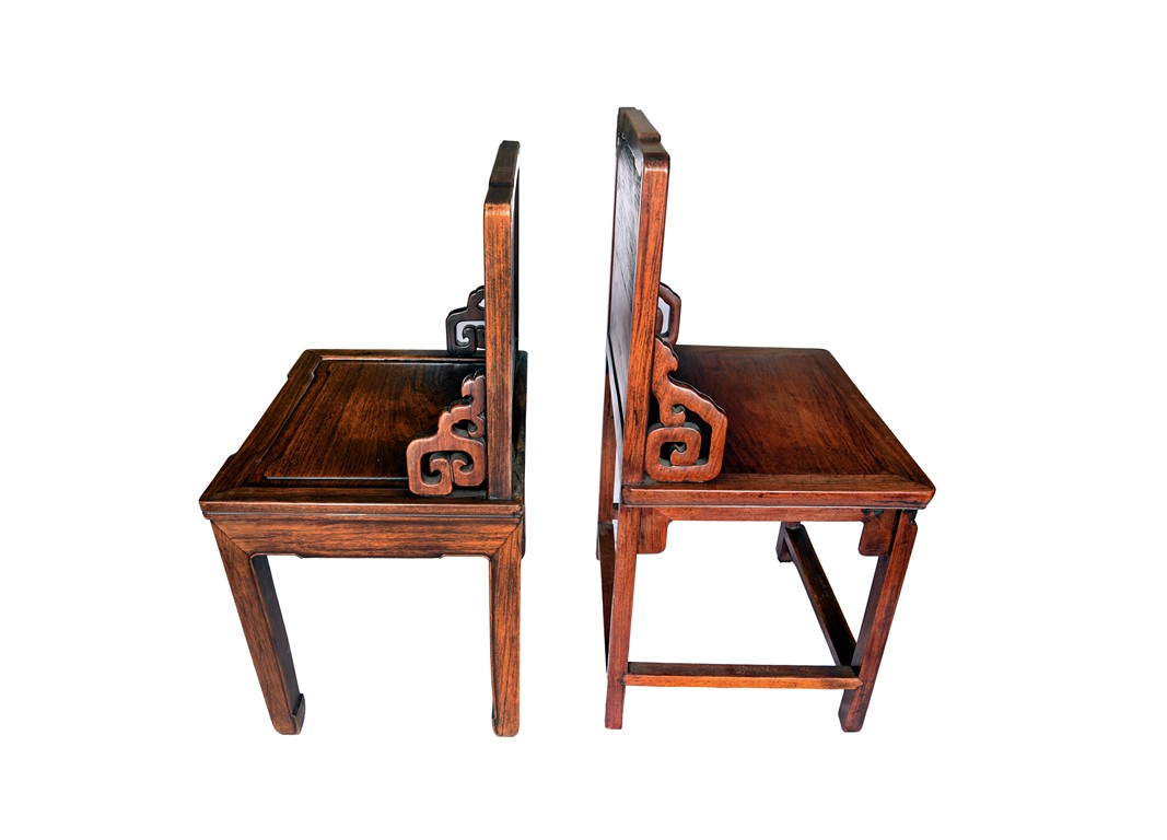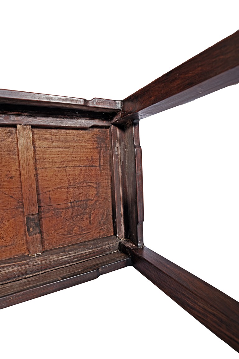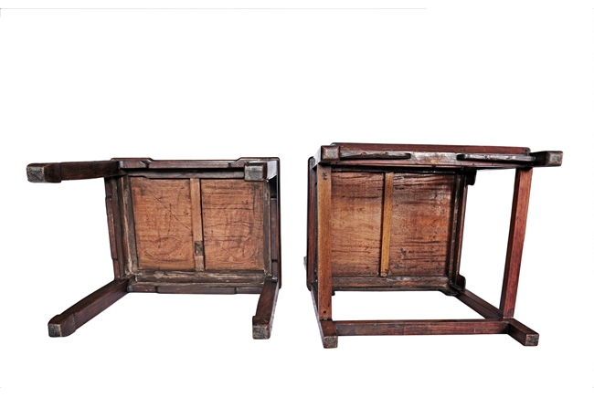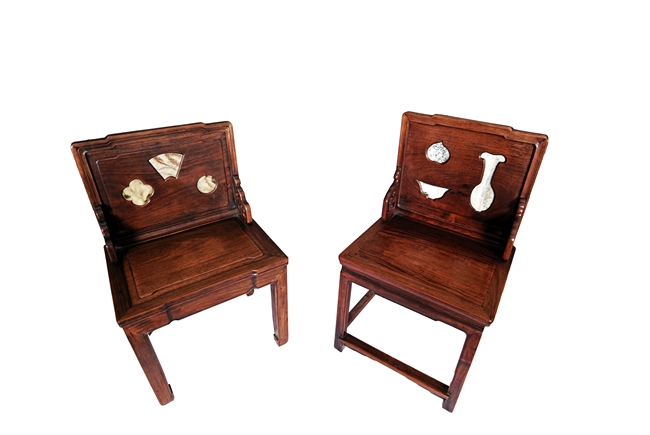 Each backrest inlaid with three shaped marble panels, the panelled seat above beaded apron, one supported by square legs terminating in hoof feet, the other supported by four square feet joined by stepped stretchers. Qing Dynasty period.
